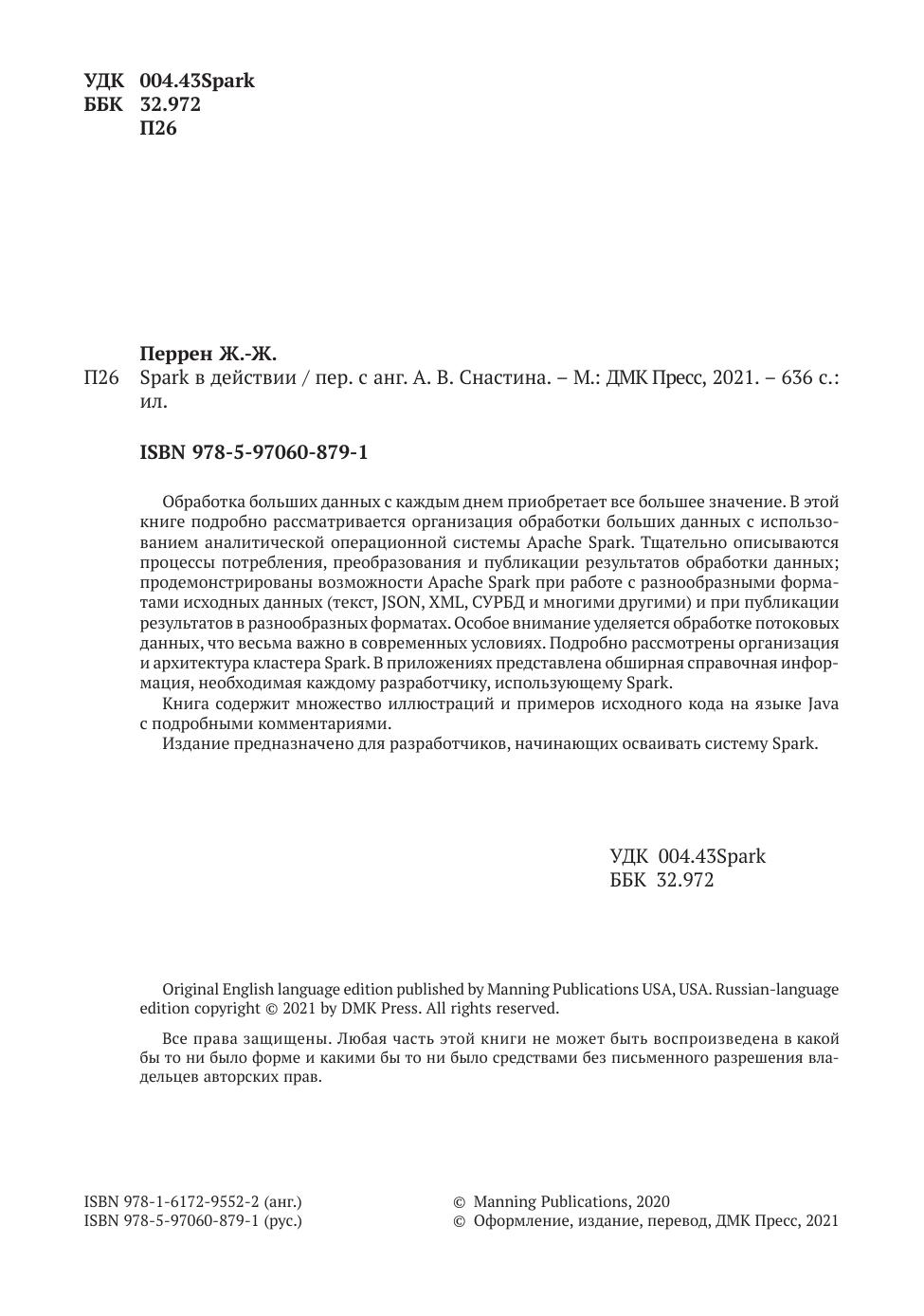Анализ корпоративных данных начинается с чтения, фильтрации и объединения файлов и потоков из многих источников. Механизм обработки данных Spark способен обрабатывать эти разнообразные объемы информации как признанный лидер в этой области, обеспечивая в 100 раз большую скорость, чем например Hadoop. Благодаря поддержке SQL, интуитивно понятному интерфейсу и простому и ясному многоязыковому API вы можете использовать Spark без глубокого изучения новой сложной экосистемы. Эта книга научит вас создавать полноценные и завершенные аналитические приложения. В качестве примера используется полный конвейер обработки данных, поступающих со спутников NASA.