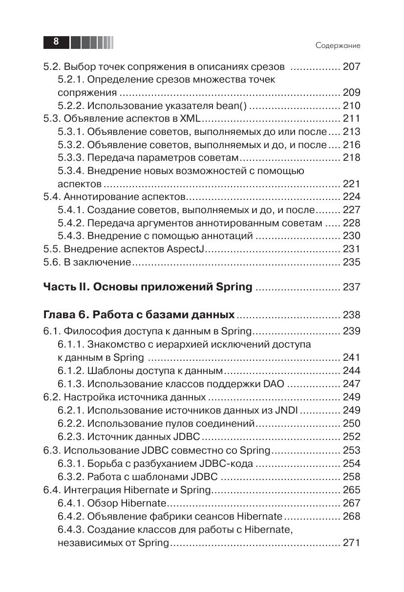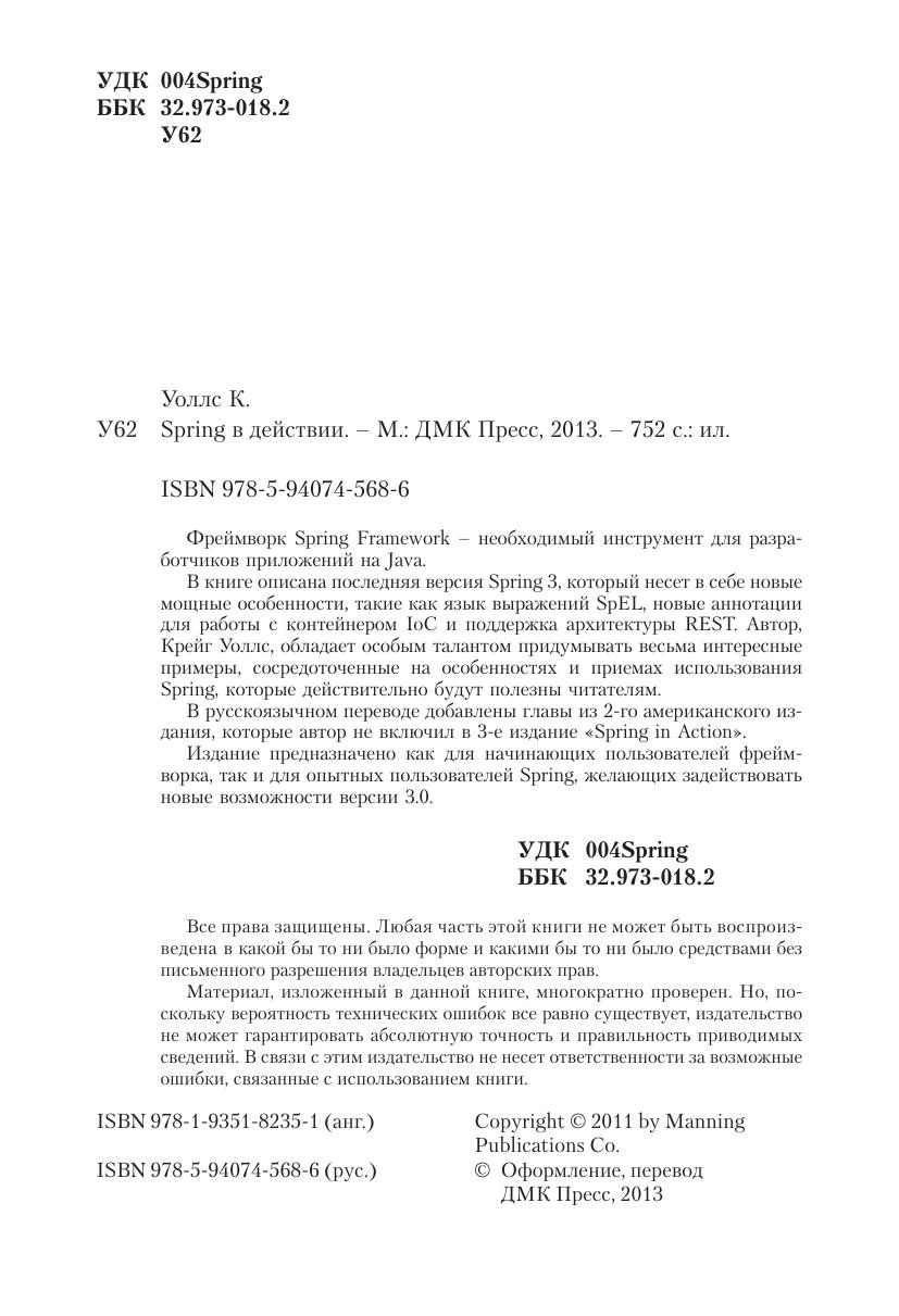 Фреймворк Spring Framework – необходимый инструмент для разработчиков приложений на Java. В книге описана последняя версия Spring 3, который несет в себе новые мощные особенности, такие как язык выражений SpEL, новые аннотации для работы с контейнером IoC и поддержка архитектуры REST. Автор, Крейг Уоллс, обладает особым талантом придумывать весьма интересные примеры, сосредоточенные на особенностях и приемах использования Spring, которые действительно будут полезны читателям. В русскоязычном переводе добавлены главы из 2-го американского издания, которые автор не включил в 3-е издание «Spring in Action». Издание предназначено как для начинающих пользователей фреймворка, так и для опытных пользователей Spring, желающих задействовать новые возможности версии 3.0.