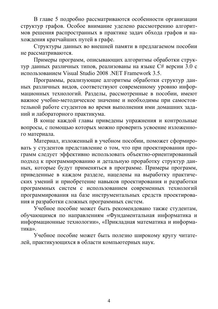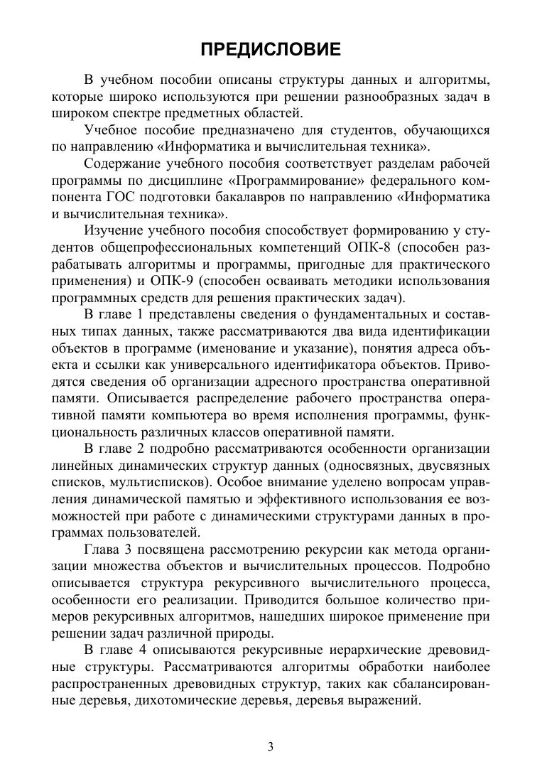 Учебное пособие включает разделы, которые подробно описывают абстрагирование типов, идентификацию объектов, классы оперативной памяти, линейные динамические структуры данных (односвязные, двусвязные списки, мультисписки), рекурсивные алгоритмы обработки структур данных, иерархические структуры данных (деревья и графы). Теоретический материал иллюстрируется большим количеством программных фрагментов, реализующих алгоритмы обработки различных структур данных. Учебное пособие содержит контрольные вопросы и упражнения по всем разделам. Соответствует современным требованиям Федерального государственного образовательного стандарта среднего профессионального образования и профессиональным квалификационным требованиям. Предназначено для студентов среднего профессионального образования, обучающихся по специальностям, входящих в укрупненную группу специальностей «Информатика и вычислительная техника».