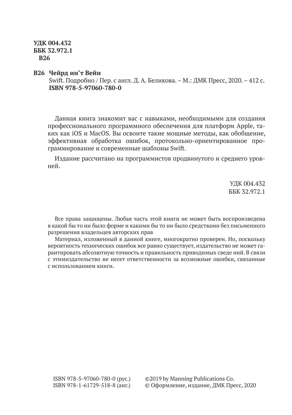 Следуя многочисленным конкретным примерам, поучительным объяснениям и увлекательным упражнениям, в конечном итоге вы освоите такие мощные методы, как обобщения, эффективная обработка ошибок, протокольно-ориентированное программирование и современные шаблоны Swift.