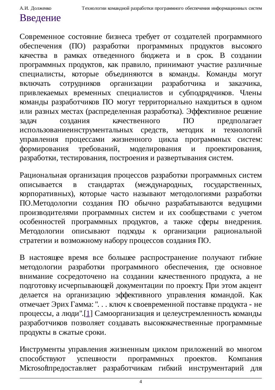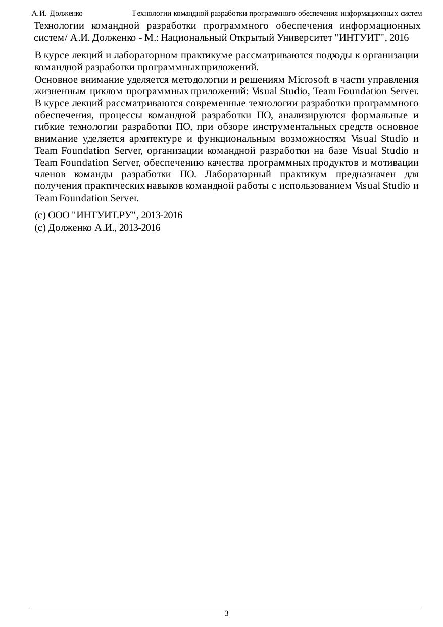 В курсе лекций и лабораторном практикуме рассматриваются подходы к организации командной разработки программных приложений. Основное внимание уделяется методологии и решениям Microsoft в части управления жизненным циклом программных приложений: Visual Studio, Team Foundation Server. В курсе лекций рассматриваются современные технологии разработки программного обеспечения, процессы командной разработки ПО, анализируются формальные и гибкие технологии разработки ПО, при обзоре инструментальных средств основное внимание уделяется архитектуре и функциональным возможностям Visual Studio и Team Foundation Server, организации командной разработки на базе Visual Studio и Team Foundation Server, обеспечению качества программных продуктов и мотивации членов команды разработки ПО. Лабораторный практикум предназначен для получения практических навыков командной работы с использованием Visual Studio и Team Foundation Server.