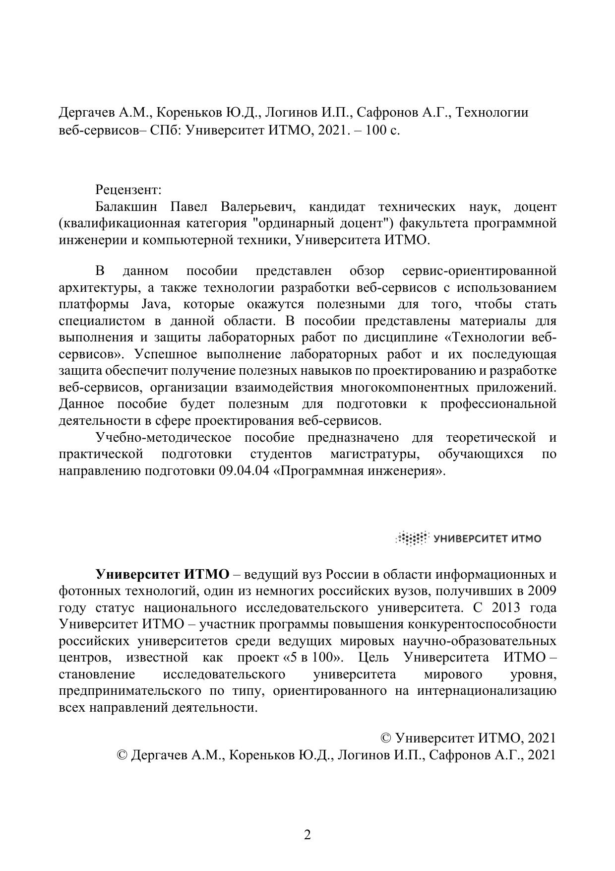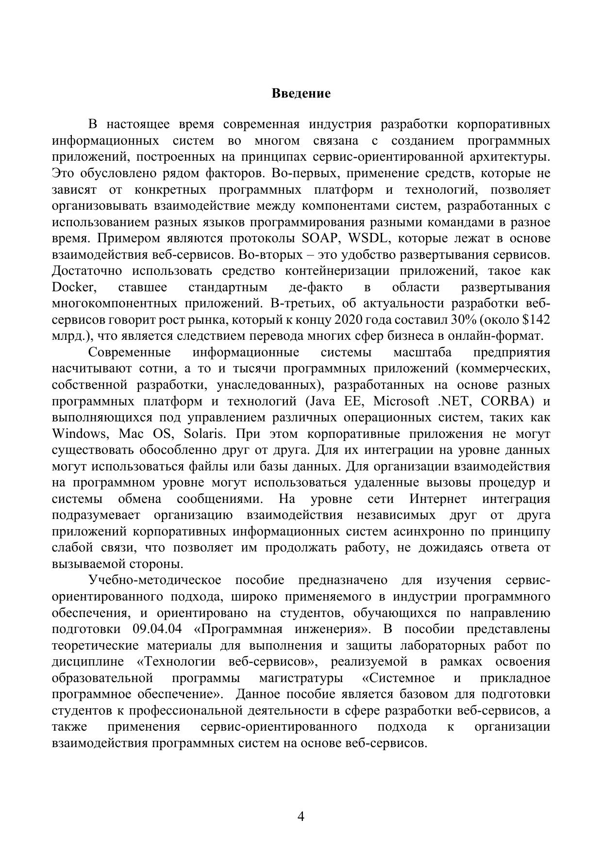 В данном пособии представлен обзор сервис-ориентированной архитектуры, а также технологии разработки веб-сервисов с использованием платформы Java, которые окажутся полезными для того, чтобы стать специалистом в данной области. В пособии представлены материалы для выполнения и защиты лабораторных работ по дисциплине «Технологии веб-сервисов». Успешное выполнение лабораторных работ и их последующая защита обеспечит получение полезных навыков по проектированию и разработке веб-сервисов, организации взаимодействия многокомпонентных приложений. Данное пособие будет полезным для подготовки к профессиональной деятельности в сфере проектирования веб-сервисов. Учебно-методическое пособие предназначено для теоретической и практической подготовки студентов магистратуры, обучающихся по направлению подготовки 09.04.04 «Программная инженерия».