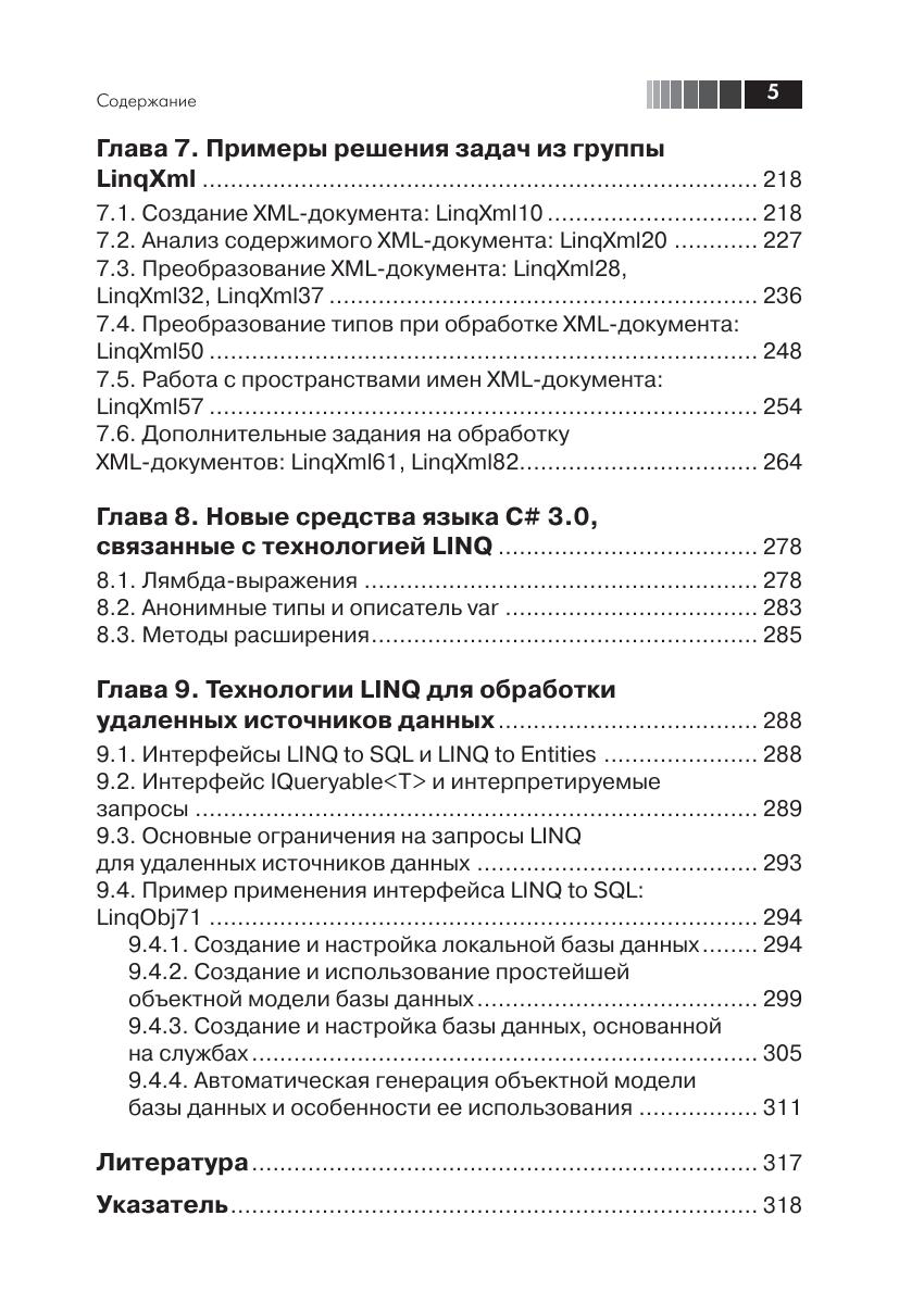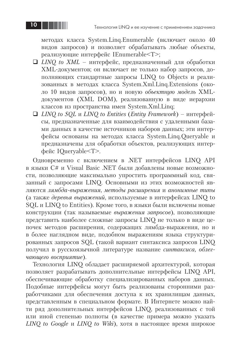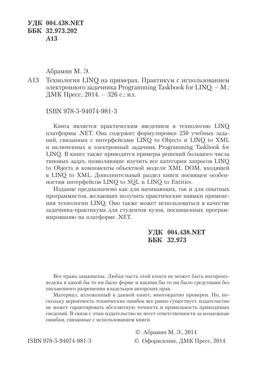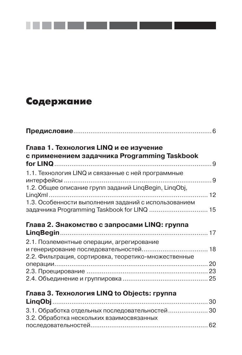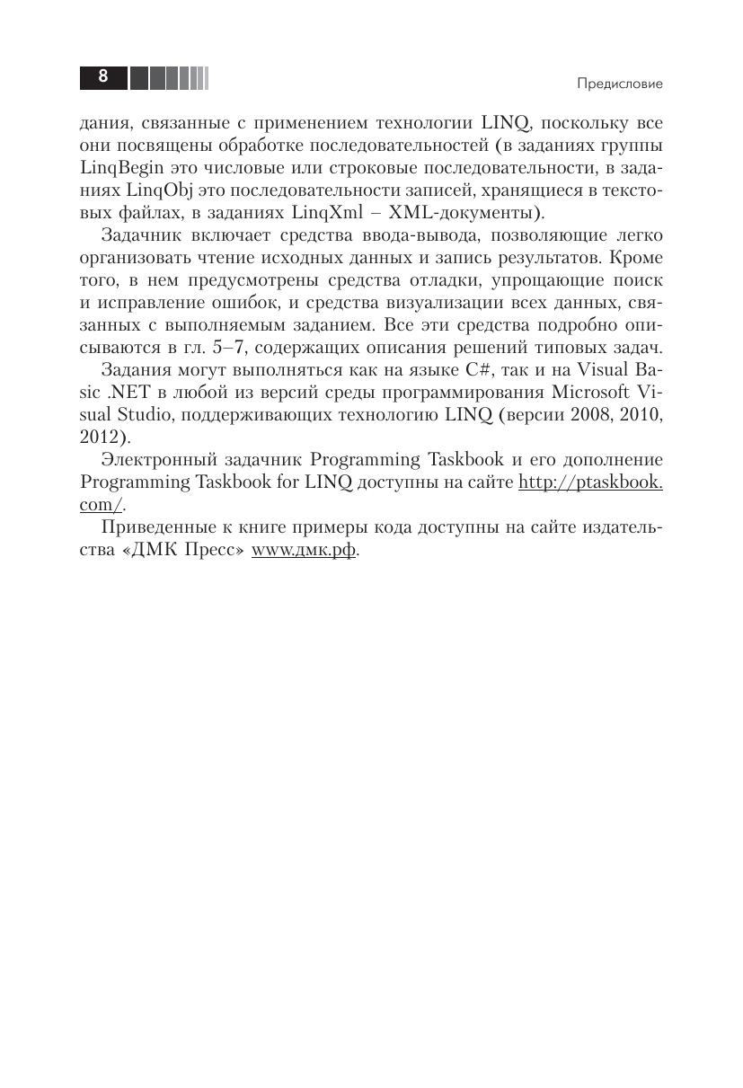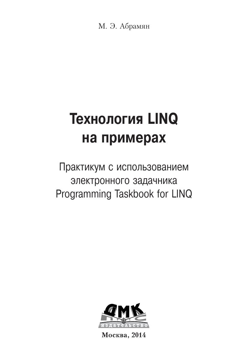 Книга является практическим введением в технологию LINQ платформы .NET. Она содержит формулировки 250 учебных заданий, связанных с интерфейсами LINQ to Objects и LINQ to XML и включенных в электронный задачник Programming Taskbook for LINQ. В книге также приводятся примеры решений большого числа типовых задач, позволяющие изучить все категории запросов LINQ to Objects и компоненты объектной модели XML DOM, входящей в LINQ to XML. Дополнительный раздел книги посвящен особенностям интерфейсов LINQ to SQL и LINQ to Entities. Издание предназначено как для начинающих, так и для опытных программистов, желающих получить практические навыки применения технологии LINQ. Оно также может использоваться в качестве задачника-практикума для студентов вузов, посвященных программированию на платформе .NET.
