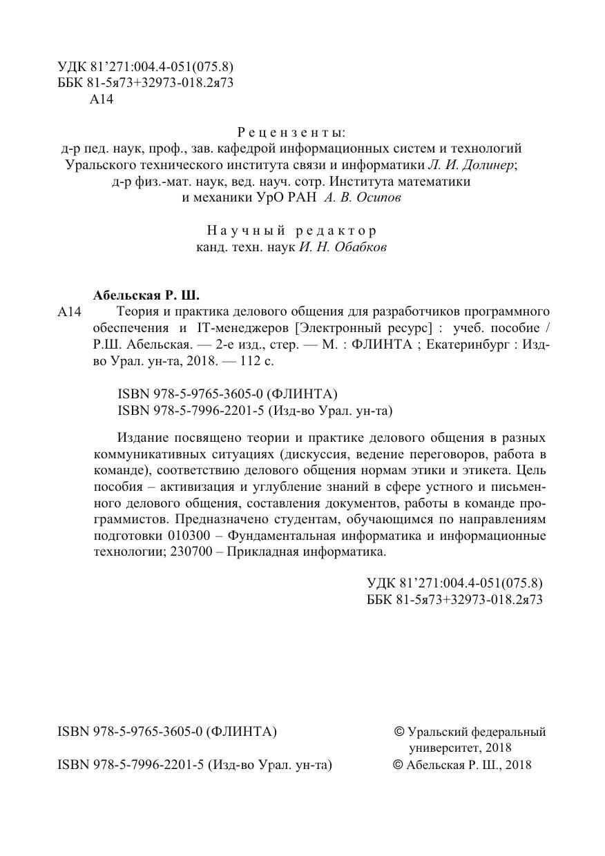 Издание посвящено теории и практике делового общения в разных коммуникативных ситуациях (дискуссия, ведение переговоров, работа в команде), соответствию делового общения нормам этики и этикета. Цель пособия – активизация и углубление знаний в сфере устного и письменного делового общения, составления документов, работы в команде программистов. Предназначено студентам, обучающимся по направлениям подготовки 010300 – Фундаментальная информатика и информационные технологии; 230700 – Прикладная информатика.