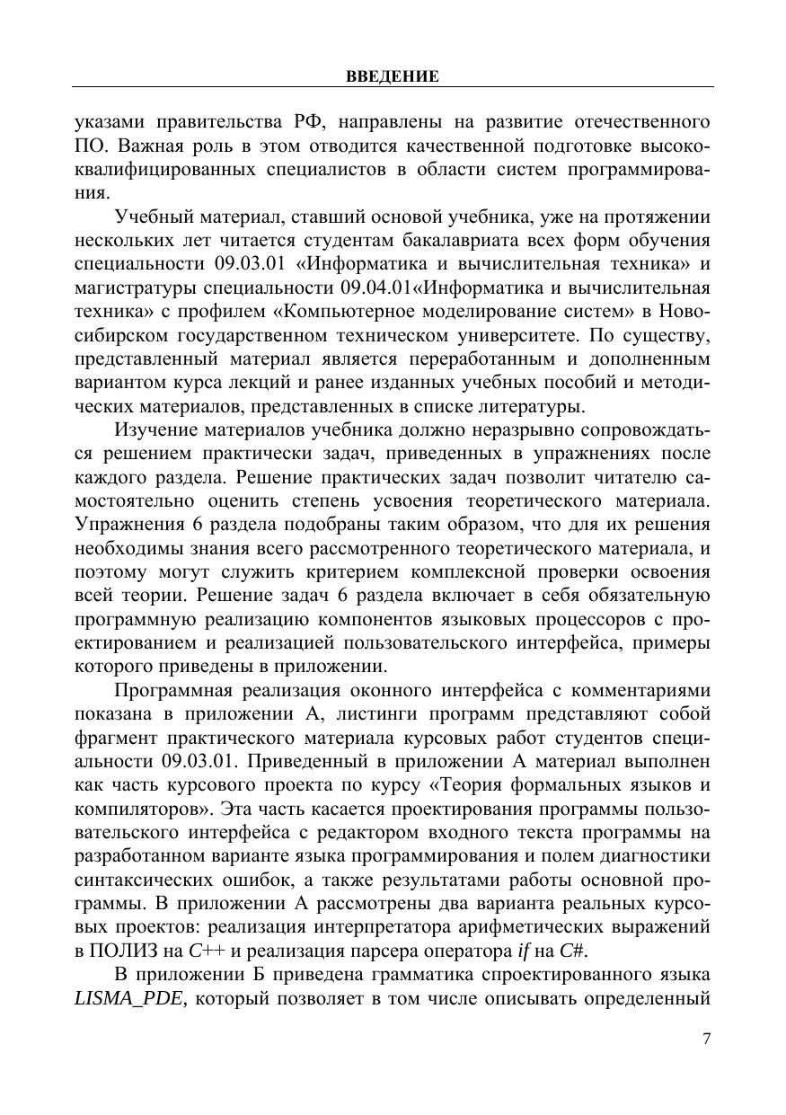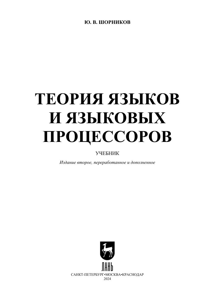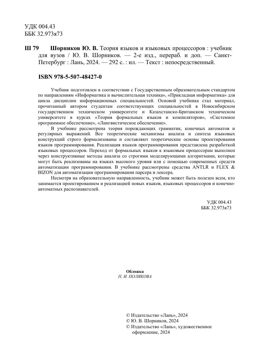 Учебник подготовлен в соответствии с Государственным образовательным стандартом по направлениям «Информатика и вычислительная техника», «Прикладная информатика» для цикла дисциплин информационных специальностей. Основой учебника стал материал, прочитанный автором студентам соответствующих специальностей в Новосибирском государственном техническом университете и Казахстанско-Британском техническом университете в курсах «Теория формальных языков и компиляторов», «Системное программное обеспечение», «Лингвистическое обеспечение». В учебнике рассмотрена теория порождающих грамматик, конечных автоматов и регулярных выражений. Все теоретические механизмы анализа и синтеза языковых конструкций строго формализованы и составляют теоретические основы проектирования языков программирования. Реализация языков программирования представлена разработкой языковых процессоров. Переход от формальных языков к языковым процессорам выполнен через конструктивные методы анализа со строгими моделирующими алгоритмами, которые могут быть реализованы на языках высокого уровня или с помощью современных средств автоматизации программирования. В учебнике рассмотрены средства ANTLR и FLEX & BIZON для автоматизации программирования парсера и лексера. Несмотря на образовательную направленность, учебник может быть полезен всем, кто занимается проектированием и реализацией новых языков, языковых процессоров и конечно-автоматных распознавателей.