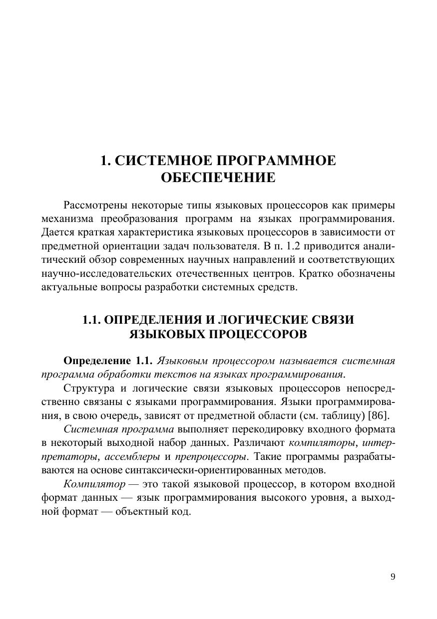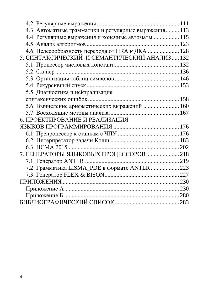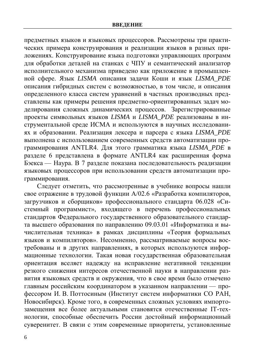 Учебник подготовлен в соответствии с Государственным образовательным стандартом по направлениям «Информатика и вычислительная техника», «Прикладная информатика» для цикла дисциплин информационных специальностей. Основой учебника стал материал, прочитанный автором студентам соответствующих специальностей в Новосибирском государственном техническом университете и Казахстанско-Британском техническом университете в курсах «Теория формальных языков и компиляторов», «Системное программное обеспечение», «Лингвистическое обеспечение». В учебнике рассмотрена теория порождающих грамматик, конечных автоматов и регулярных выражений. Все теоретические механизмы анализа и синтеза языковых конструкций строго формализованы и составляют теоретические основы проектирования языков программирования. Реализация языков программирования представлена разработкой языковых процессоров. Переход от формальных языков к языковым процессорам выполнен через конструктивные методы анализа со строгими моделирующими алгоритмами, которые могут быть реализованы на языках высокого уровня или с помощью современных средств автоматизации программирования. В учебнике рассмотрены средства ANTLR и FLEX & BIZON для автоматизации программирования парсера и лексера. Несмотря на образовательную направленность, учебник может быть полезен всем, кто занимается проектированием и реализацией новых языков, языковых процессоров и конечно-автоматных распознавателей.