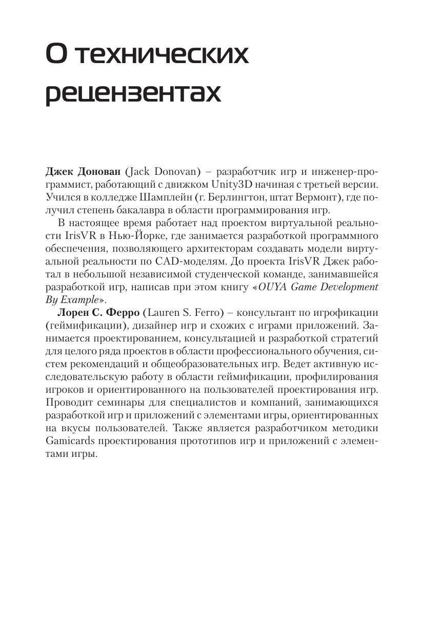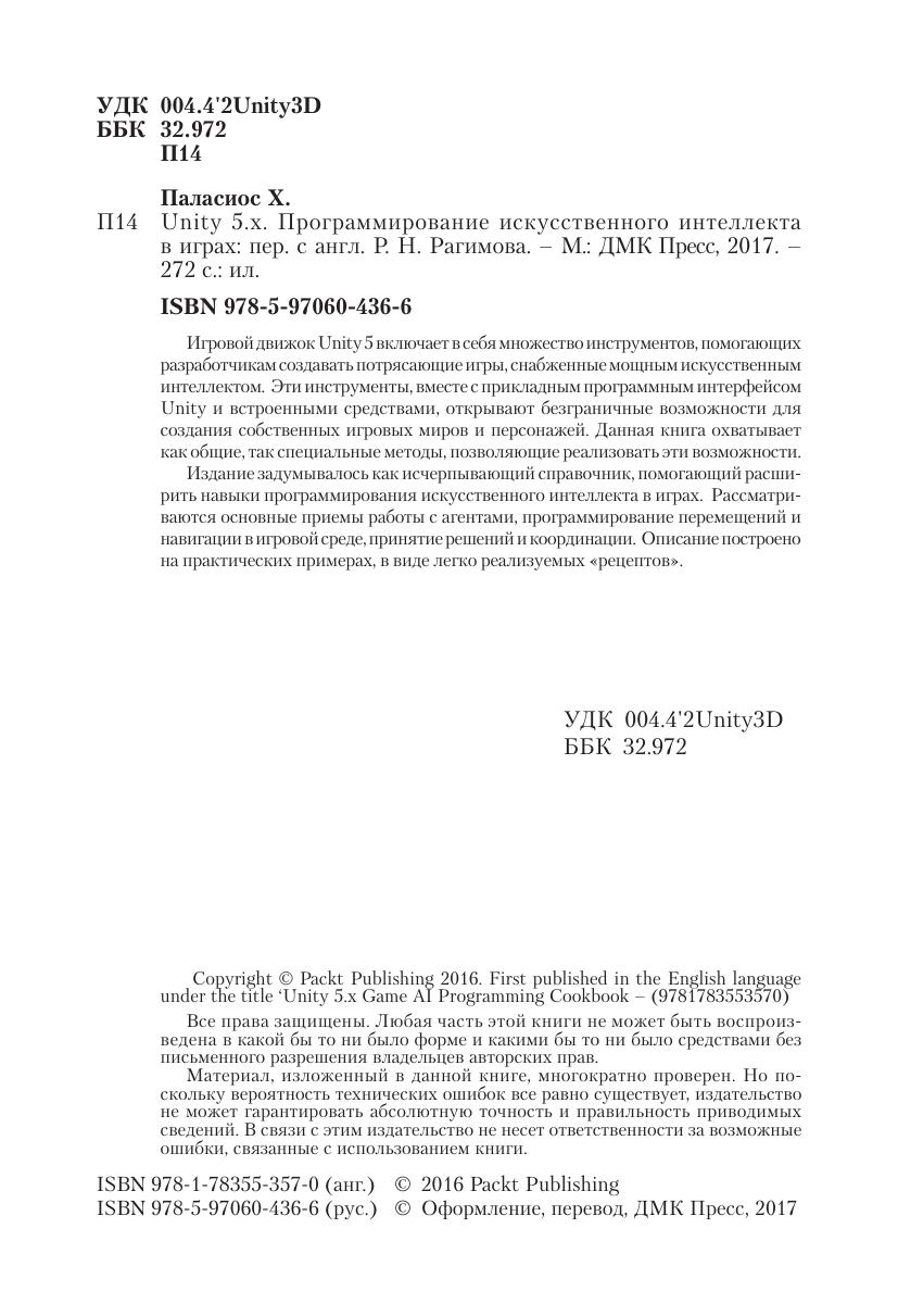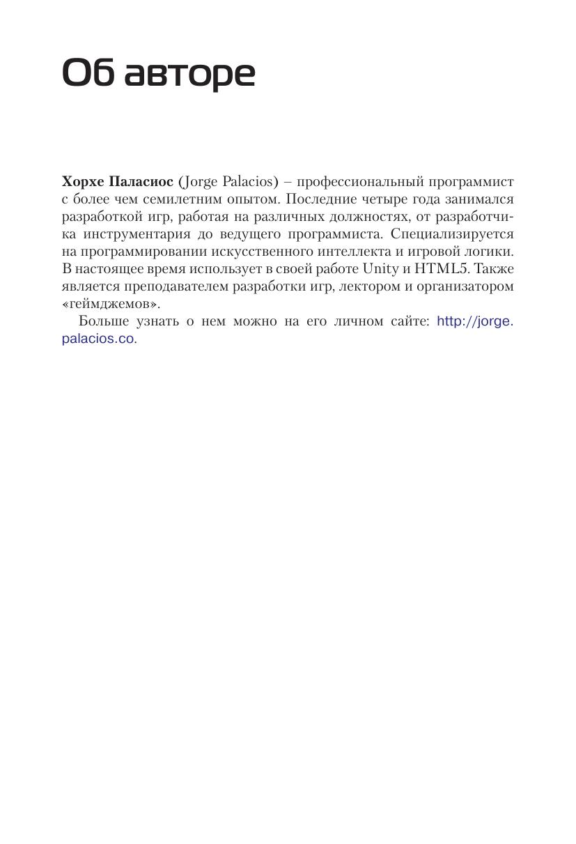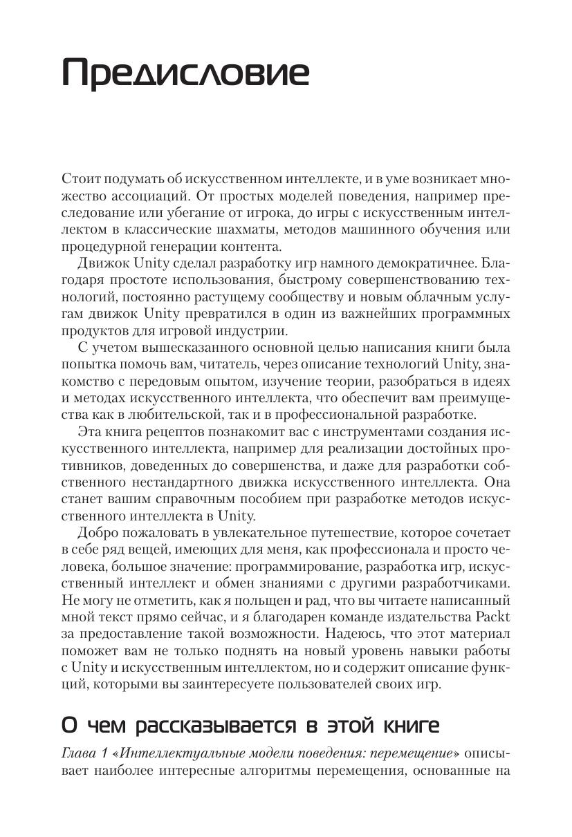 Игровой движок Unity 5 включает в себя множество инструментов, помогающих разработчикам создавать потрясающие игры, снабженные мощным искусственным интеллектом. Эти инструменты, вместе с прикладным программным интерфейсом Unity и встроенными средствами, открывают безграничные возможности для создания собственных игровых миров и персонажей. Данная книга охватывает как общие, так специальные методы, позволяющие реализовать эти возможности. Издание задумывалось как исчерпывающий справочник, помогающий расширить навыки программирования искусственного интеллекта в играх. Рассматриваются основные приемы работы с агентами, программирование перемещений и навигации в игровой среде, принятие решений и координации. Описание построено на практических примерах, в виде легко реализуемых «рецептов».