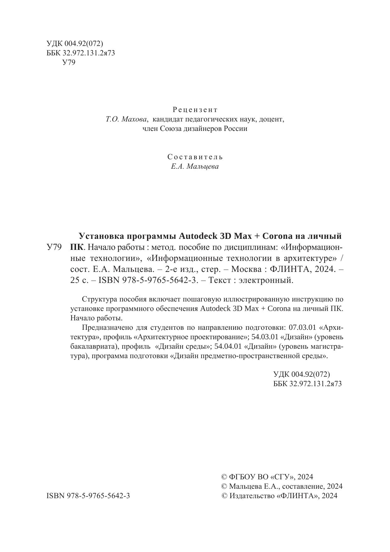 Структура пособия включает пошаговую иллюстрированную инструкцию по установке программного обеспечения Autodeck 3D Max + Corona на личный ПК. Начало работы. Предназначено для студентов по направлению подготовки: 07.03.01 «Архитектура», профиль «Архитектурное проектирование»; 54.03.01 «Дизайн», профиль «Дизайн среды»; 54.04.01 «Дизайн», программа подготовки «Дизайн предметно-пространственной среды».