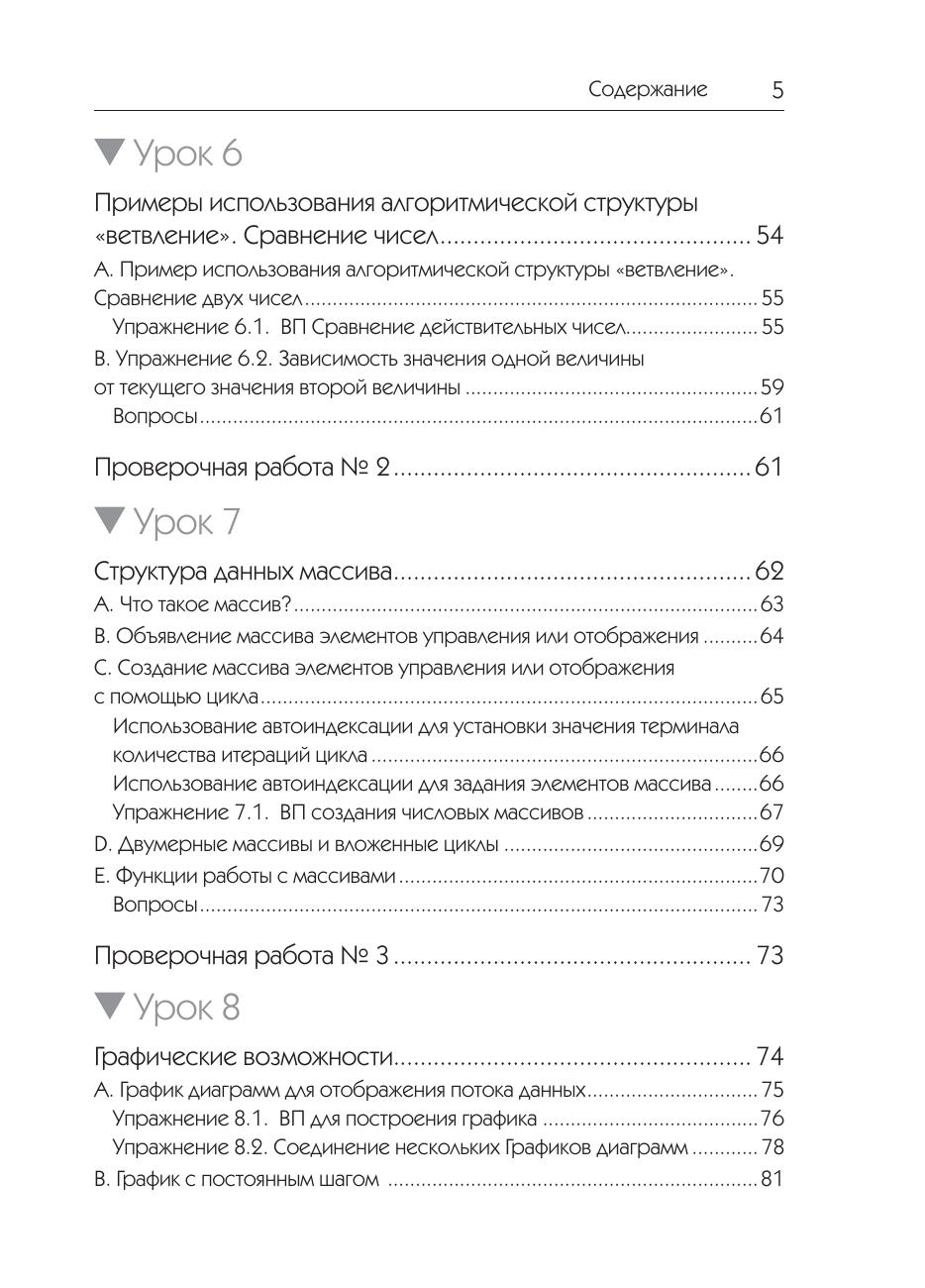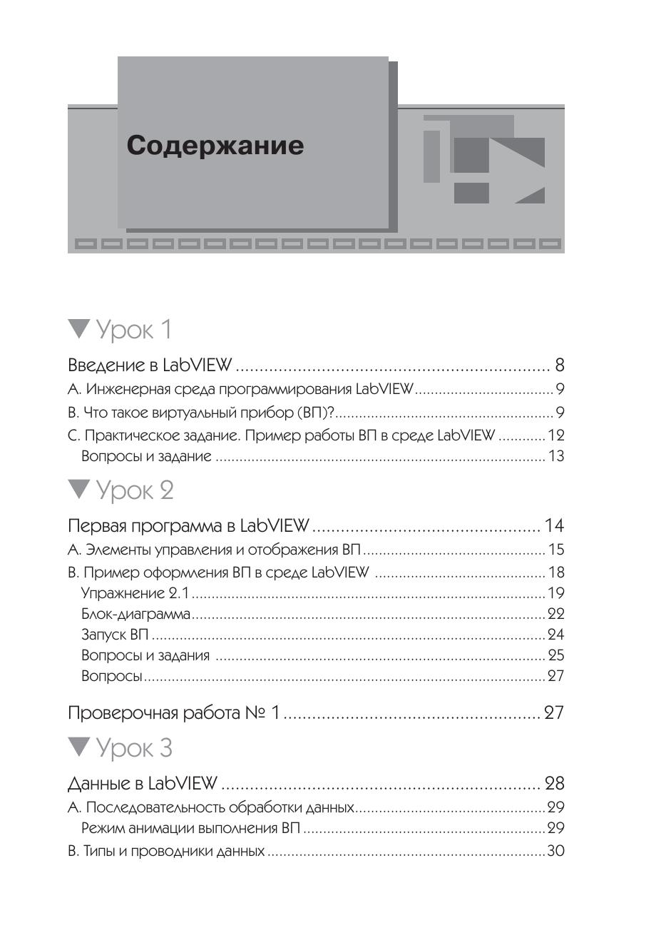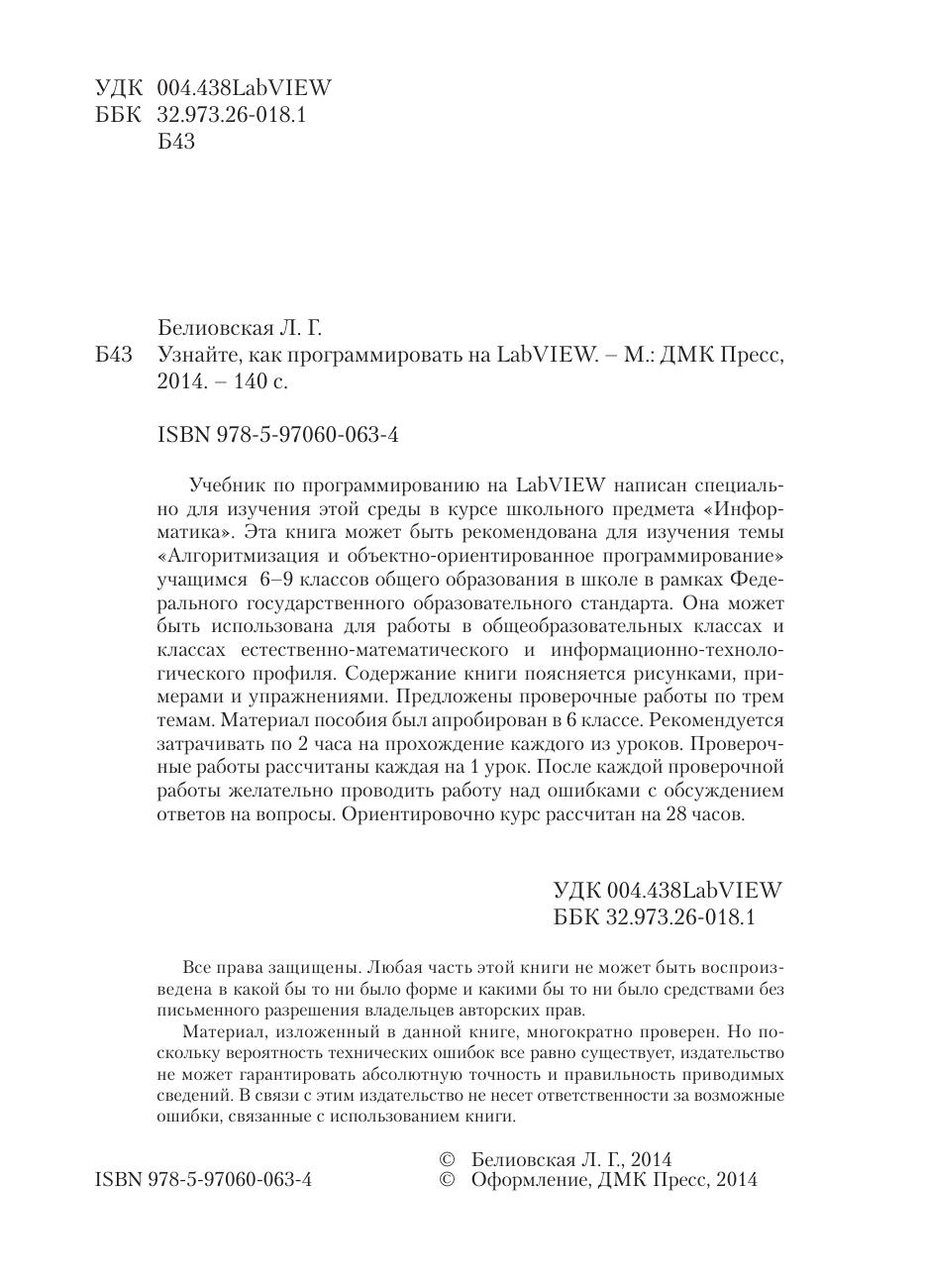 Учебник по программированию на LabVIEW написан специально для изучения этой среды в курсе школьного предмета «Информатика». Эта книга может быть рекомендована для изучения темы «Алгоритмизация и объектно-ориентированное программирование» учащимся 6–9 классов общего образования в школе в рамках Федерального государственного образовательного стандарта. Она может быть использована для работы в общеобразовательных классах и классах естественно математического и информационно-технологического профиля. Содержание книги поясняется рисунками, примерами и упражнениями. Предложены проверочные работы по трем темам. Материал пособия был апробирован в 6 классе. Рекомендуется затрачивать по 2 часа на прохождение каждого из уроков. Проверочные работы рассчитаны каждая на 1 урок. После каждой проверочной работы желательно проводить работу над ошибками с обсуждением ответов на вопросы. Ориентировочно курс рассчитан на 28 часов.