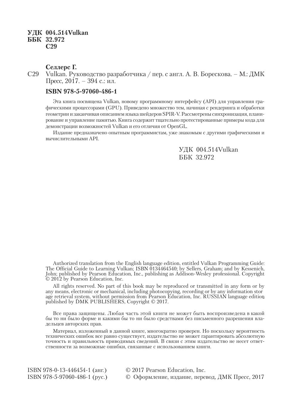 Эта книга посвящена Vulkan, новому программному интерфейсу (API) для управления графическими процессорами (GPU). Приведено множество тем, начиная с рендеринга и обработки геометрии и заканчивая описанием языка шейдеров SPIR-V. Рассмотрены синхронизация, планирование и управление памятью. Книга содержит тщательно протестированные примеры кода для демонстрации возможностей Vulkan и его отличия от OpenGL.