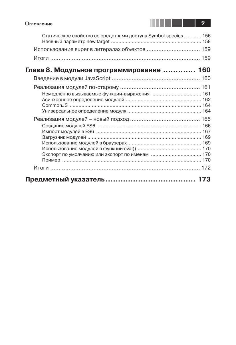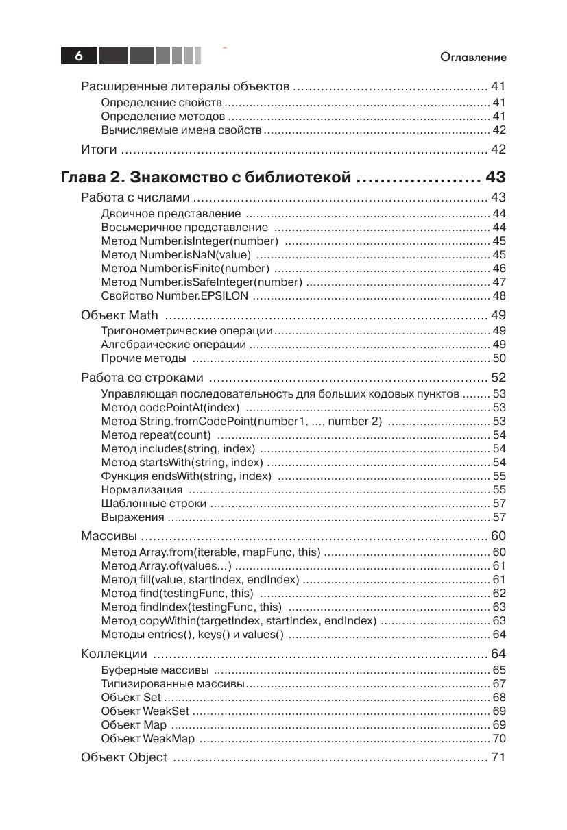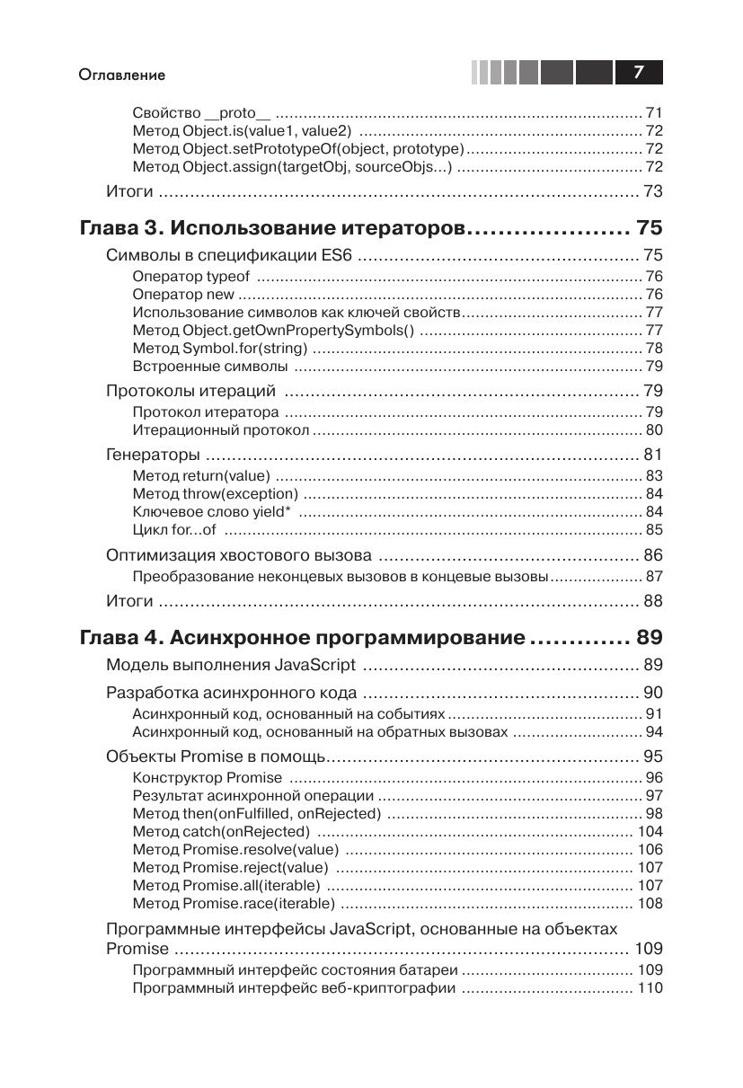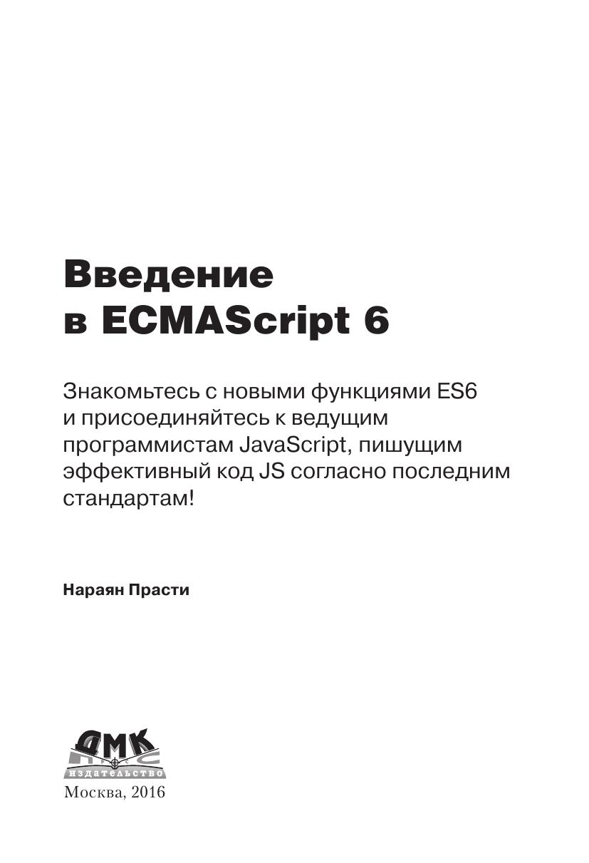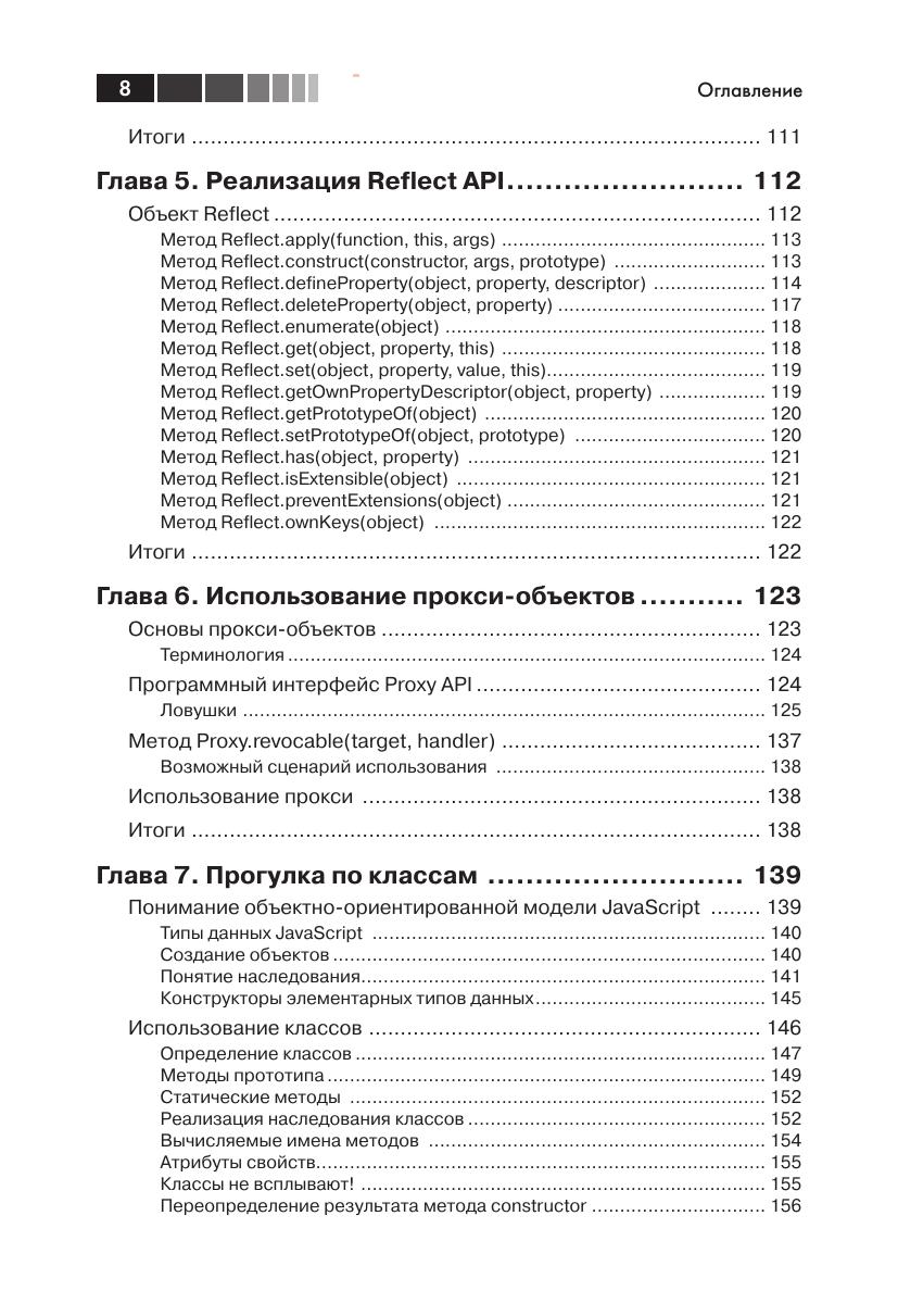 Данная книга содержит пошаговые инструкции по использованию новых возможностей EСMAScript 6 вместо устаревших трюков и приемов программирования на JavaScript. Книга начинается с знакомства со всеми встроенными объектами ES6 и описания создания итераторов ES6. Затем она расскажет, как писать асинхронный код с помощью ES6 в обычном стиле синхронного кода. Далее описывается использование программного интерфейса рефлексии Reflect API для исследования и изменения свойств объектов. Затем рассматривается создание прокси-объектов и их применение для перехвата и изменения поведения операций с объектами. Наконец, демонстрируются устаревшие методы модульного программирования, такие как IIFE, CommonJS, AMD и UMD, и сравниваются с модулями ES6, способными значительно увеличить производительность веб-сайтов. Издание предназначено для программистов на JavaScript, обладающих базовыми навыками разработки, и желающим освоить новейшие возможности EСMAScript 6 для совершенствования своих программ, выполняемых на стороне клиента.