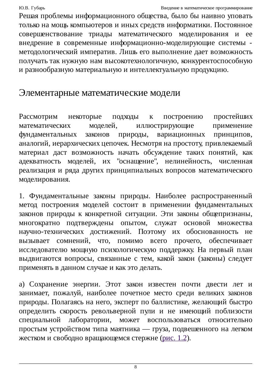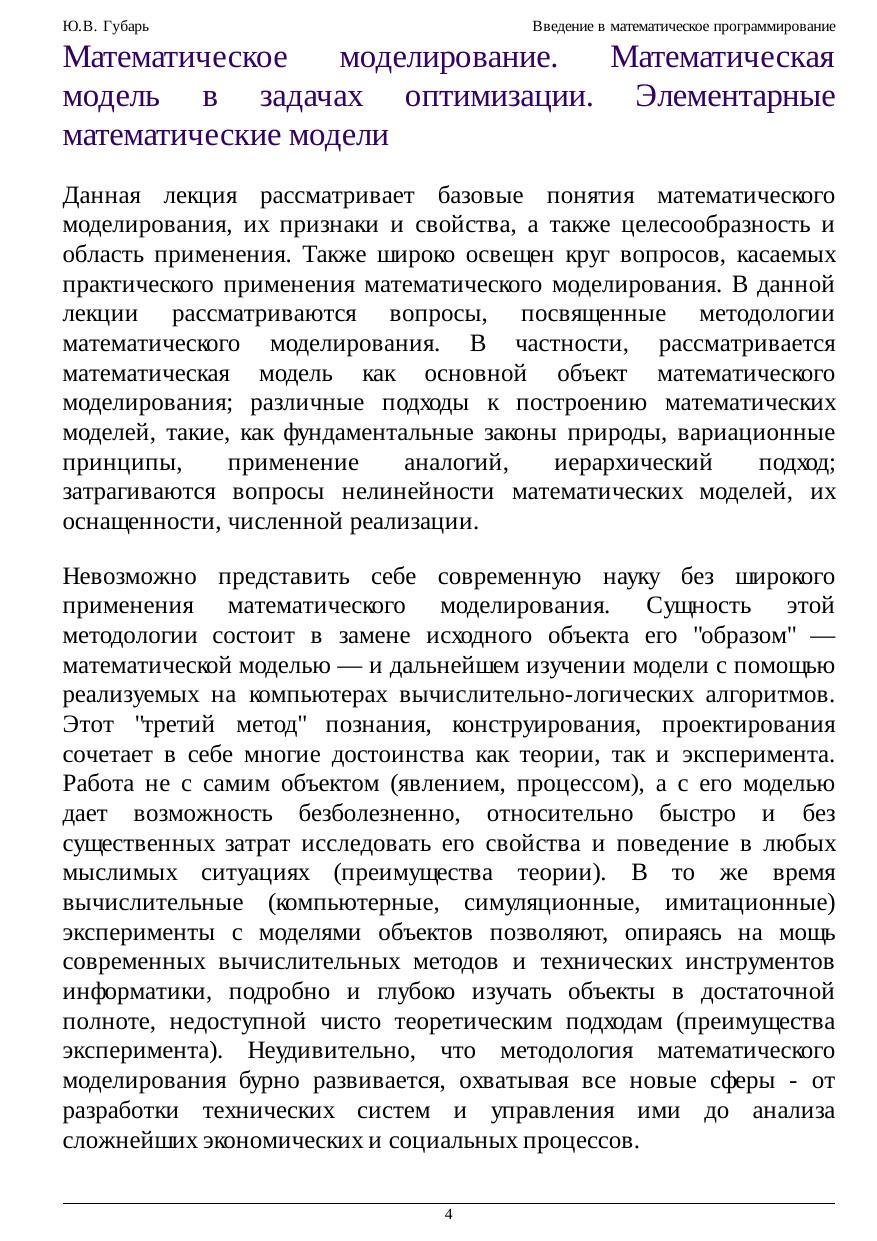 виды задач линейного и нелинейного программирования, приводятся наиболее распространённые методы решения данных задач. В курсе рассмотрены вопросы, связанные с математическим моделированием, с формой и принципом представления математических моделей, особенностями её построения; в частности, предложены такие подходы, как фундаментальные законы природы, вариационные принципы, применение аналогий, иерархический подход; затронуты вопросы оснащённости и численной реализации математических моделей.