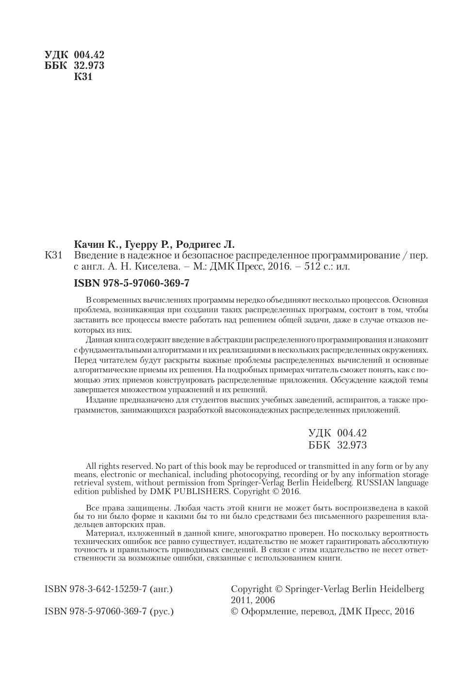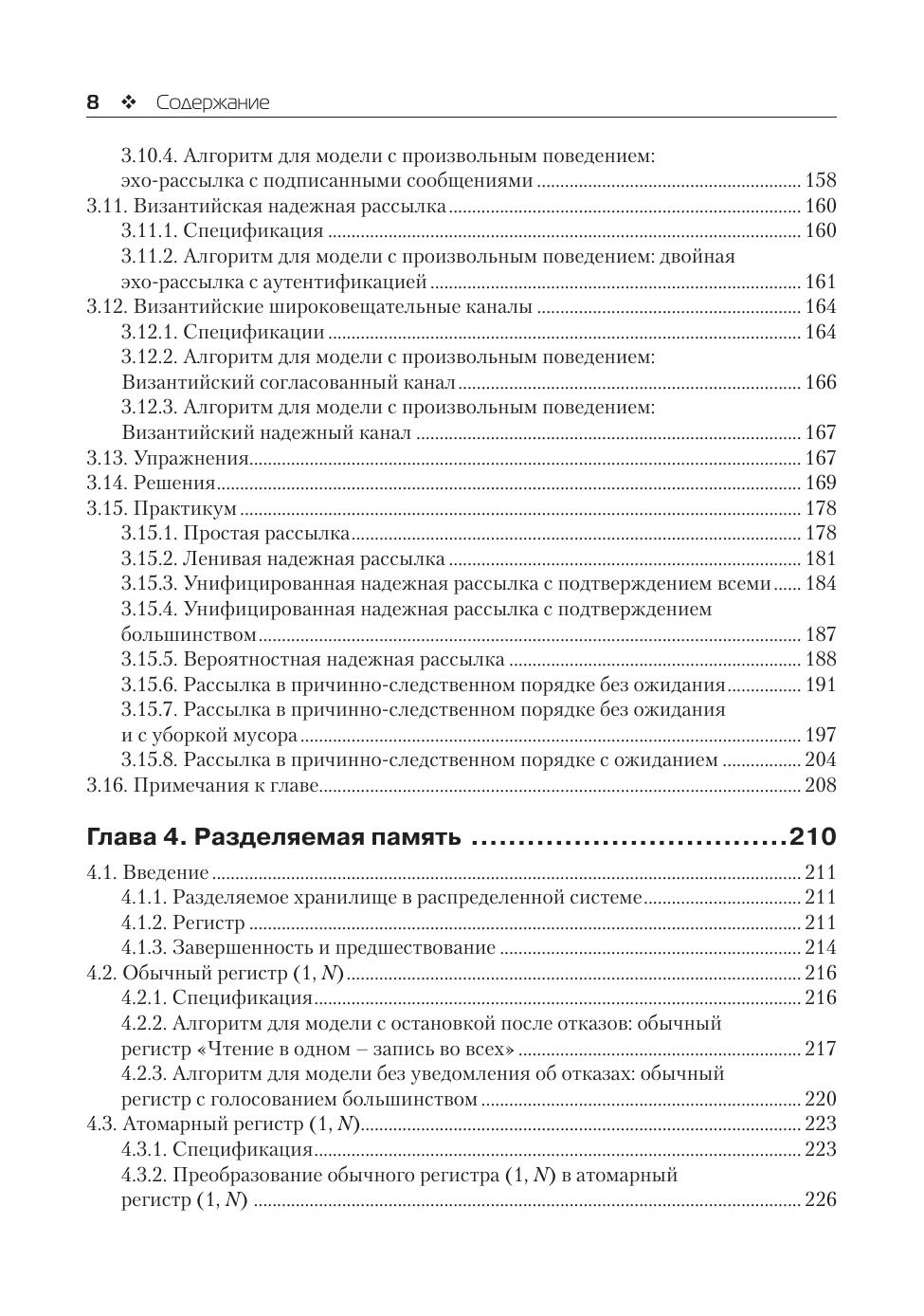 В современных вычислениях программы нередко объединяют несколько процессов. Основная проблема, возникающая при создании таких распределенных программ, состоит в том, чтобы заставить все процессы вместе работать над решением общей задачи, даже в случае отказов некоторых из них. Данная книга содержит введение в абстракции распределенного программирования и знакомит с фундаментальными алгоритмами и их реализациями в нескольких распределенных окружениях. Перед читателем будут раскрыты важные проблемы распределенных вычислений и основные алгоритмические приемы их решения. На подробных примерах читатель сможет понять, как с помощью этих приемов конструировать распределенные приложения. Обсуждение каждой темы завершается множеством упражнений и их решений. Издание предназначено для студентов высших учебных заведений, аспирантов, а также программистов, занимающихся разработкой высоконадежных распределенных приложений.