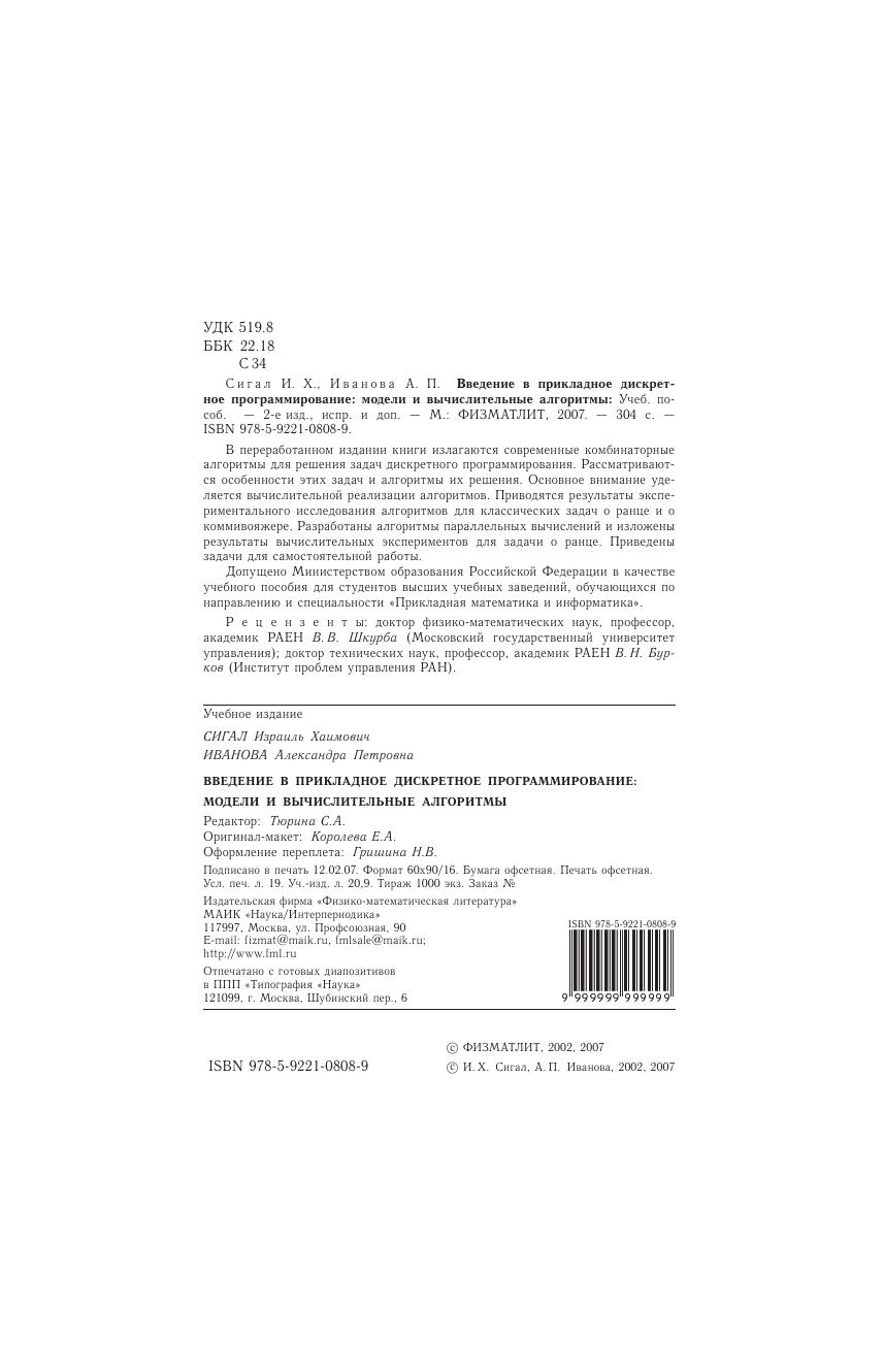 В переработанном издании книги излагаются современные комбинаторные алгоритмы для решения задач дискретного программирования. Рассматриваются особенности этих задач и алгоритмы их решения. Основное внимание уделяется вычислительной реализации алгоритмов. Приводятся результаты экспериментального исследования алгоритмов для классических задач о ранце и о коммивояжере. Разработаны алгоритмы параллельных вычислений и изложены результаты вычислительных экспериментов для задачи о ранце. Приведены задачи для самостоятельной работы