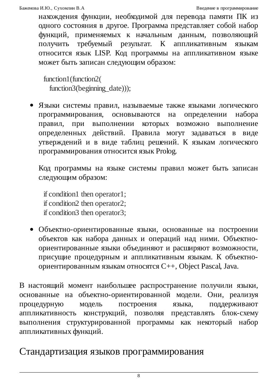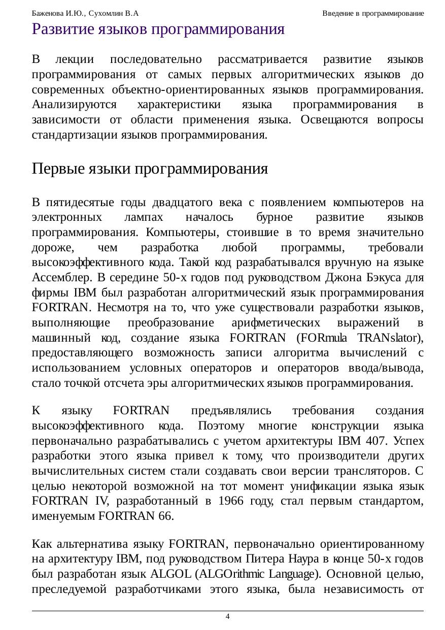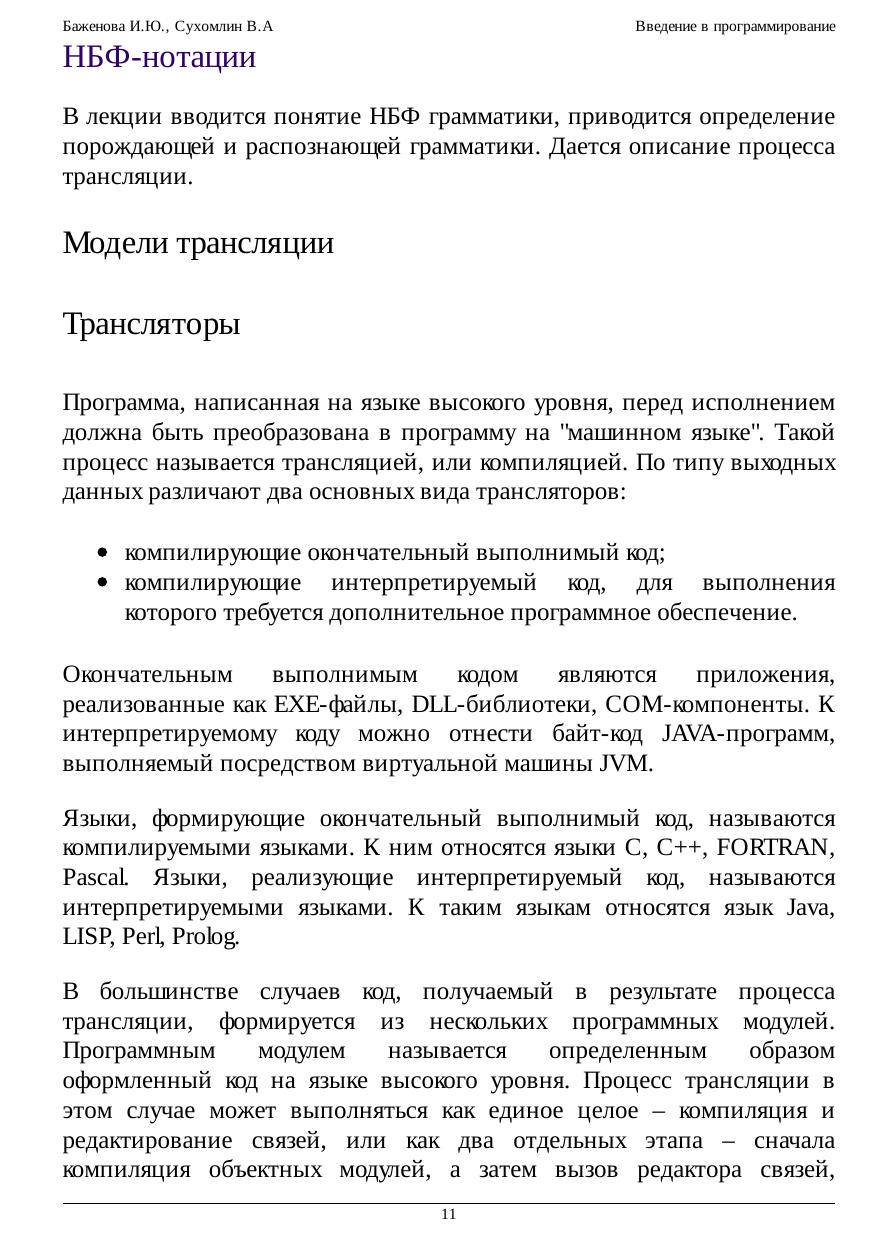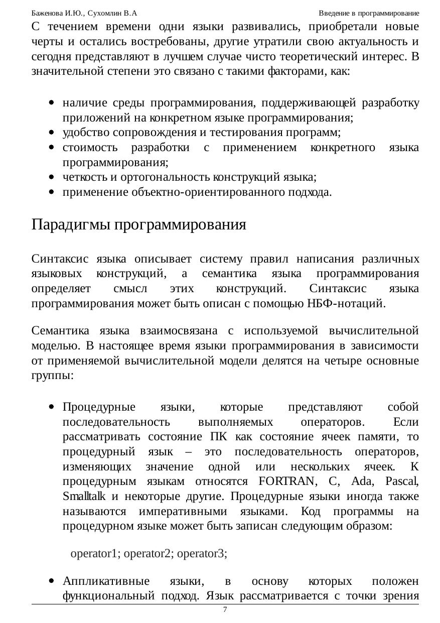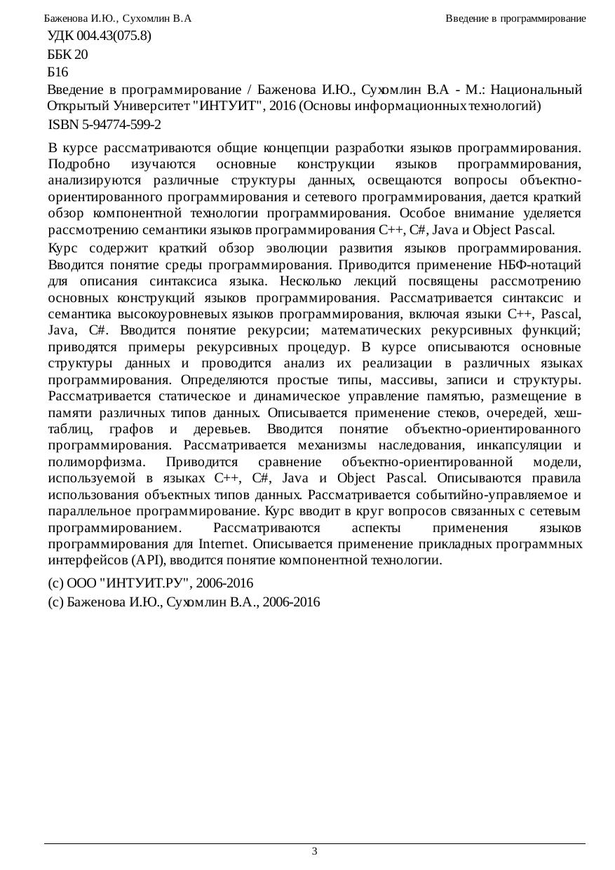 рассмотрению семантики языков программирования C++, C#, Java и Object Pascal. Курс содержит краткий обзор эволюции развития языков программирования. Вводится понятие среды программирования. Приводится применение НБФ-нотаций для описания синтаксиса языка. Несколько лекций посвящены рассмотрению основных конструкций языков программирования. Рассматривается синтаксис и семантика высокоуровневых языков программирования, включая языки С++, Pascal, Java, C#. Вводится понятие рекурсии; математических рекурсивных функций;