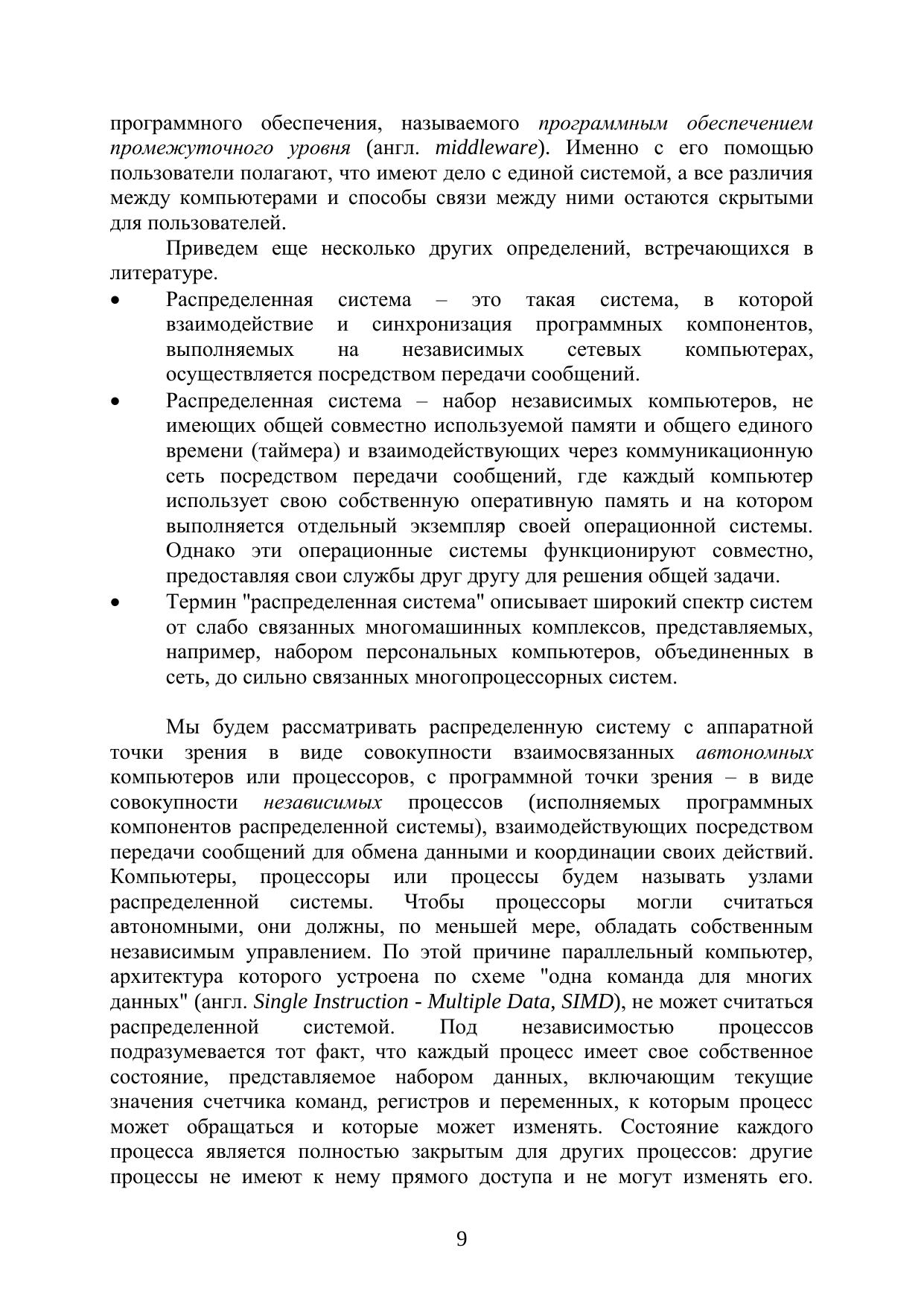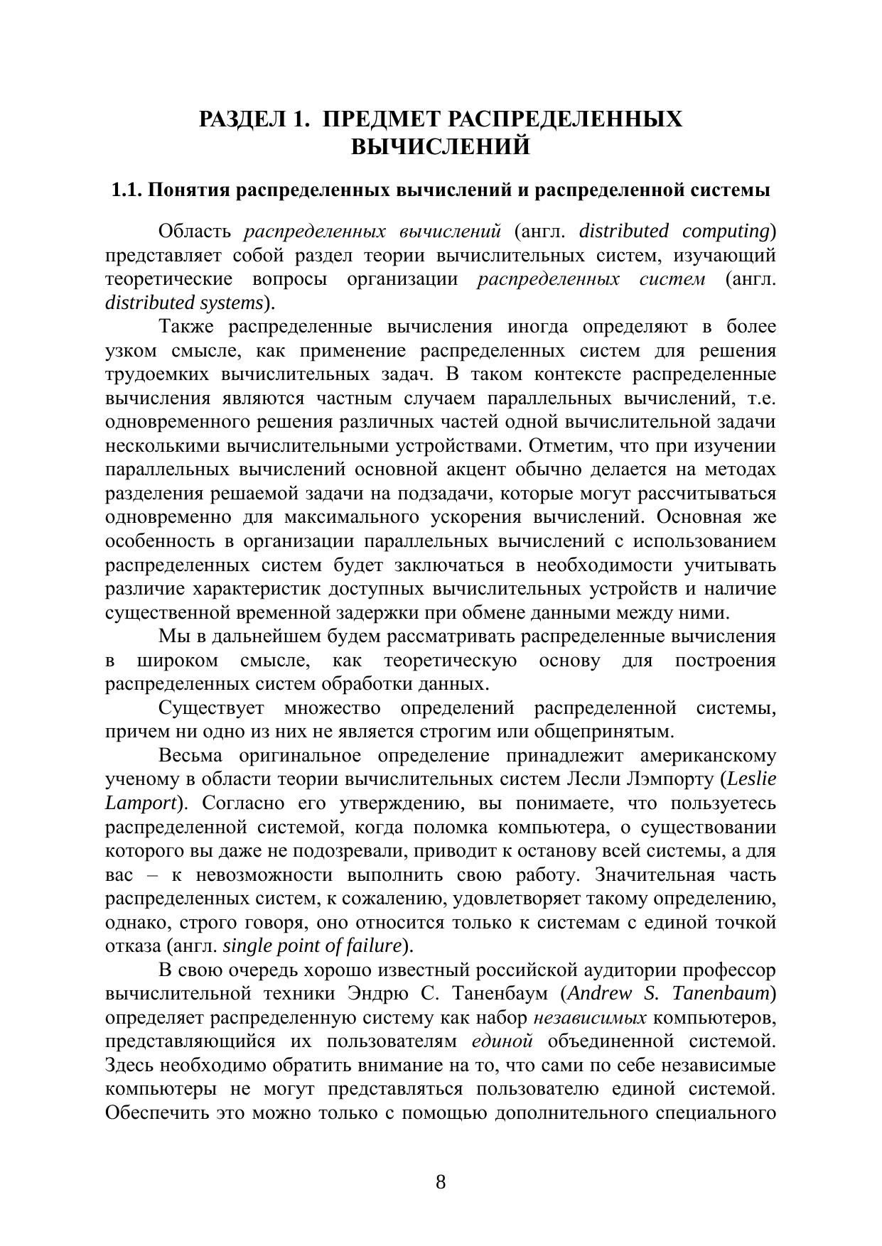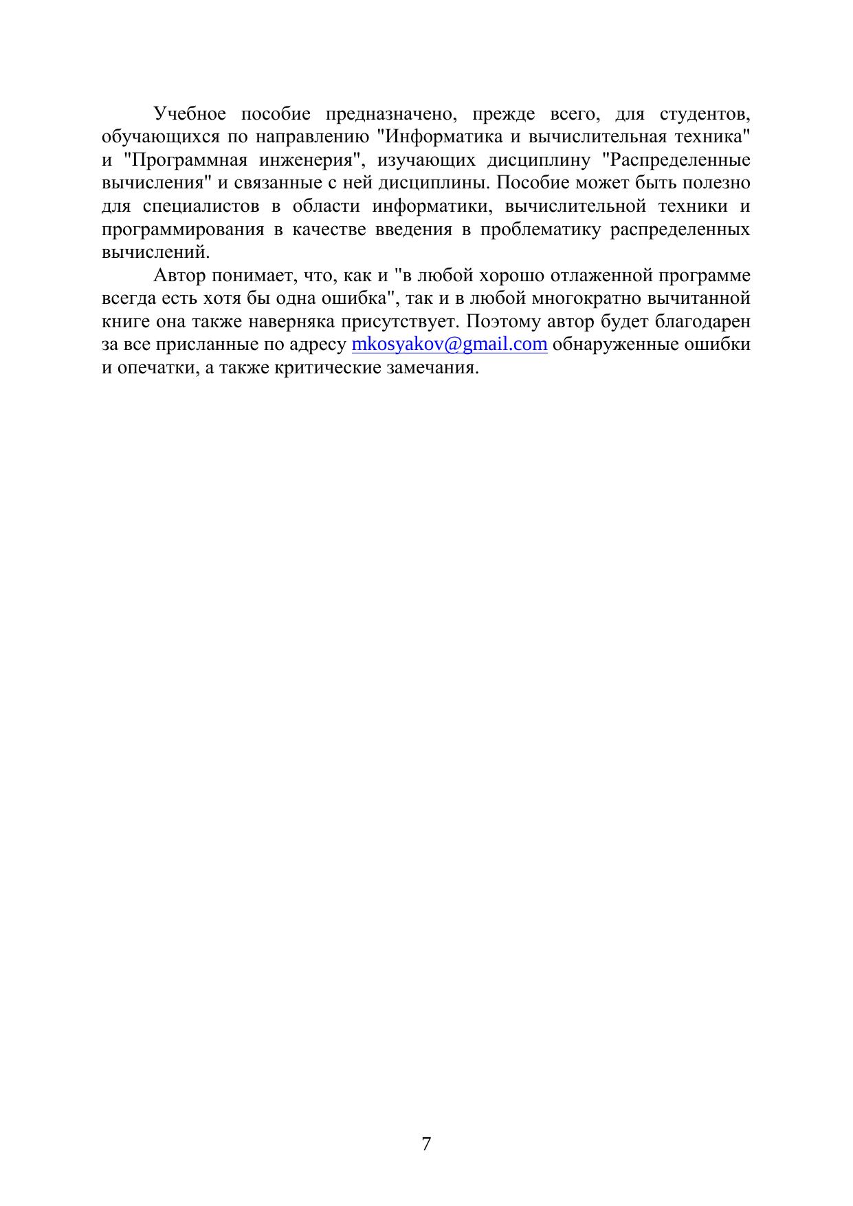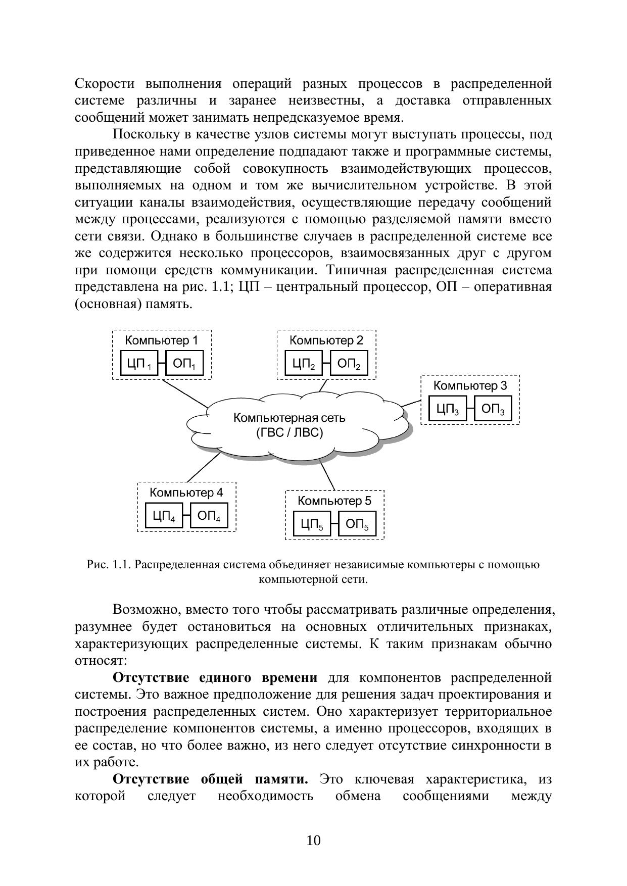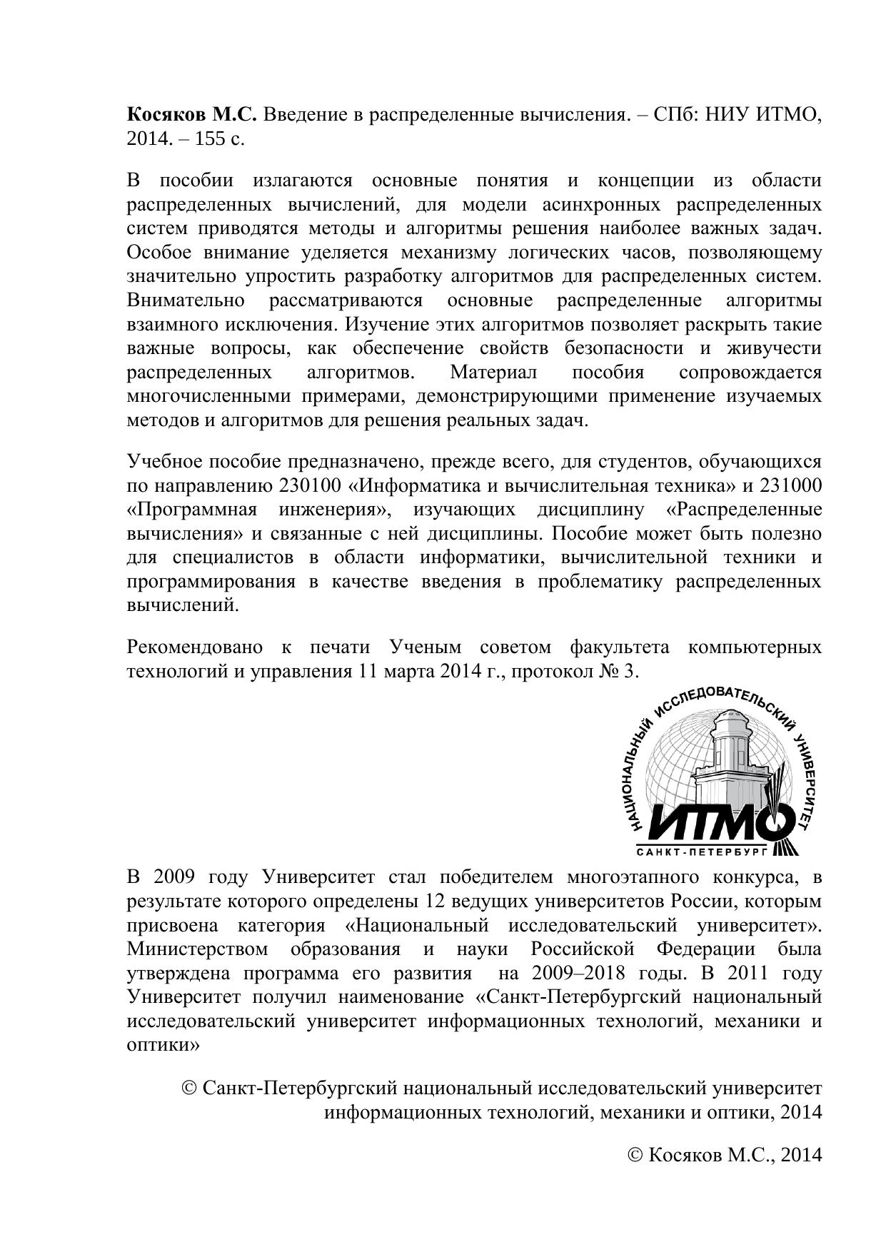 В пособии излагаются основные понятия и концепции из области распределенных вычислений, для модели асинхронных распределенных систем приводятся методы и алгоритмы решения наиболее важных задач. Особое внимание уделяется механизму логических часов, позволяющему значительно упростить разработку алгоритмов для распределенных систем. Внимательно рассматриваются основные распределенные алгоритмы взаимного исключения. Изучение этих алгоритмов позволяет раскрыть такие важные вопросы, как обеспечение свойств безопасности и живучести распределенных алгоритмов. Материал пособия сопровождается многочисленными примерами, демонстрирующими применение изучаемых методов и алгоритмов для решения реальных задач. Учебное пособие предназначено, прежде всего, для студентов, обучающихся по направлению 230100 «Информатика и вычислительная техника» и 231000 «Программная инженерия», изучающих дисциплину «Распределенные вычисления» и связанные с ней дисциплины. Пособие может быть полезно для специалистов в области информатики, вычислительной техники и программирования в качестве введения в проблематику распределенных вычислений.