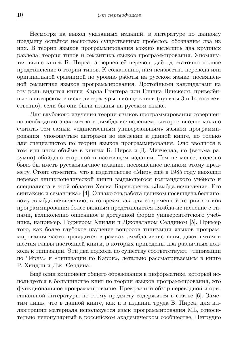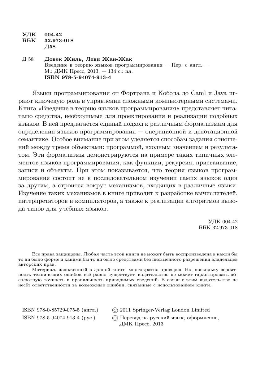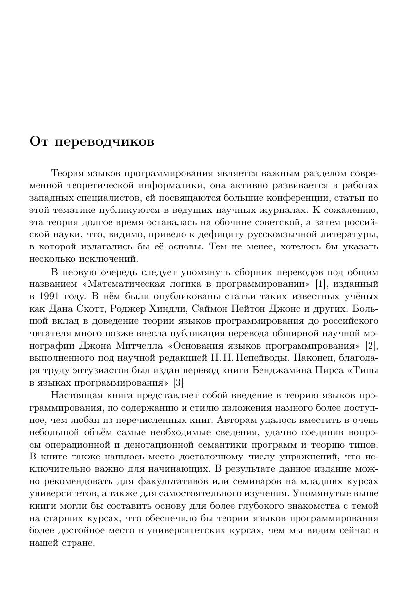 Языки программирования от Фортрана и Кобола до Caml и Java играют ключевую роль в управлении сложными компьютерными системами. Книга «Введение в теорию языков программирования» представляет читателю средства, необходимые для проектирования и реализации подобных языков. В ней предлагается единый подход к различным формализмам для определения языков программирования — операционной и денотационной семантике. Особое внимание при этом уделяется способам задания отношений между тремя объектами: программой, входным значением и результатом. Эти формализмы демонстрируются на примере таких типичных элементов языков программирования, как функции, рекурсия, присваивание, записи и объекты. При этом показывается, что теория языков программирования состоит не в последовательном изучении самих языков один за другим, а строится вокруг механизмов, входящих в различные языки. Изучение таких механизмов в книге приводит к разработке вычислителей, интерпретаторов и компиляторов, а также к реализации алгоритмов вывода типов для учебных языков.