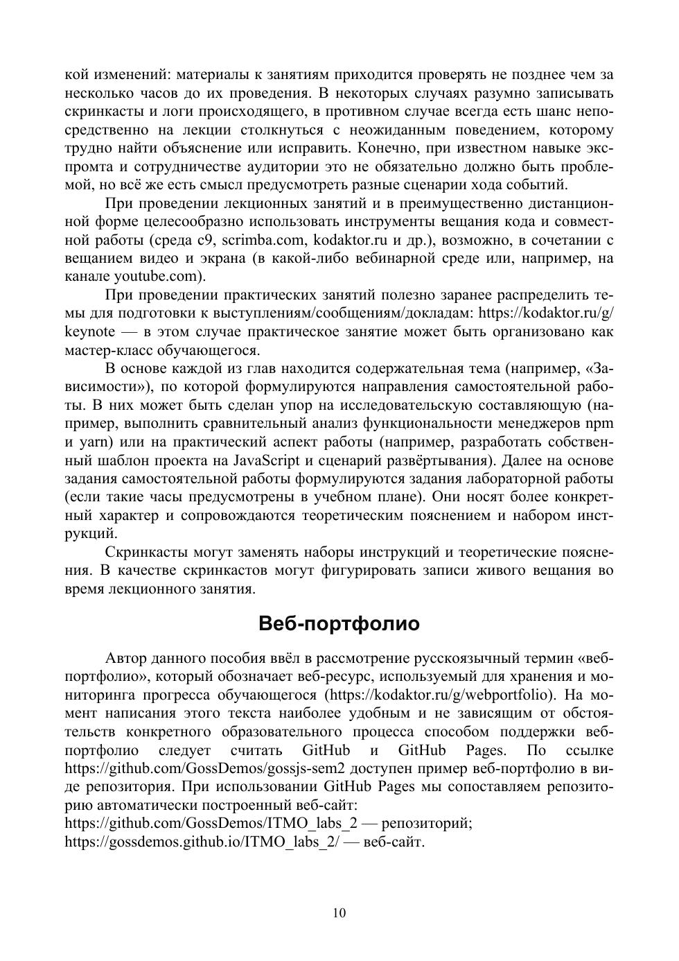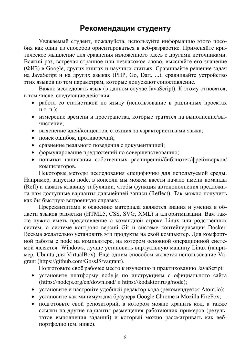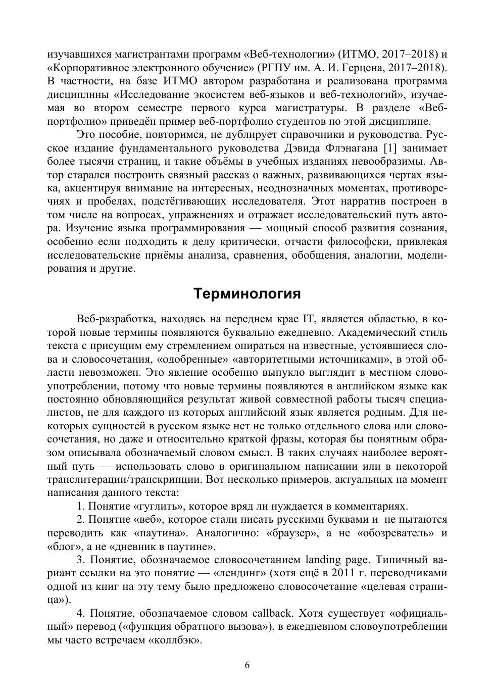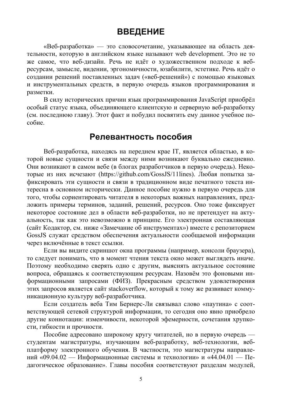 В учебно-методическом пособии рассматриваются фундаментальные основы и прикладные аспекты использования языка JavaScript для клиентской и серверной разработки веб-ресурсов. Проанализированы основные тенденции развития наиболее распространённого языка клиентского веб-программирования в свете внедрения новых стандартов ECMAScript. Изучающим язык предложены задания развивающего и проблемного типа, нацеленные на формирование профессиональных компетенций в области веб-разработки. Пособие инновационно по своей структуре: все примеры и задания доступны в его интерактивной части (сайт kodaktor.ru), которая является зарегистрированным в Роспатенте средством электронного обучения и содержит не только образцы кода, но и скринкасты по ряду рассматриваемых в текстовой части вопросов.