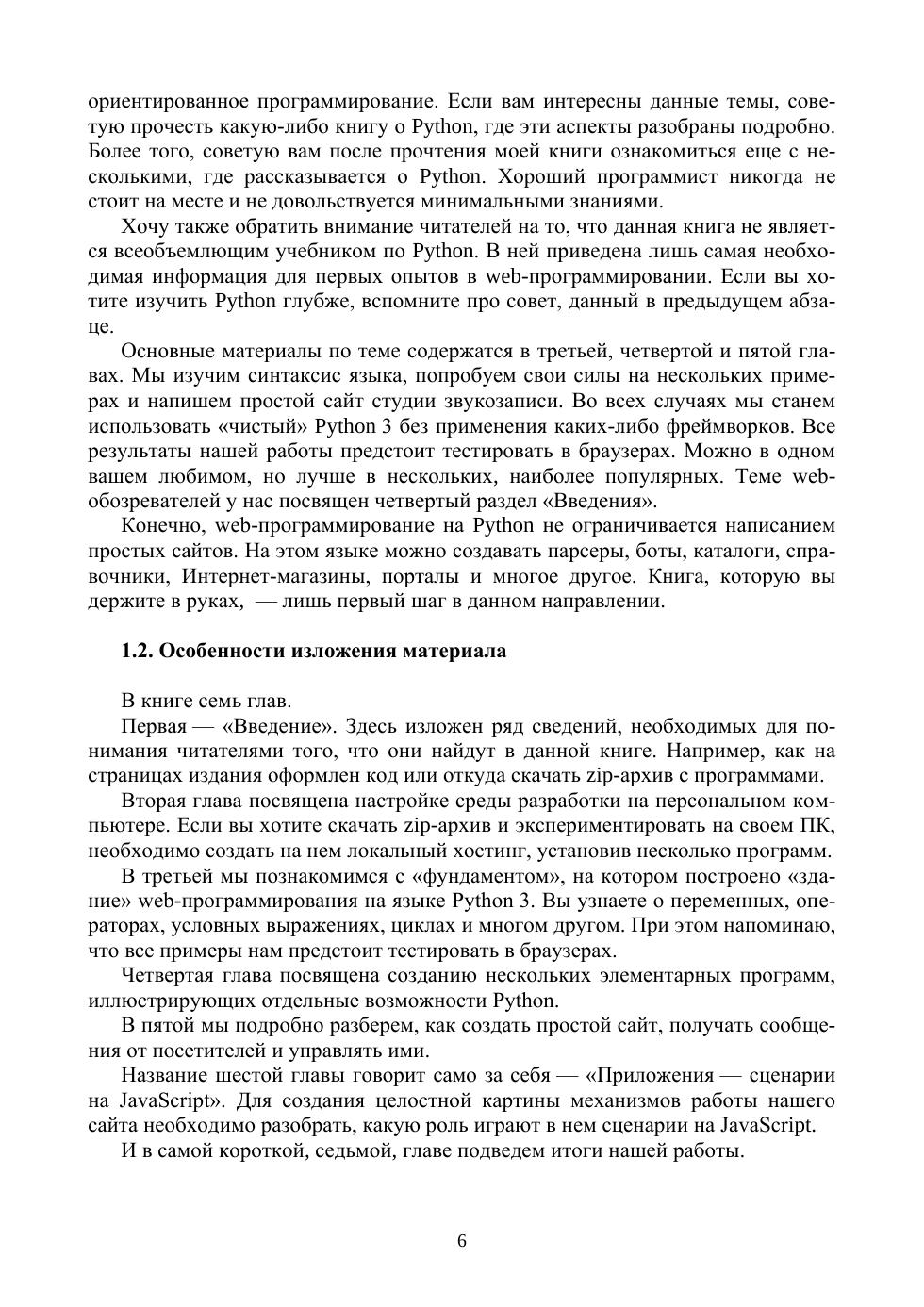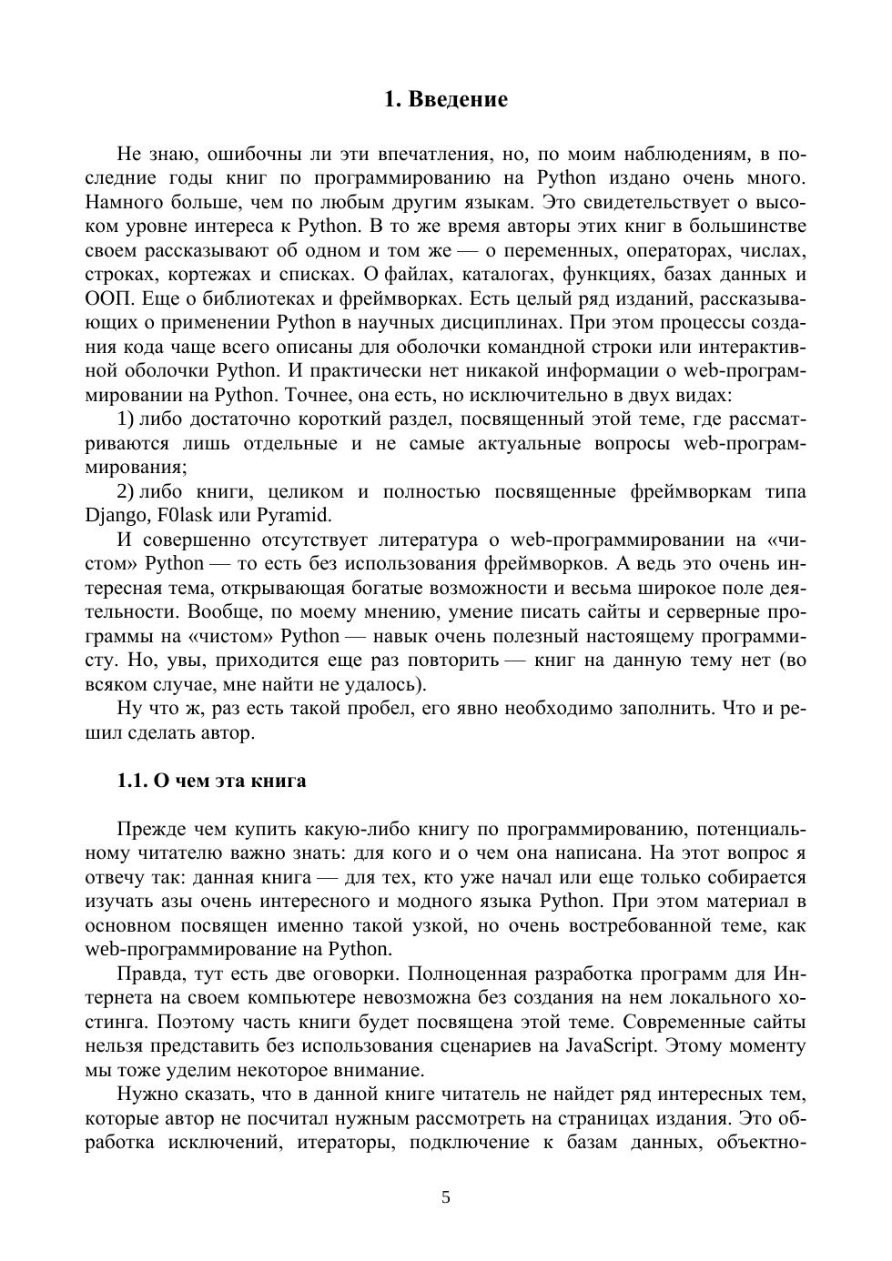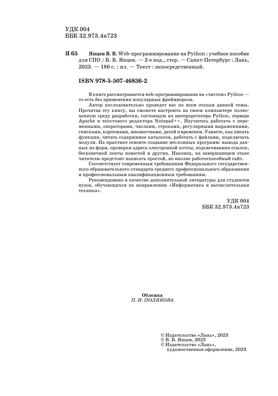 В книге рассматривается web-программирование на «чистом» Python— то есть без применения популярных фреймворков. Автор последовательно проведет вас по всем этапам данной темы. Прочитав эту книгу, вы сможете настроить на своем компьютере полно-ценную среду разработки, состоящую из интерпретатора Python, сервера Apache и текстового редактора Notepad++. Научитесь работать с пере-менными, операторами, числами, строками, регулярными выражениями, списками, кортежами, множествами, датой и временем. Узнаете, как писать функции, читать содержимое каталогов, работать с файлами, подключать модули. На практике освоите создание несложных программ: вывода дан-ных из форм, проверки адреса электронной почты, подсвечивания ссылок, бесконечной ленты новостей и других. Наконец, на завершающем этапе читателю предстоит написать простой, но вполне работоспособный сайт. Соответствует современным требованиям Федерального государственного образовательного стандарта среднего профессионального образования и профессиональным квалификационным требованиям. Рекомендовано в качестве дополнительной литературы для студентов вузов, обучающихся по направлению «Информатика и вычислительная техника».