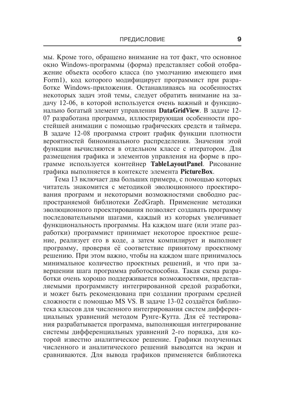 Учебное пособие представляет собой сборник задач с решениями в виде программ на языке C# в интегрированной среде разработки Microsoft Visual Studio 2010, 2012. Решения задач снабжены подробными объяснениями всех алгоритмических и конструктивных особенностей кода. Задачи книги расположены по нарастающей сложности и позволяют читателю, начав с элементов языка C#, получить навыки программирования достаточно высокого уровня. От консольных программ читатель переходит к созданию библиотек классов и полноэкранным Windows-приложениям. В последних главах книги рассмотрено применение методологии эволюционного подхода к проектированию программ, а последняя задача посвящена разработке библиотеки классов для численного интегрирования систем дифференциальных уравнений и применению свободно распространяемой графической библиотеки ZedGraph.