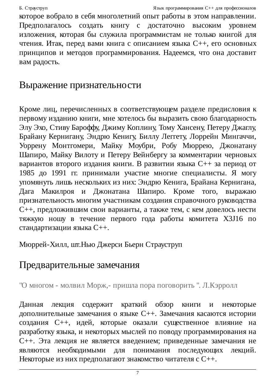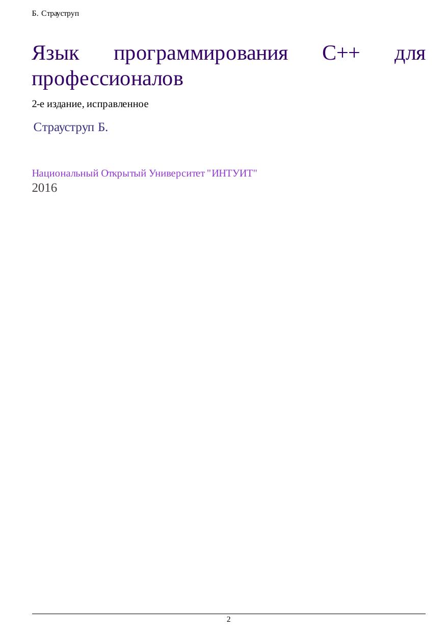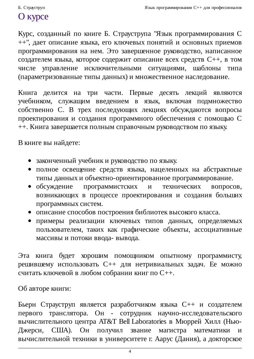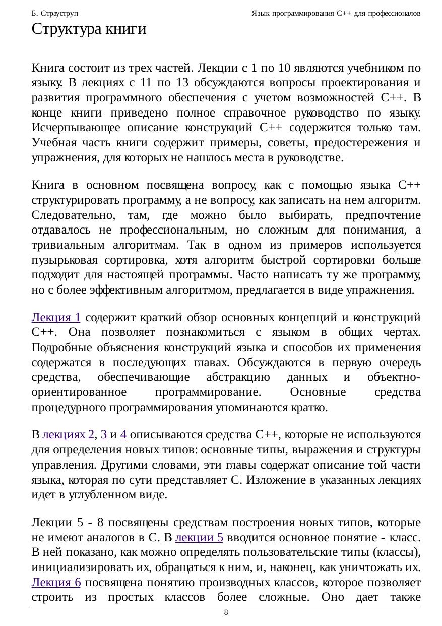 Курс дает описание языка C++, его ключевых понятий и основных приемов программирования на нем. Это завершенное руководство, написанное создателем языка, которое содержит описание всех средств С++, в том числе управление исключительными ситуациями, шаблоны типа (параметризованные типы данных) и множественное наследование. C++ является языком программирования общего назначения. Естественная для него область применения - системное программирование, понимаемое в широком смысле этого слова. Кроме того, С++ успешно используется во многих областях приложения, далеко выходящих за указанные рамки. Реализации С++ теперь есть на всех машинах, начиная с самых скромных микрокомпьютеров - до самых больших супер-ЭВМ, и практически для всех операционных систем. Поэтому книга дает лишь описание собственно языка, не объясняя особенности конкретных реализаций, среды программирования или библиотек.