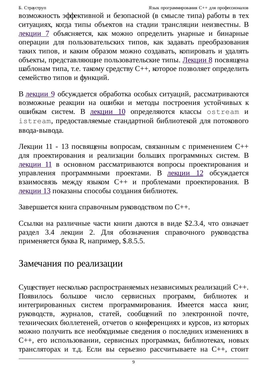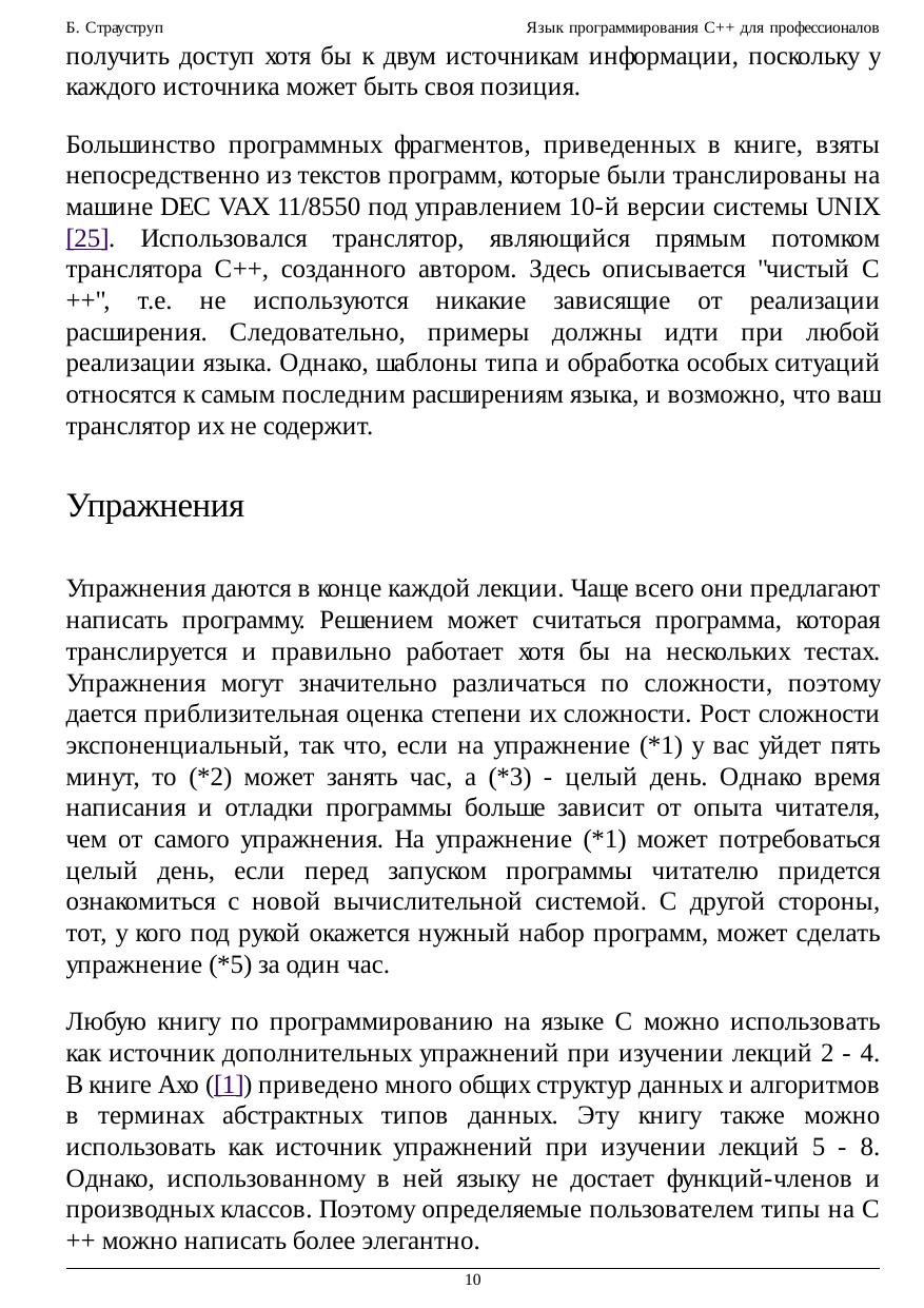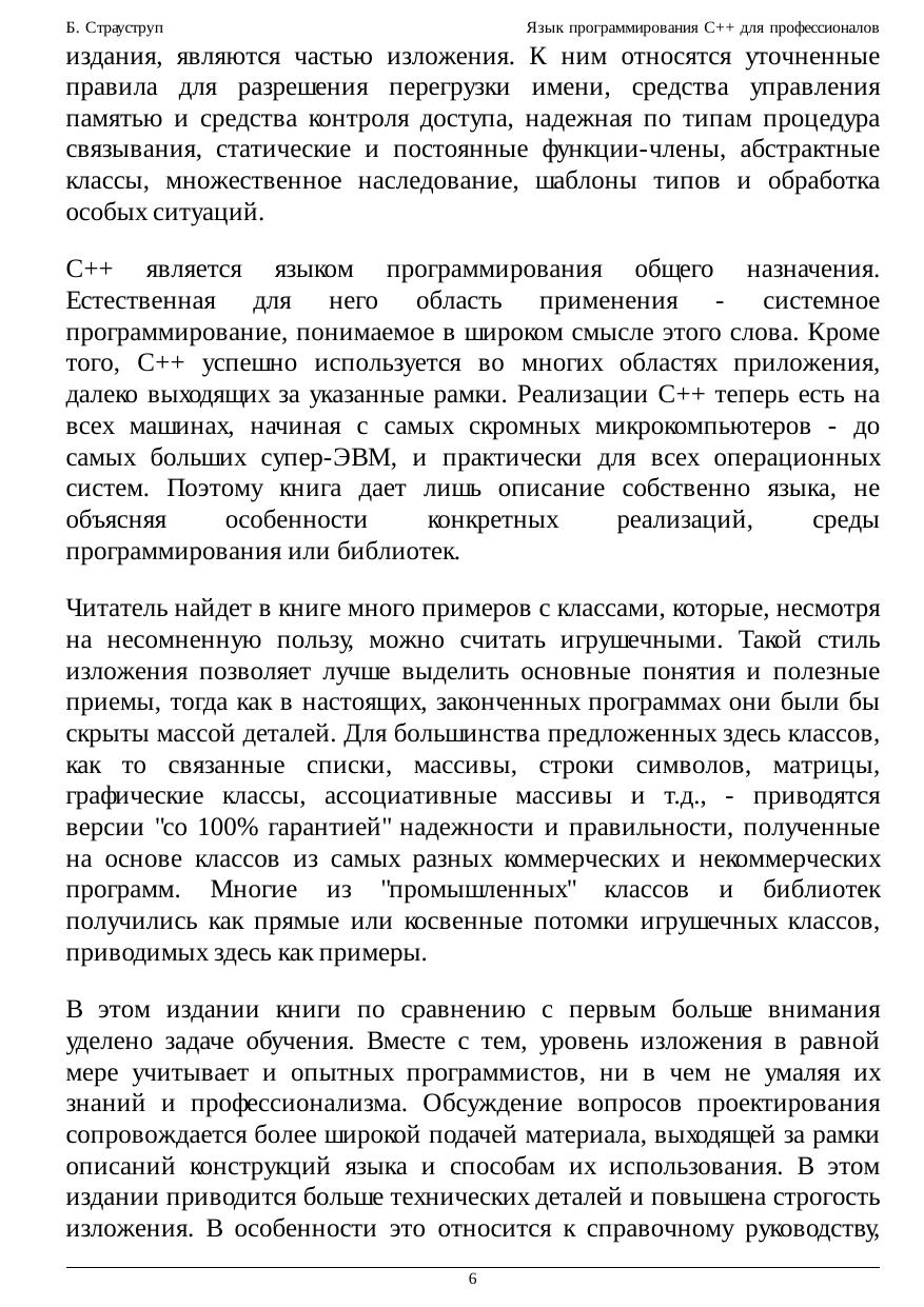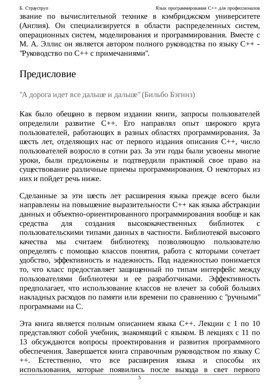 Курс дает описание языка C++, его ключевых понятий и основных приемов программирования на нем. Это завершенное руководство, написанное создателем языка, которое содержит описание всех средств С++, в том числе управление исключительными ситуациями, шаблоны типа (параметризованные типы данных) и множественное наследование. C++ является языком программирования общего назначения. Естественная для него область применения - системное программирование, понимаемое в широком смысле этого слова. Кроме того, С++ успешно используется во многих областях приложения, далеко выходящих за указанные рамки. Реализации С++ теперь есть на всех машинах, начиная с самых скромных микрокомпьютеров - до самых больших супер-ЭВМ, и практически для всех операционных систем. Поэтому книга дает лишь описание собственно языка, не объясняя особенности конкретных реализаций, среды программирования или библиотек.