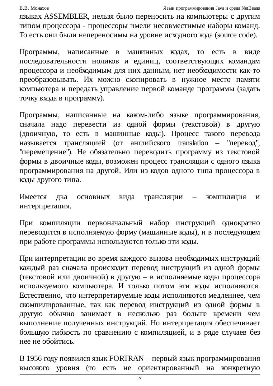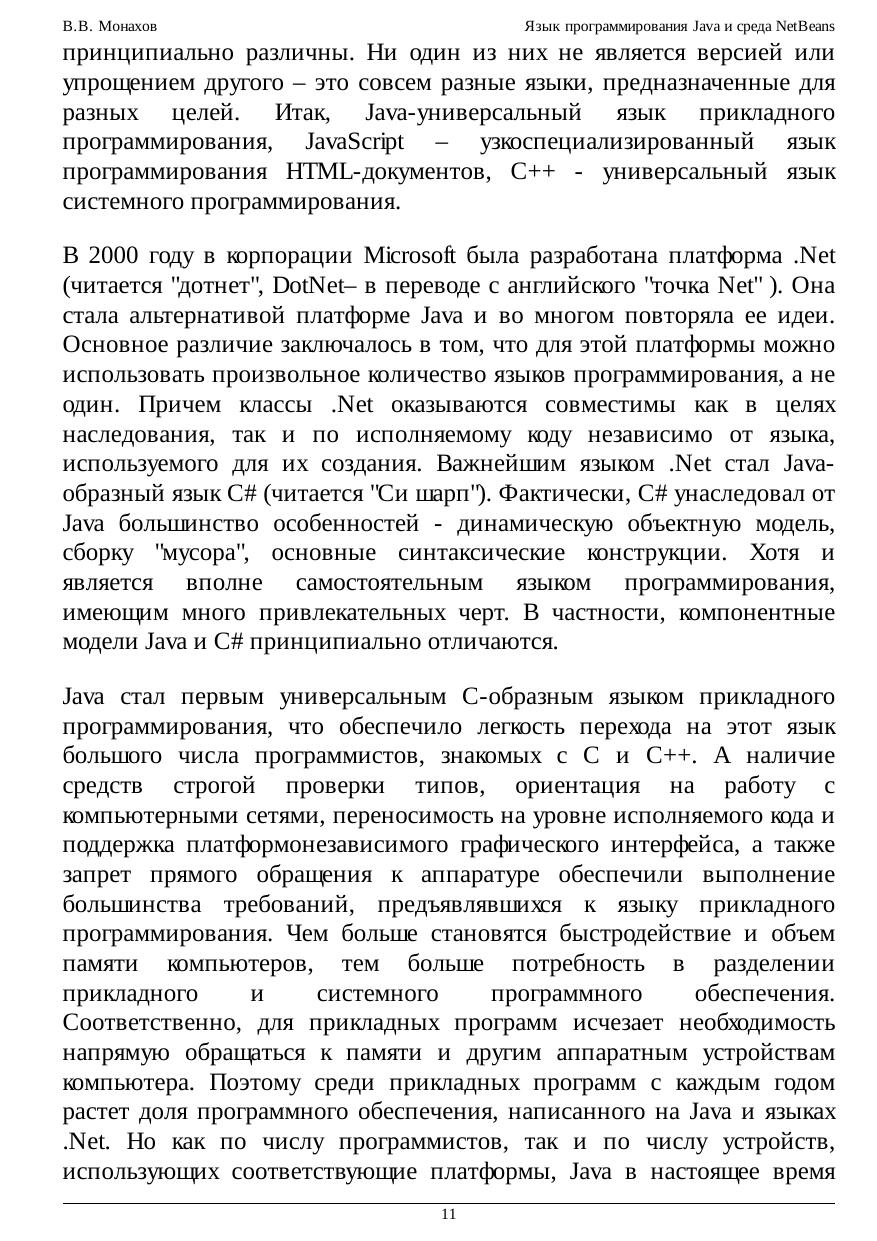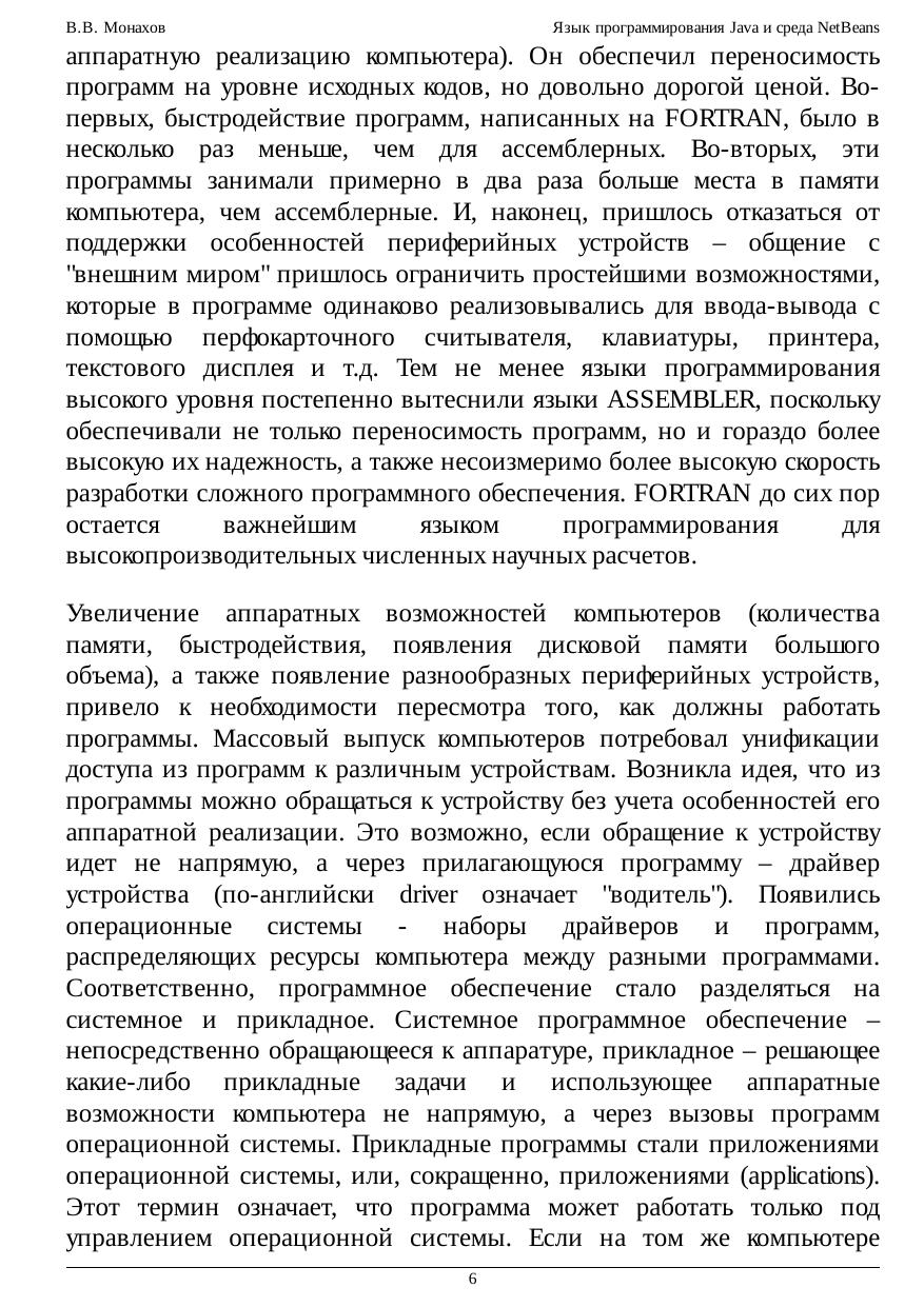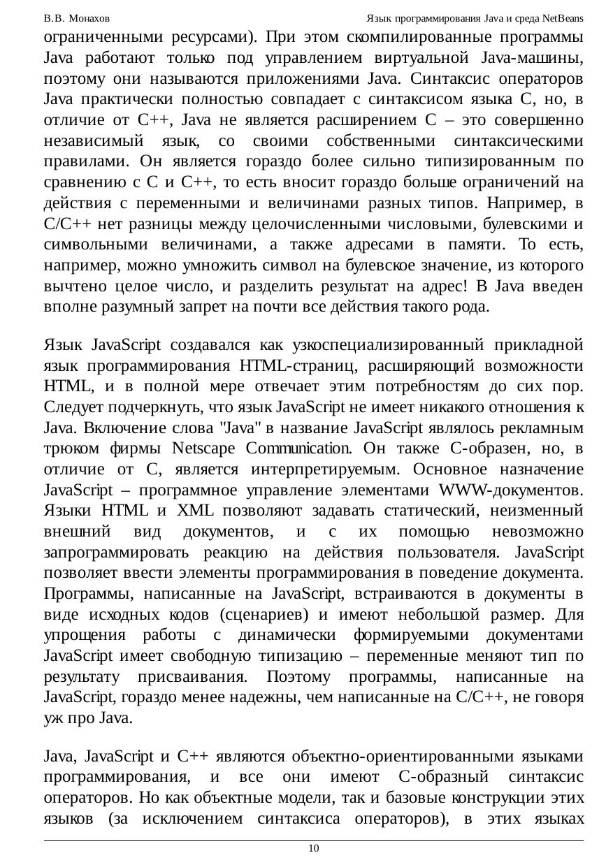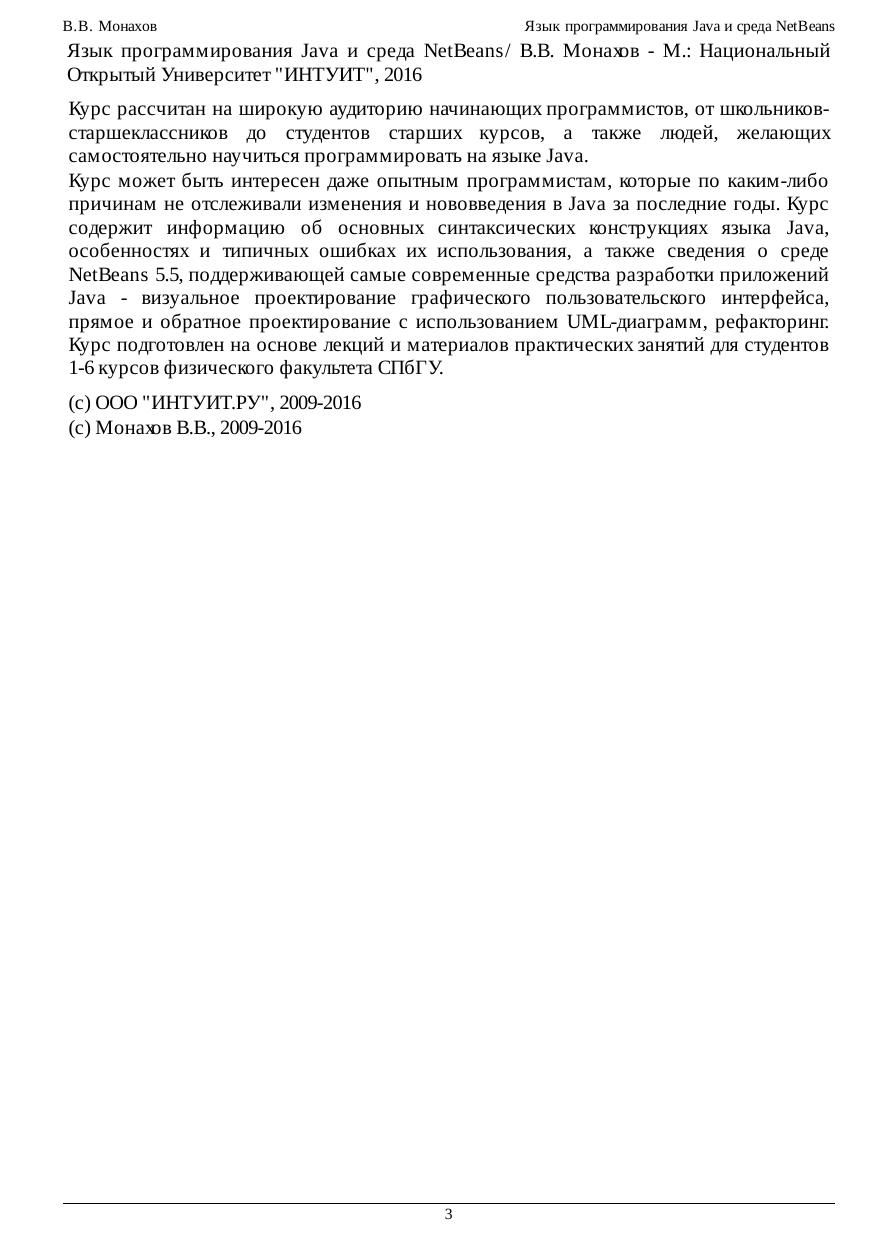 Курс рассчитан на широкую аудиторию начинающих программистов, от школьников-старшеклассников до студентов старших курсов, а также людей, желающих самостоятельно научиться программировать на языке Java. Курс может быть интересен даже опытным программистам, которые по каким-либо причинам не отслеживали изменения и нововведения в Java за последние годы. Курс содержит информацию об основных синтаксических конструкциях языка Java, особенностях и типичных ошибках их использования, а также сведения о среде NetBeans 5.5, поддерживающей самые современные средства разработки приложений Java - визуальное проектирование графического пользовательского интерфейса, прямое и обратное проектирование с использованием UML-диаграмм, рефакторинг. Курс подготовлен на основе лекций и материалов практических занятий для студентов 1-6 курсов физического факультета СПбГУ.