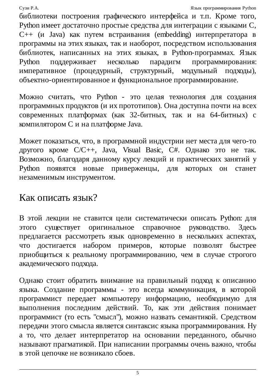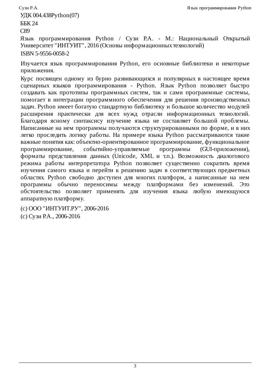 Изучается язык программирования Python, его основные библиотеки и некоторые приложения. Курс посвящен одному из бурно развивающихся и популярных в настоящее время сценарных языков программирования - Python. Язык Python позволяет быстро создавать как прототипы программных систем, так и сами программные системы, помогает в интеграции программного обеспечения для решения производственных задач. Python имеет богатую стандартную библиотеку и большое количество модулей расширения практически для всех нужд отрасли информационных технологий. Благодаря ясному синтаксису изучение языка не составляет большой проблемы. Написанные на нем программы получаются структурированными по форме, и в них легко проследить логику работы. На примере языка Python рассматриваются такие важные понятия как: объектно-ориентированное программирование, функциональное программирование, событийно-управляемые программы (GUI приложения), форматы представления данных (Unicode, XML и т.п.). Возможность диалогового режима работы интерпретатора Python позволяет существенно сократить время изучения самого языка и перейти к решению задач в соответствующих предметных областях. Python свободно доступен для многих платформ, а написанные на нем программы обычно переносимы между платформами без изменений. Это обстоятельство позволяет применять для изучения языка любую имеющуюся аппаратную платформу.