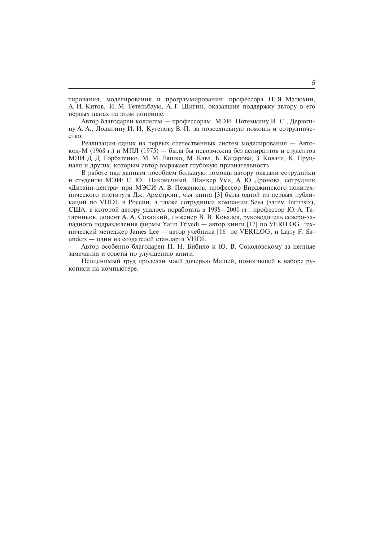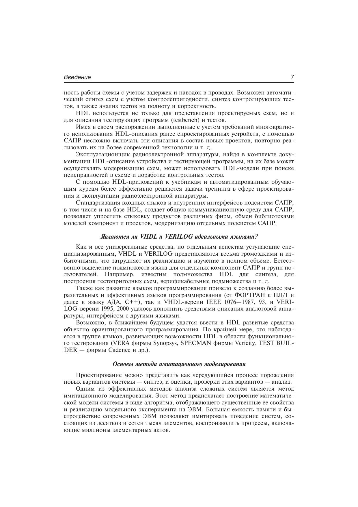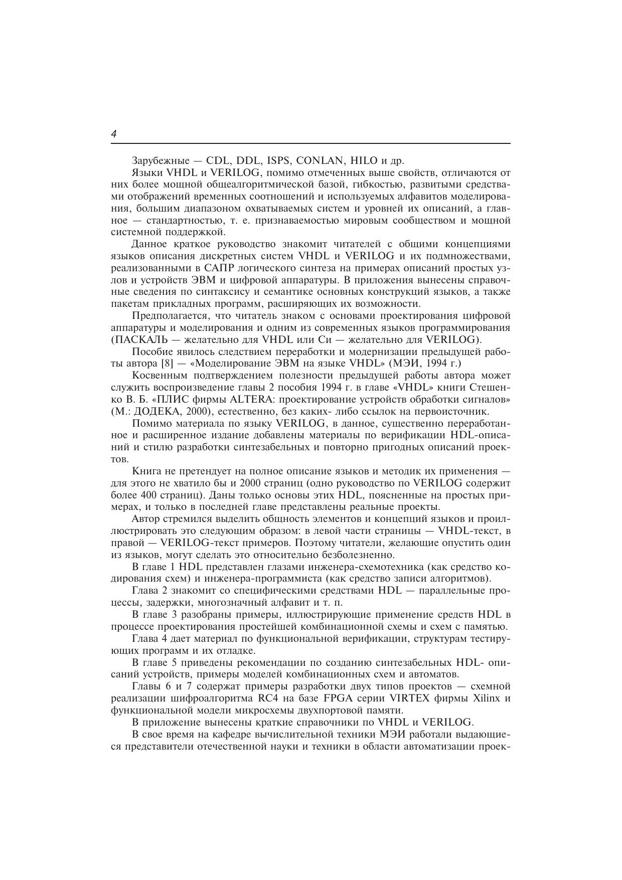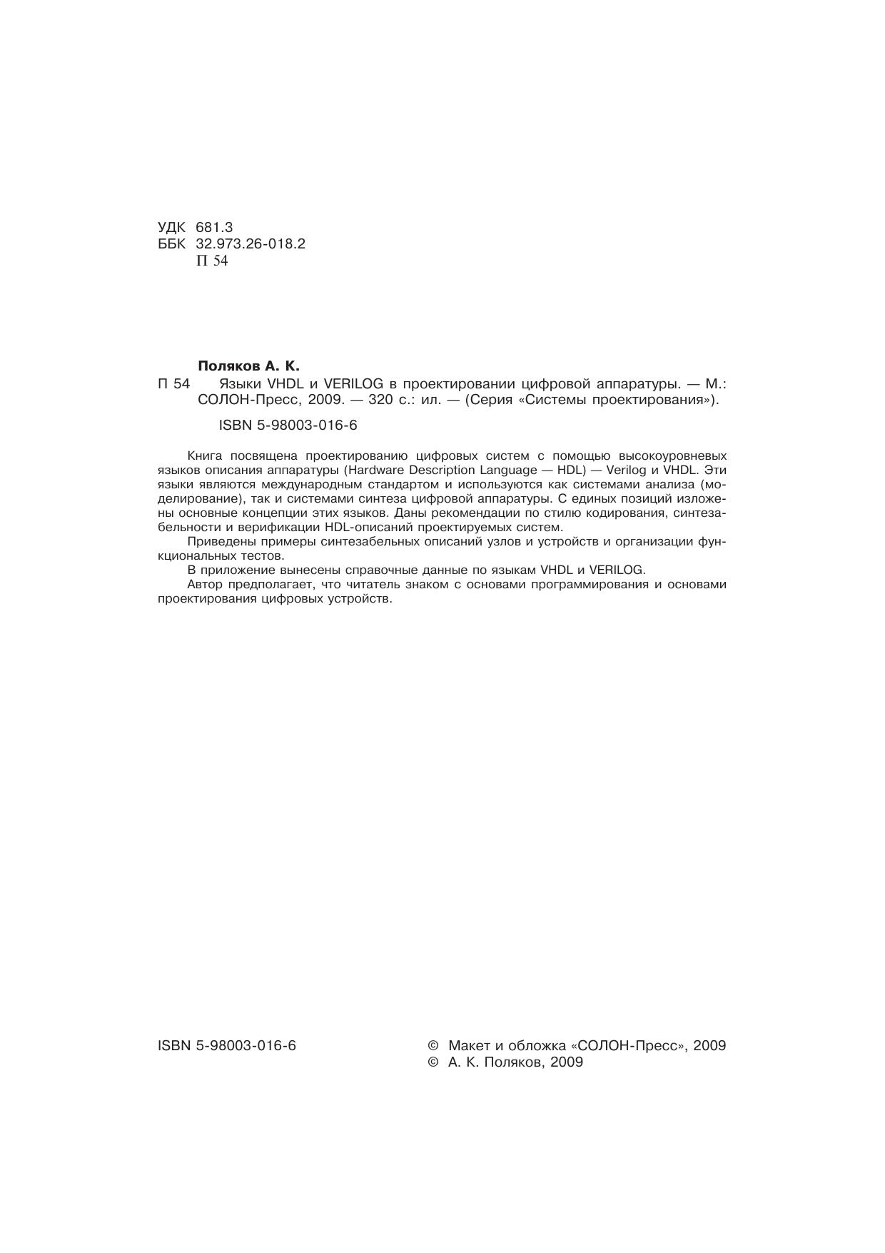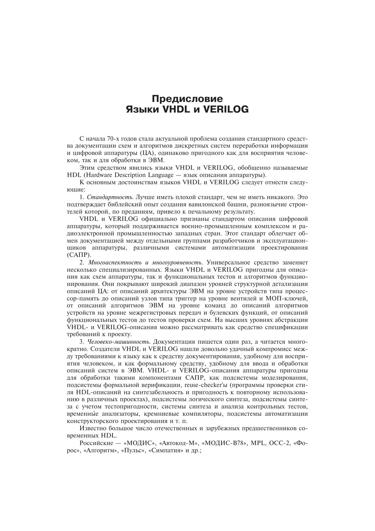 Книга посвящена проектированию цифровых систем с помощью высокоуровневых языков описания аппаратуры (Hardware Description Language — HDL) — Verilog и VHDL. Эти языки являются международным стандартом и используются как системами анализа (моделирование), так и системами синтеза цифровой аппаратуры. С единых позиций изложены основные концепции этих языков. Даны рекомендации по стилю кодирования, синтеза-бельности и верификации HDL-описаний проектируемых систем.Приведены примеры синтезабельных описаний узлов и устройств и организации функциональных тестов.В приложение вынесены справочные данные по языкам VHDL и VERILOG. Автор предполагает, что читатель знаком с основами программирования и основами проектирования цифровых устройств.
