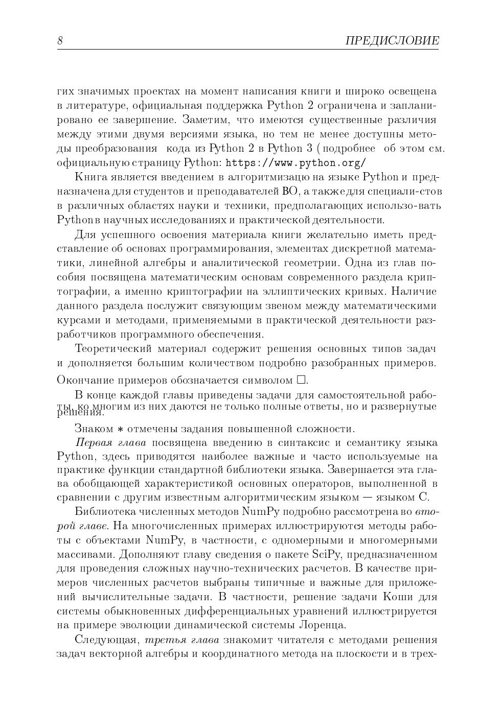 Изложены основные понятия языка программирования Python, акцент сделан на использовании средств языка в численных расчетах, в том числе в высокопроизводительных вычислениях. Проводится сравнение с другими языками, обсуждаются особенности использования Python для разного класса задач. Рассматриваются разнообразные задачи, в том числе из разделов линейной алгебры и аналитической геометрии, и приводятся алгоритмы их решения. В каждой главе содержится теоретический материал, тексты программ, контрольные вопросы, а также задачи для самостоятельного решения. Для студентов, аспирантов и преподавателей университетов, в которых ведется подготовка в области информационных технологий и прикладной математики, а также для тех, кто планирует использовать математические методы и язык Python в своей практической деятельности.