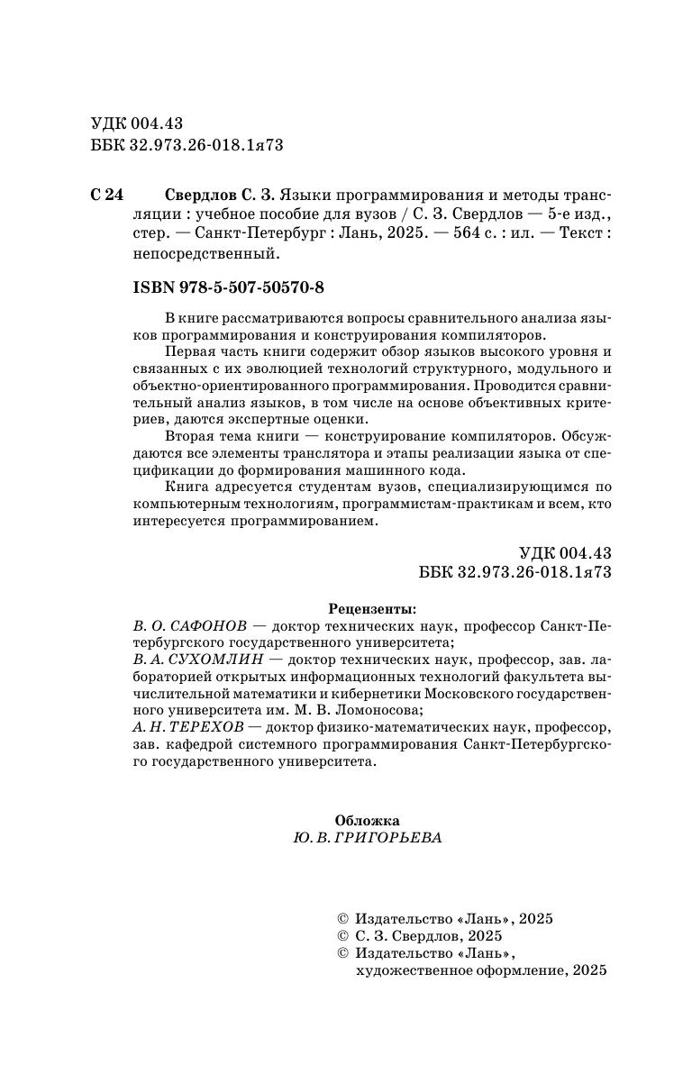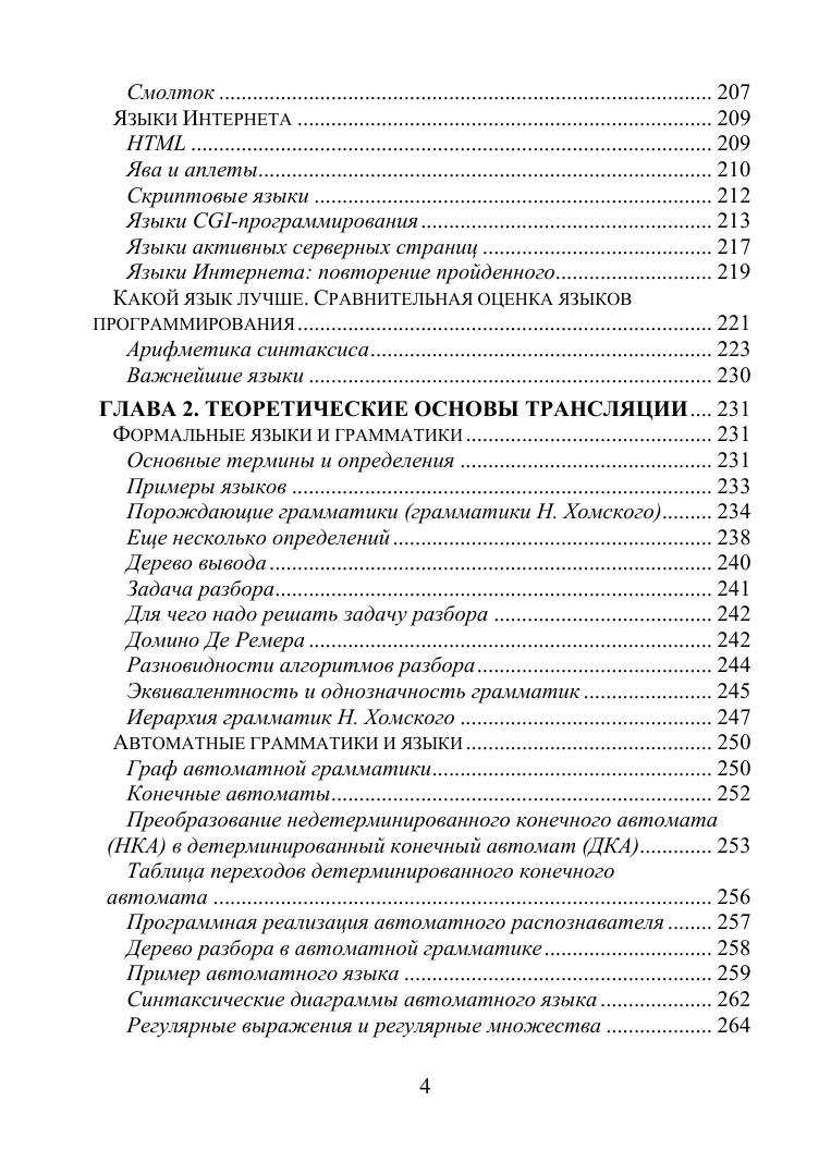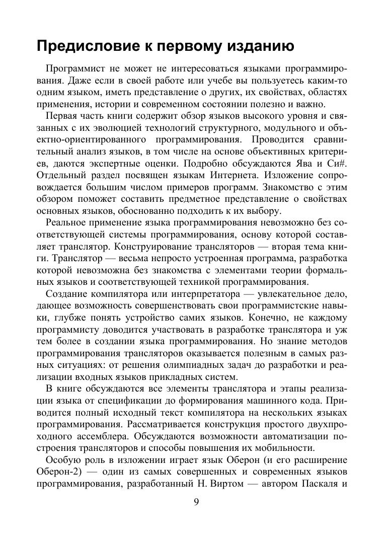 В книге рассматриваются вопросы сравнительного анализа языков программирования и конструирование компиляторов. Первая часть книги содержит обзор языков высокого уровня и связанных с их эволюцией технологий структурного, модульного и объектно-ориентированного программирования. Проводится сравнительный анализ языков, в том числе на основе объективных критериев, даются экспертные оценки. Вторая тема книги — конструирование компиляторов. Обсуждаются все элементы транслятора и этапы реализации языка от спецификации до формирования машинного кода. Книга адресуется студентам вузов, специализирующимся по компьютерным технологиям, программистам-практикам и всем, кто интересуется программированием.