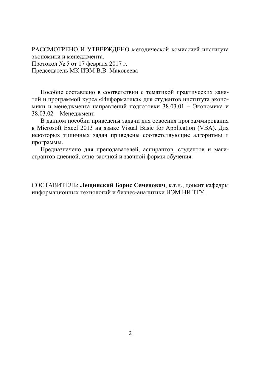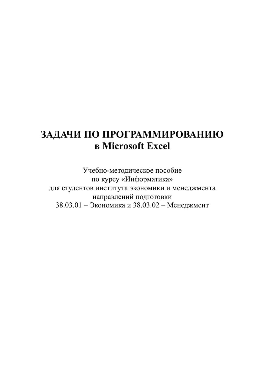 Пособие составлено в соответствии с тематикой практических занятий и программой курса «Информатика» для студентов института экономики и менеджмента направлений подготовки 38.03.01 – Экономика и 38.03.02 – Менеджмент. В данном пособии приведены задачи для освоения программирования в Microsoft Excel 2013 на языке Visual Basic for Application (VBA). Для некоторых типичных задач приведены соответствующие алгоритмы и программы. Предназначено для преподавателей, аспирантов, студентов и магистрантов дневной, очно-заочной и заочной формы обучения.