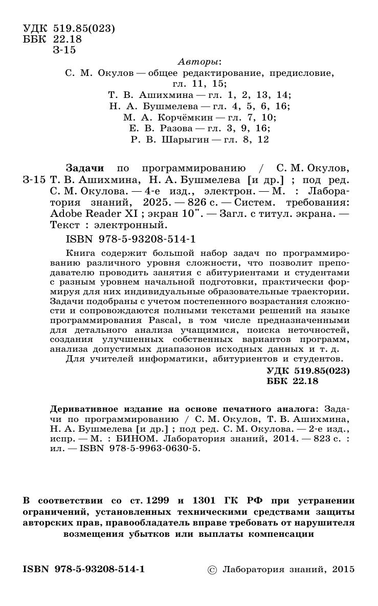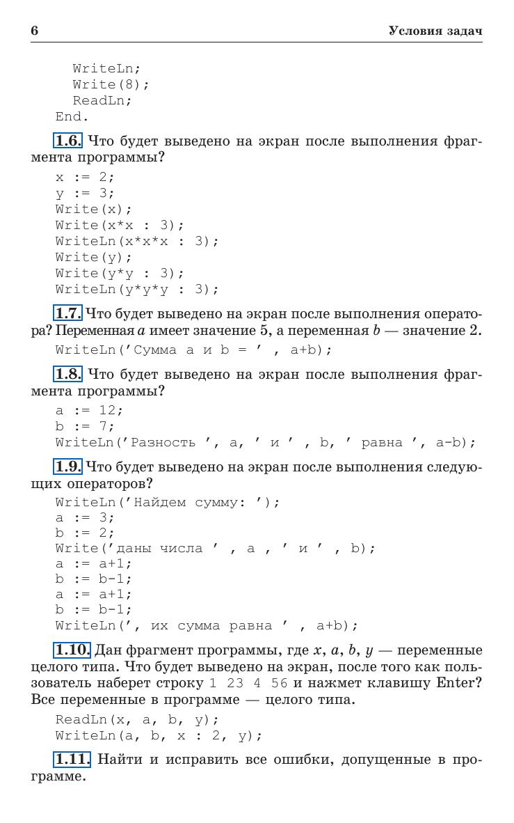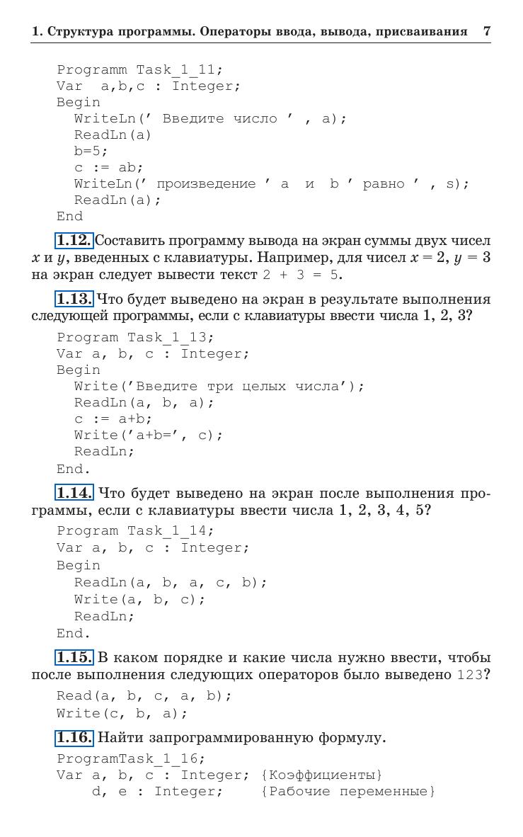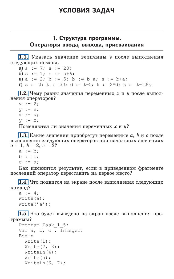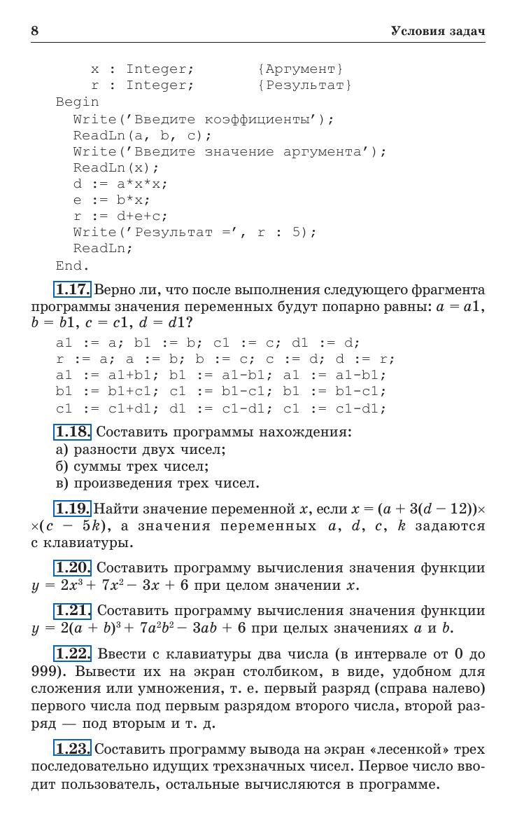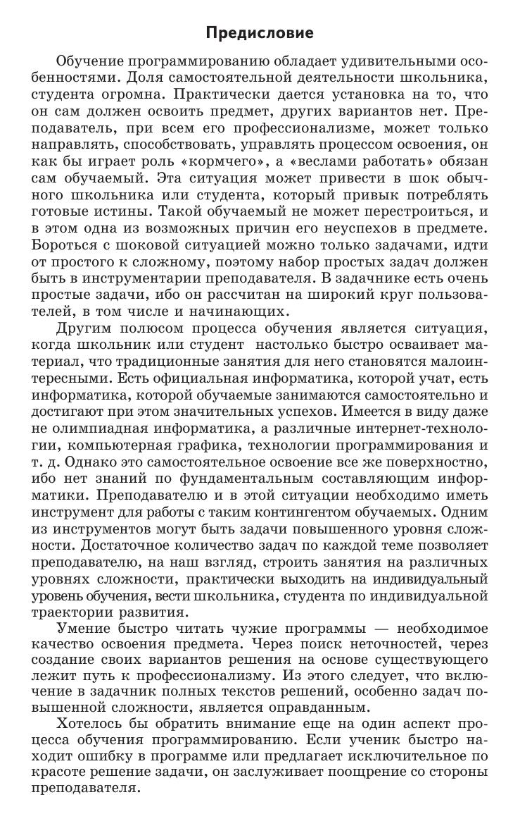 Книга содержит большой набор задач по программированию различного уровня сложности, что позволит преподавателю проводить занятия с абитуриентами и студентами с разным уровнем начальной подготовки, практически формируя для них индивидуальные образовательные траектории. Задачи подобраны с учетом постепенного возрастания сложности и сопровождаются полными текстами решений на языке программирования Pascal, в том числе предназначенными для детального анализа учащимися, поиска неточностей, создания улучшенных собственных вариантов программ, анализа допустимых диапазонов исходных данных и т. д. Для учителей информатики, абитуриентов и студентов.