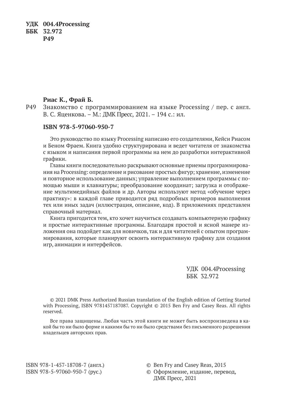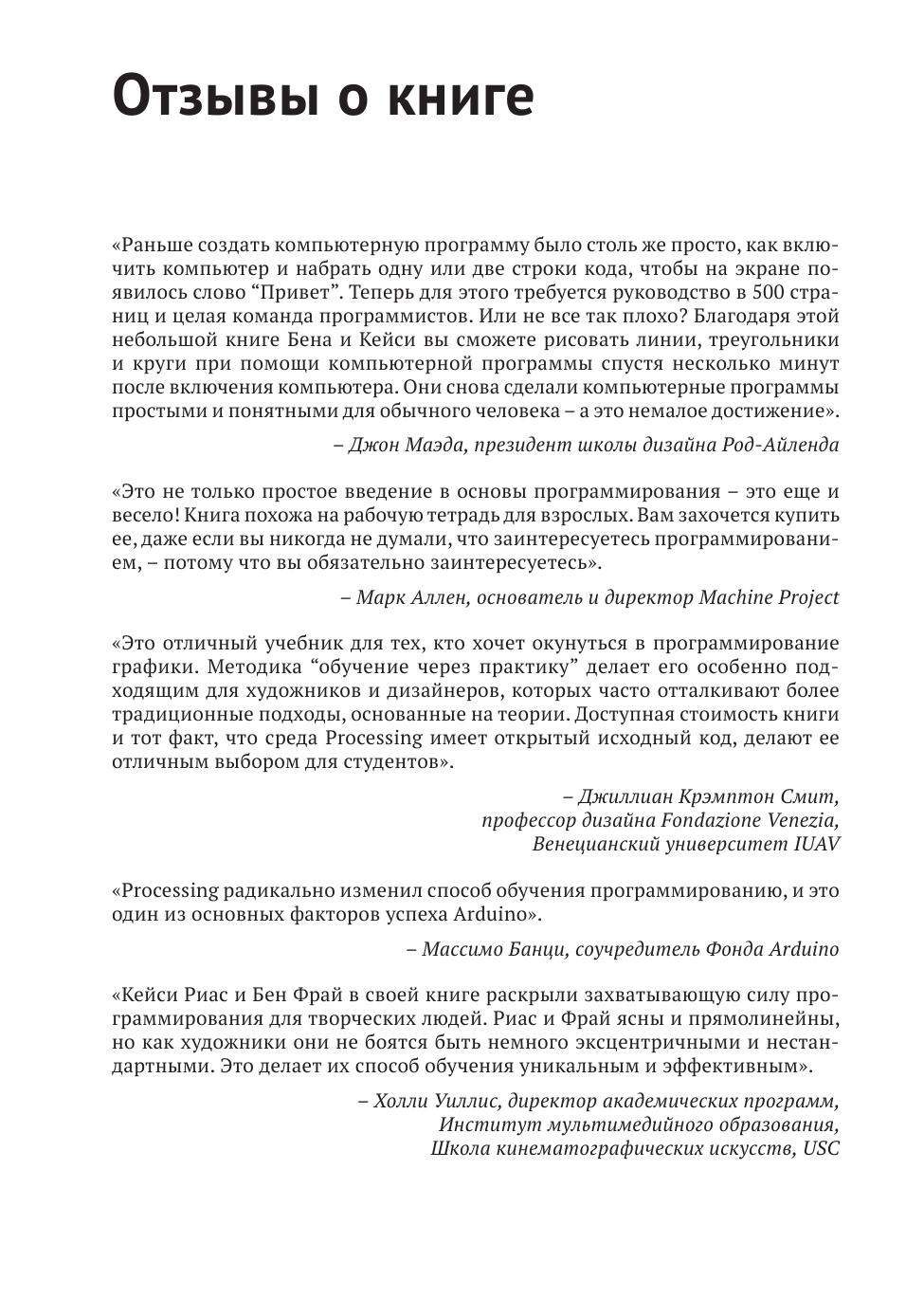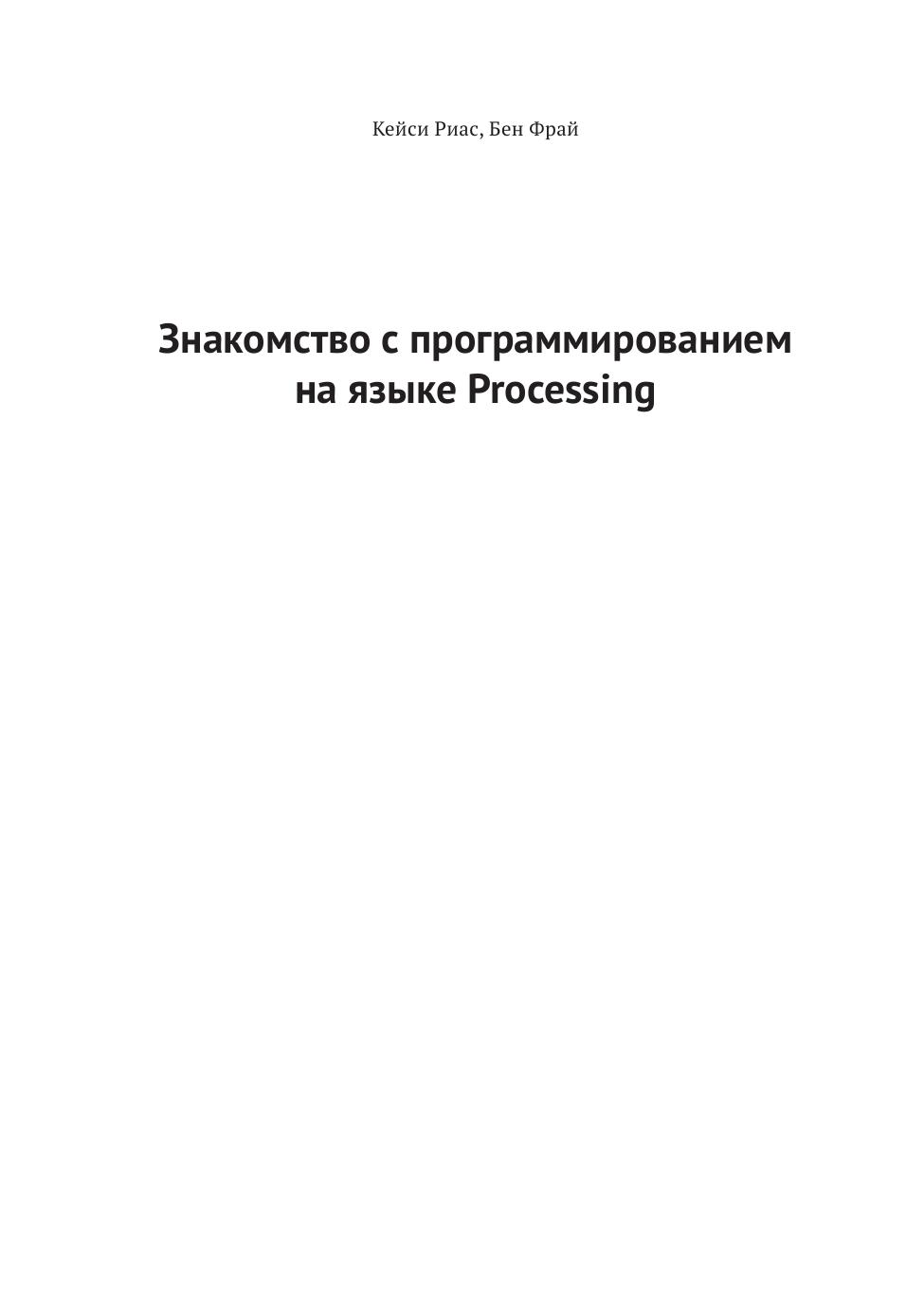 Изучите компьютерное программирование с помощью Processing – простого языка, предназначенного для создания рисунков, анимации и интерактивной графики. Курсы программирования обычно начинаются с теории, но эта книга сразу же переходит к творческим и занимательным проектам. Она идеально подходит для всех, кто хочет научиться программировать, и служит простым введением в компьютерную графику для людей, которые уже имеют некоторые навыки программирования.