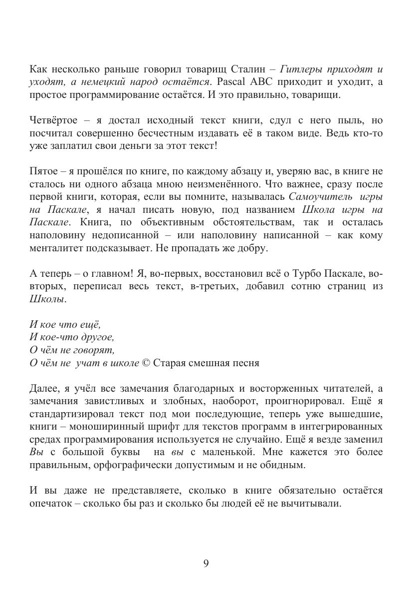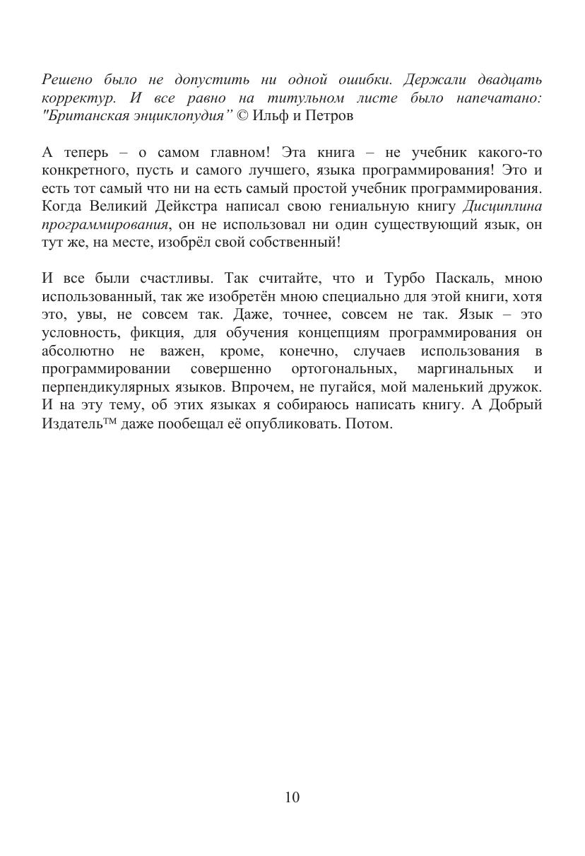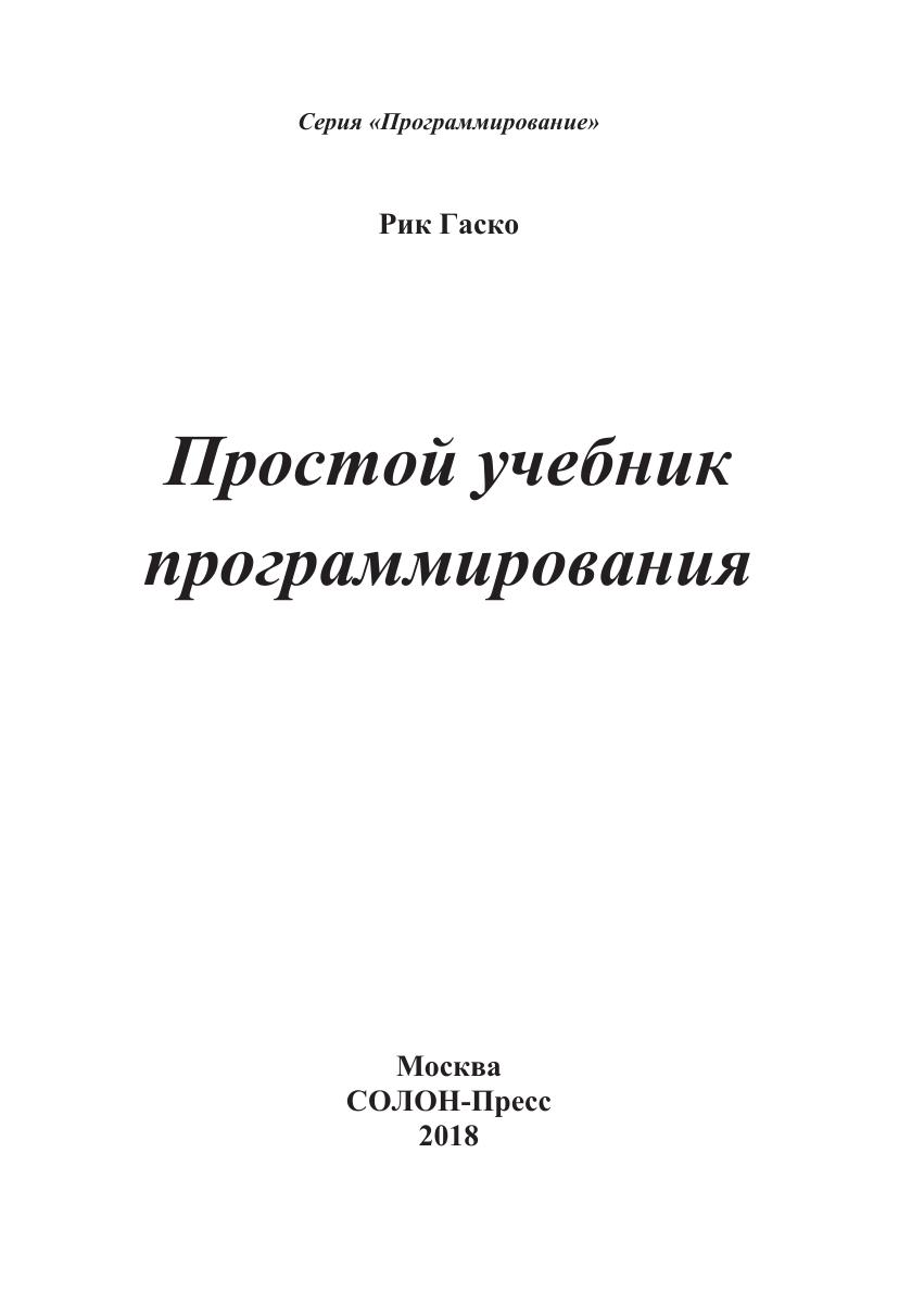 Чтение учебника не утомляет, а наоборот, — захватывает. Это лучший учебник программирования, по крайней мере, из всех доступных на русском языке. Проработав книгу от начала и до конца, читатель получит ясное понимание — что это такое, программирование. Выбранный в дальнейшем конкретный язык программирования неважен, важны принципы.