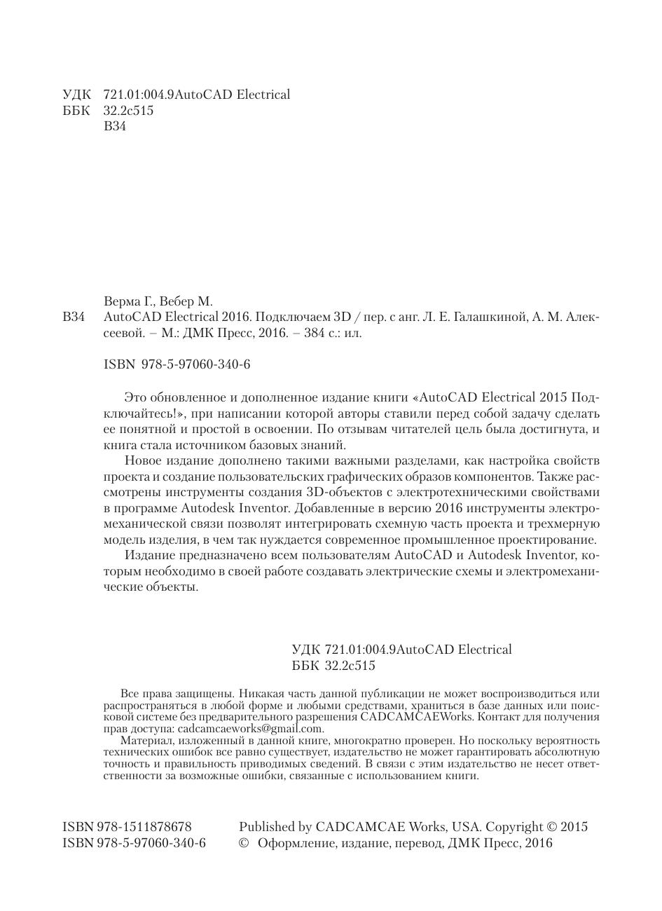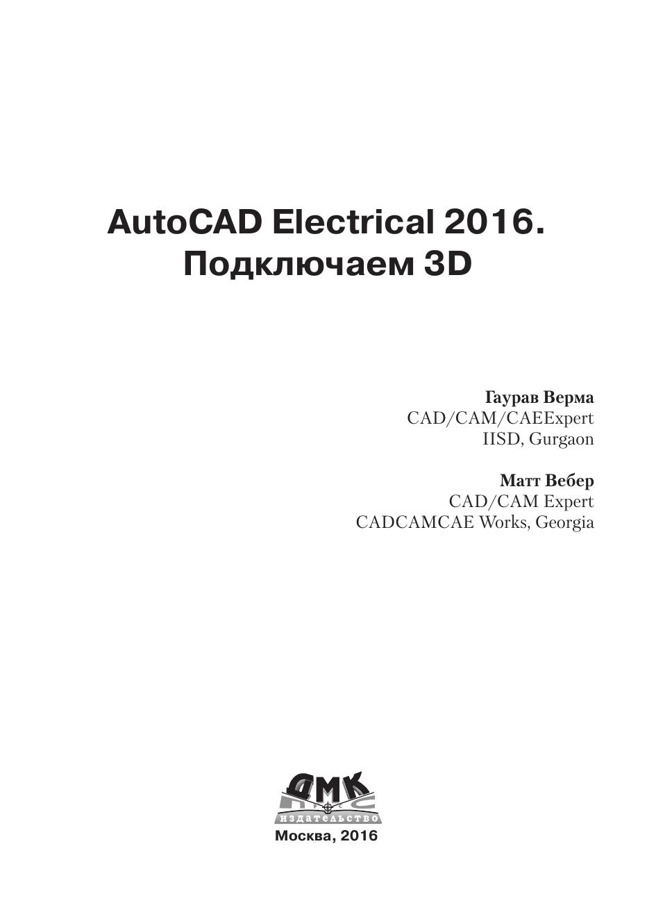 Это обновленное и дополненное издание книги «AutoCAD Electrical 2015 Подключайтесь!», при написании которой авторы ставили перед собой задачу сделать ее понятной и простой в освоении. По отзывам читателей цель была достигнута, и книга стала источником базовых знаний. Новое издание дополнено такими важными разделами, как настройка свойств проекта и создание пользовательских графических образов компонентов. Также рассмотрены инструменты создания 3D-объектов с электротехническими свойствами в программе Autodesk Inventor. Добавленные в версию 2016 инструменты электромеханической связи позволят интегрировать схемную часть проекта и трехмерную модель изделия, в чем так нуждается современное промышленное проектирование. Издание предназначено всем пользователям AutoCAD и Autodesk Inventor, которым необходимо в своей работе создавать электрические схемы и электромеханические объекты.
