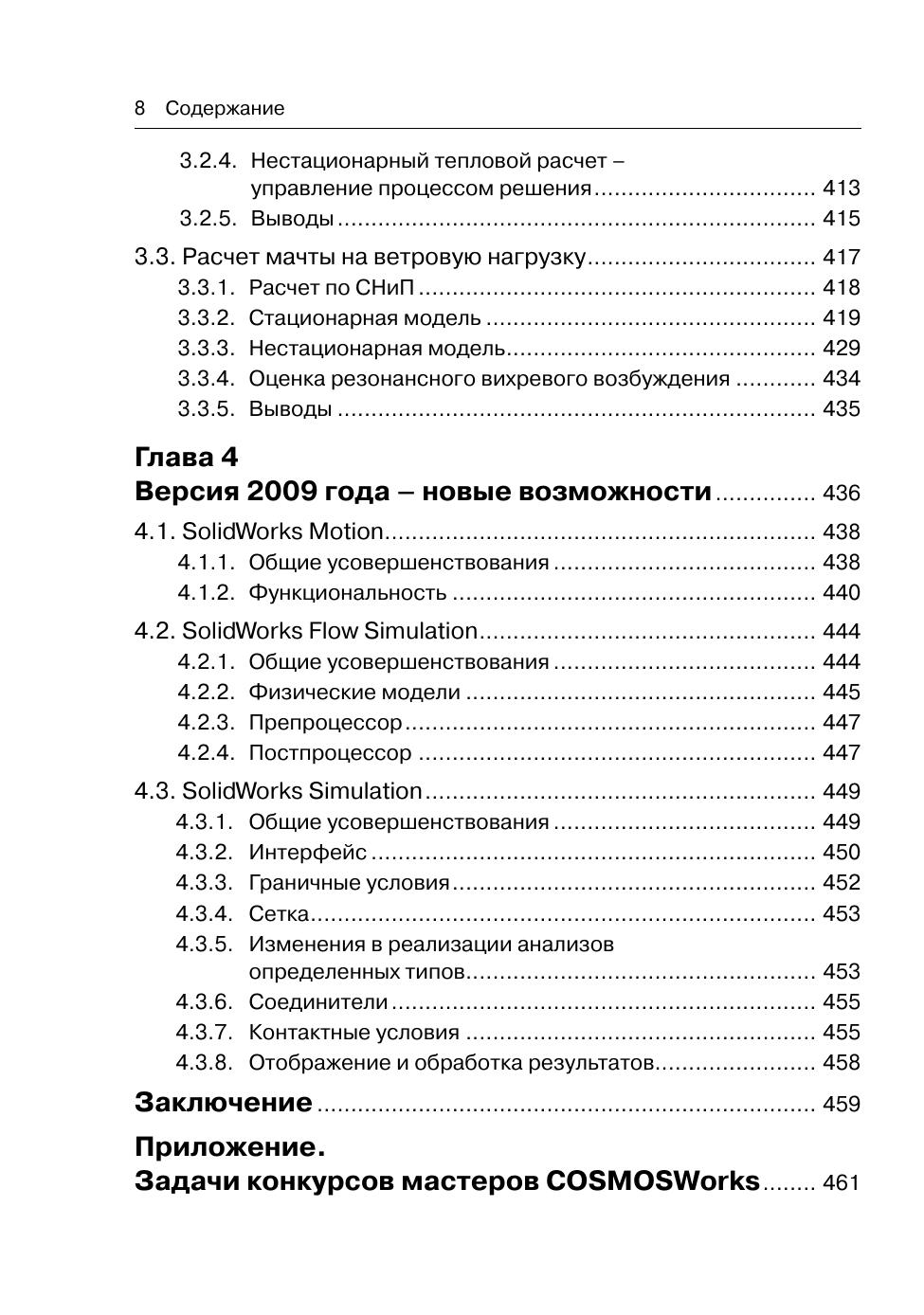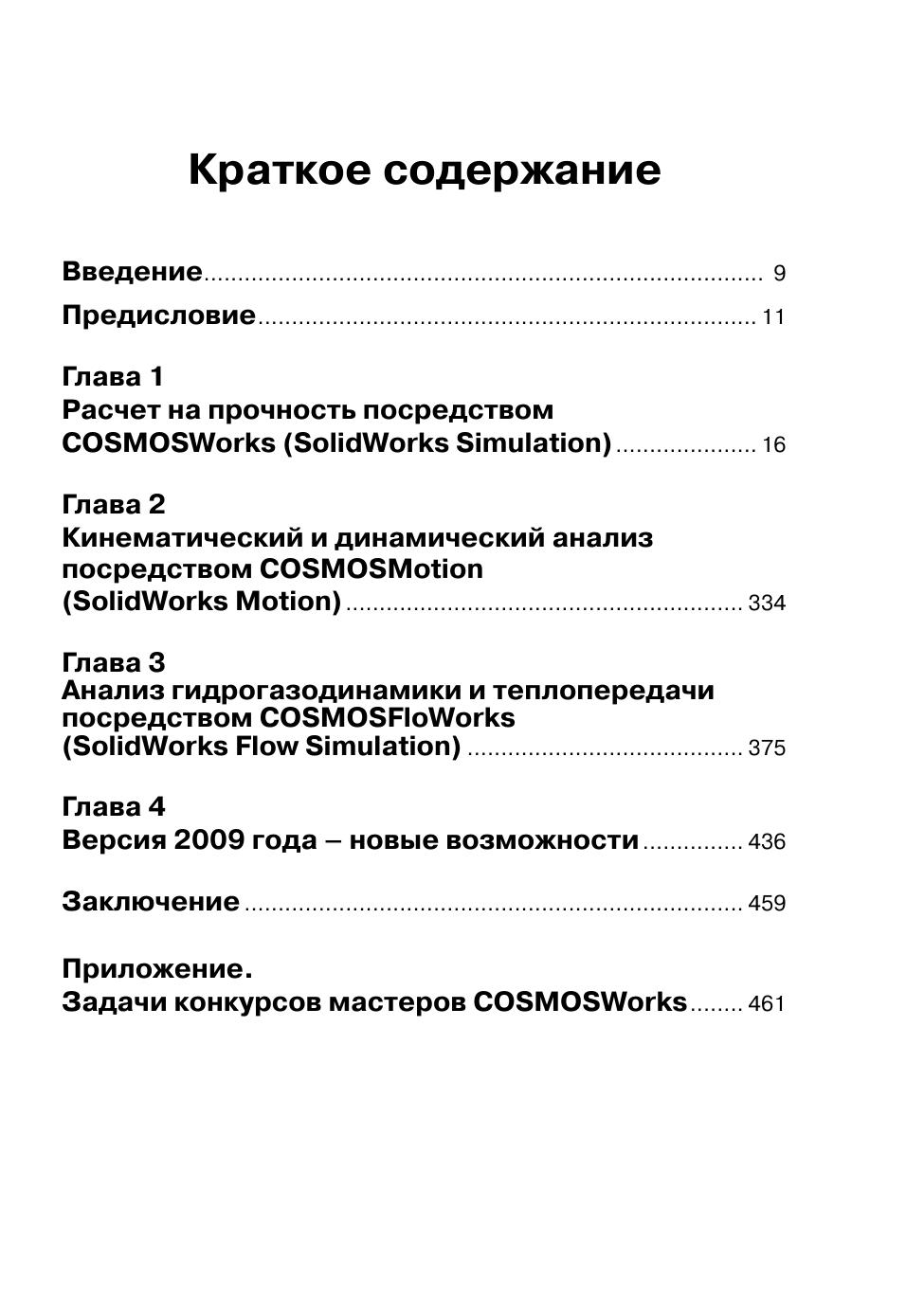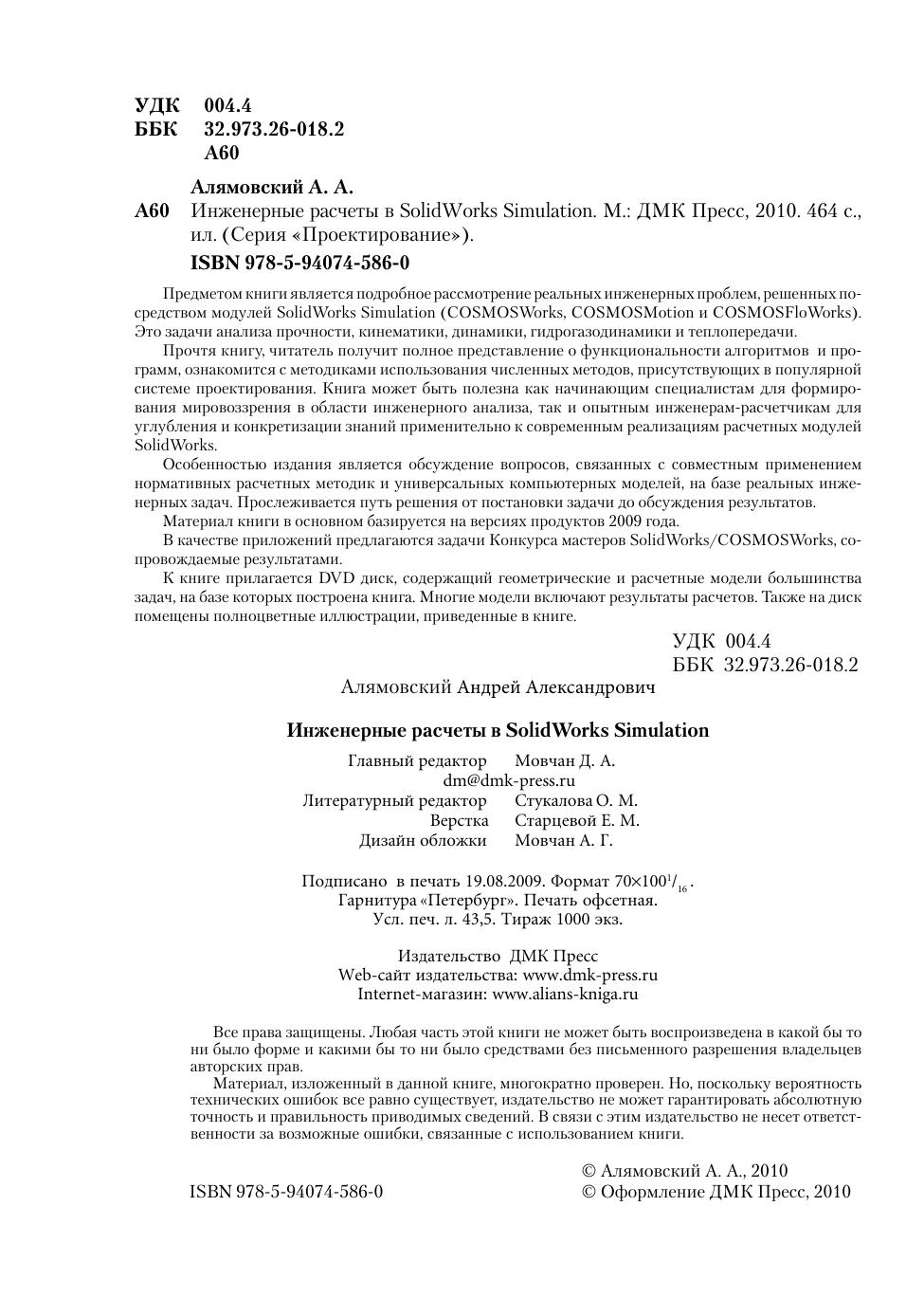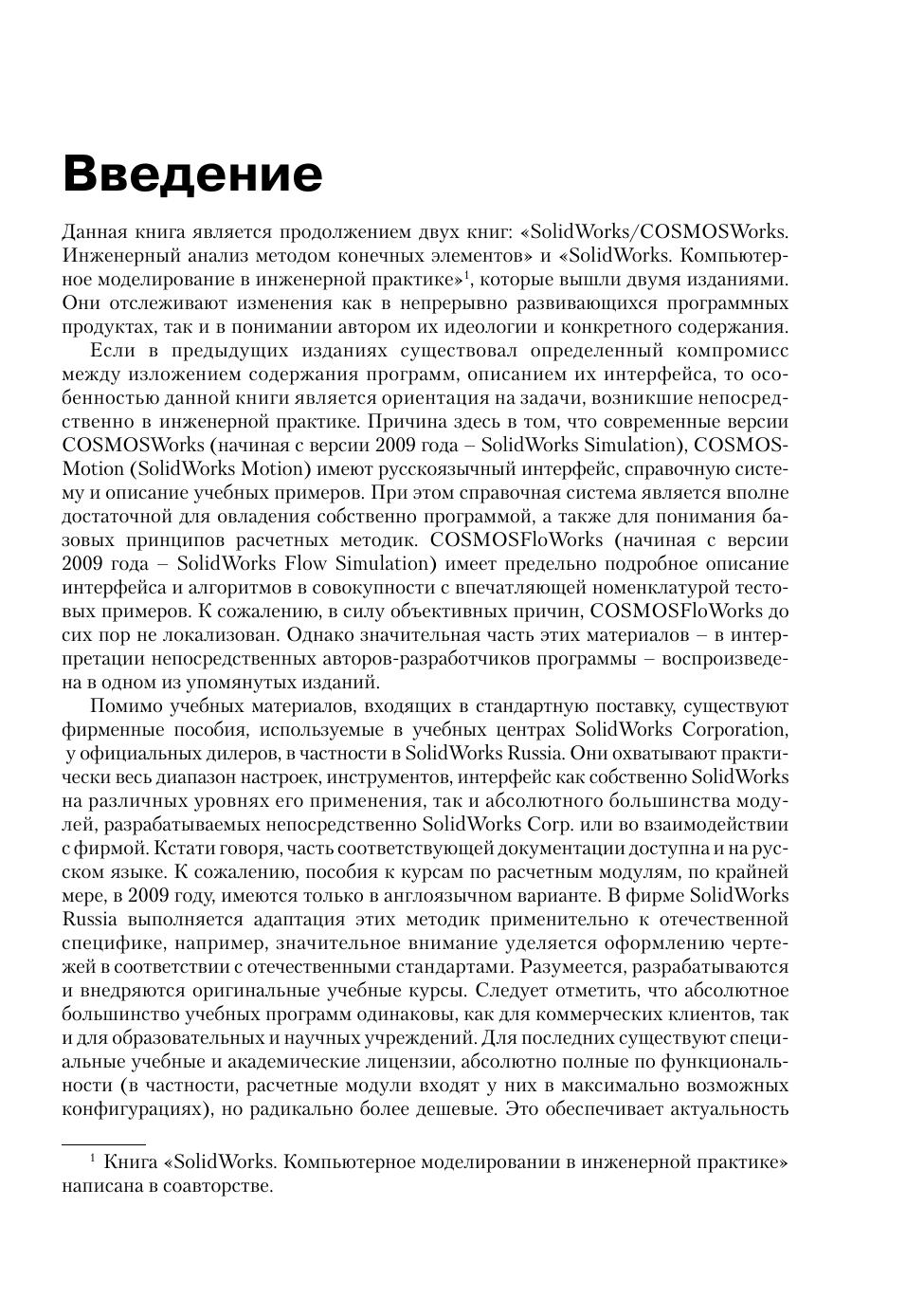 Предметом книги является подробное рассмотрение реальных инженерных проблем, решенных посредством модулей SolidWorks Simulation (COSMOSWorks, COSMOSMotion и COSMOSFloWorks). Это задачи анализа прочности, кинематики, динамики, гидрогазодинамики и теплопередачи. Прочтя книгу, читатель получит полное представление о функциональности алгоритмов и программ, ознакомится с методиками использования численных методов, присутствующих в популярной системе проектирования. Книга может быть полезна как начинающим специалистам для формирования мировоззрения в области инженерного анализа, так и опытным инженерам-расчетчикам для углубления и конкретизации знаний применительно к современным реализациям расчетных модулей SolidWorks. Особенностью издания является обсуждение вопросов, связанных с совместным применением нормативных расчетных методик и универсальных компьютерных моделей, на базе реальных инженерных задач. Прослеживается путь решения от постановки задачи до обсуждения результатов. Материал книги в основном базируется на версиях продуктов 2009 года. В качестве приложений предлагаются задачи Конкурса мастеров SolidWorks/COSMOSWorks, сопровождаемые результатами.