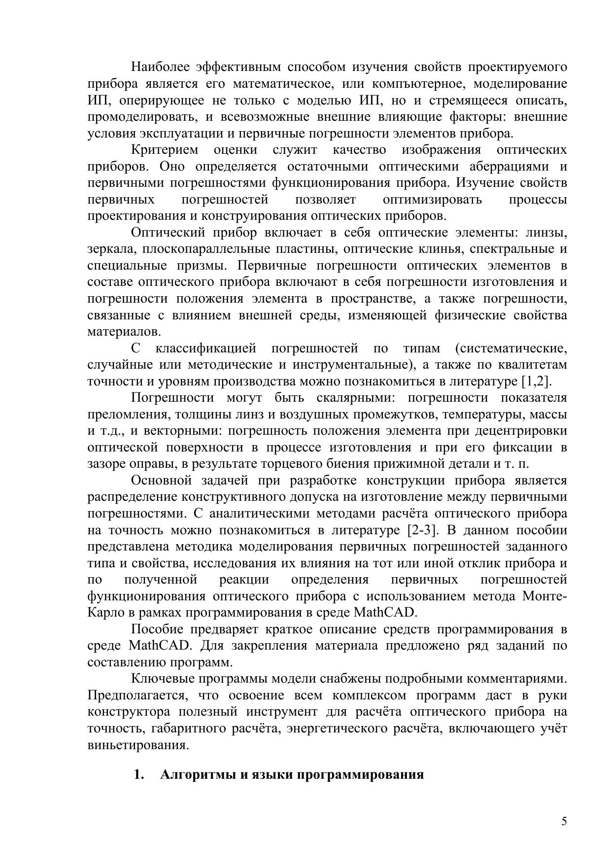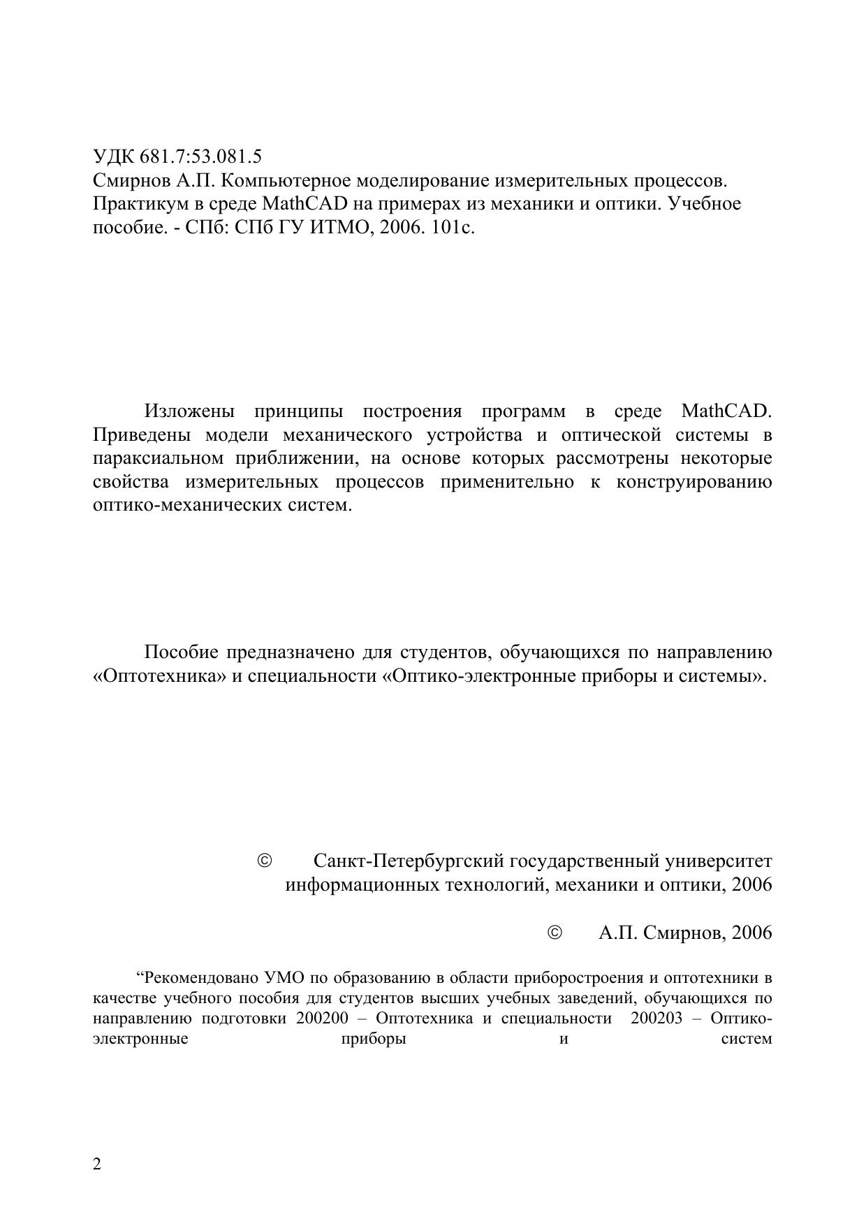 Изложены принципы построения программ в среде MathCAD. Приведены модели механического устройства и оптической системы в параксиальном приближении, на основе которых рассмотрены некоторые свойства измерительных процессов применительно к конструированию оптико-механических систем. Пособие предназначено для студентов, обучающихся по направлению «Оптотехника» и специальности «Оптико-электронные приборы и системы».