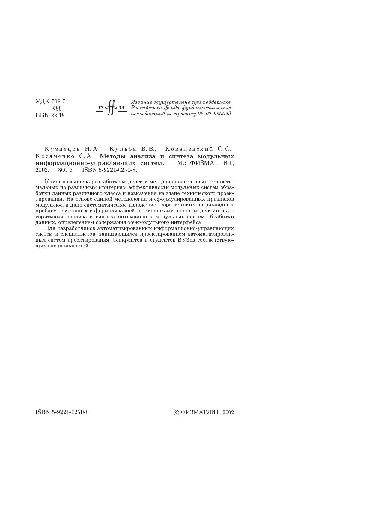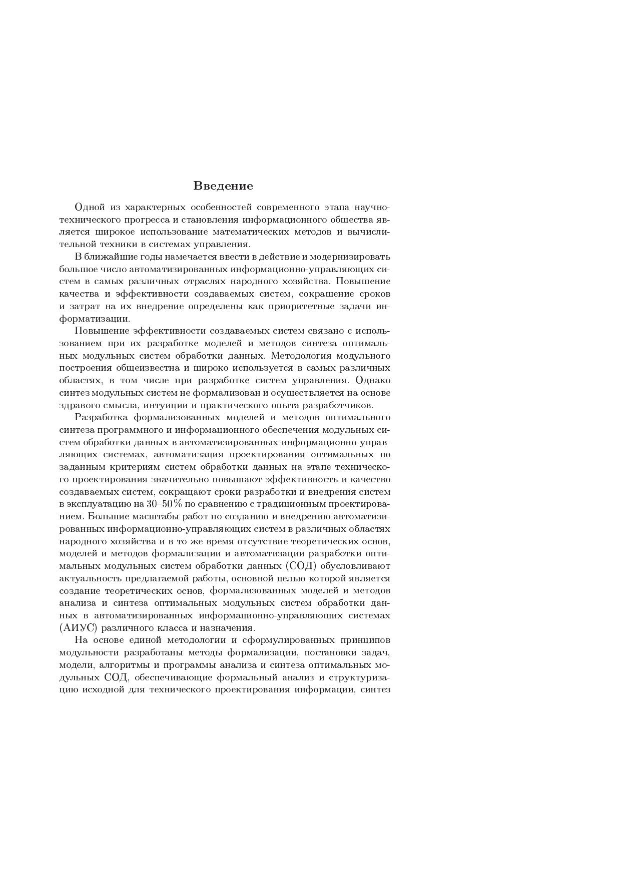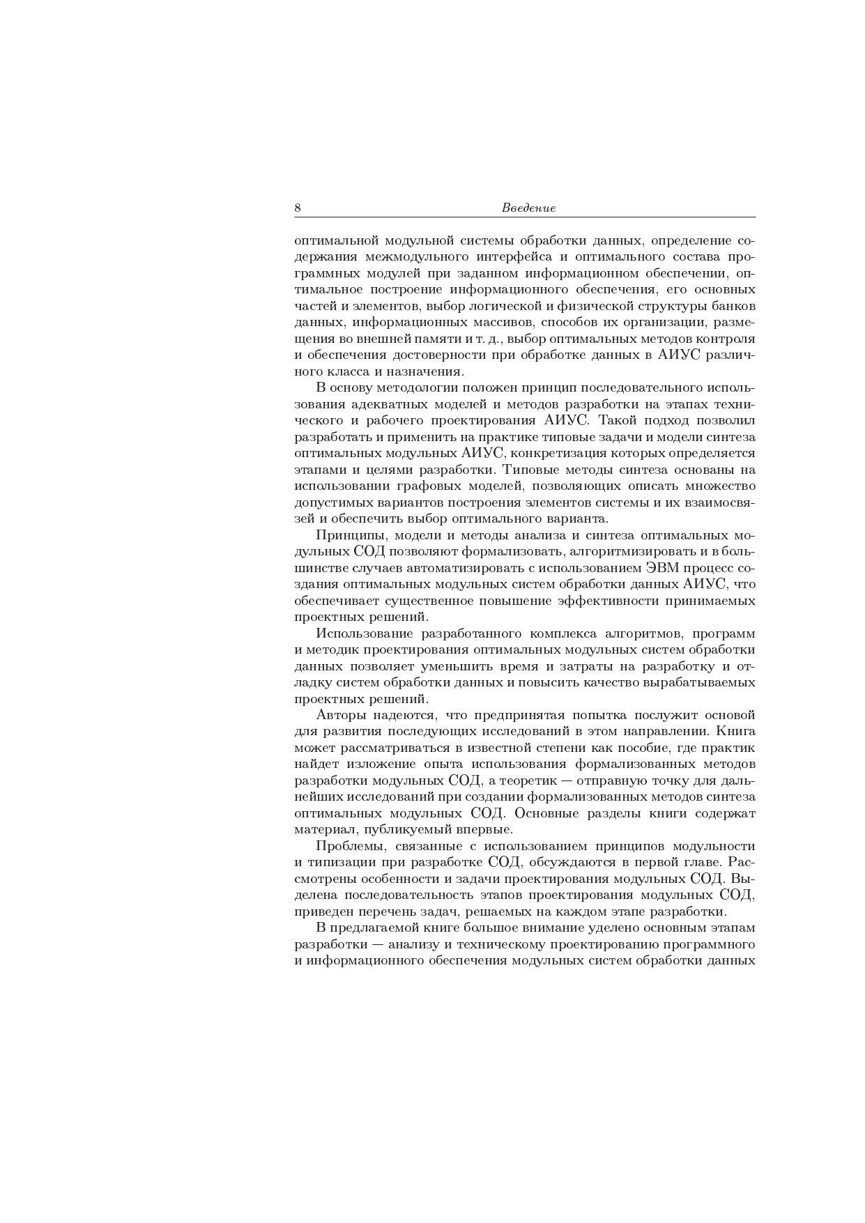 Книга посвящена разработке моделей и методов анализа и синтеза оптимальных по различным критериям эффективности модульных систем обработки данных различного класса и назначения на этапе технического проектирования. На основе единой методологии и сформулированных признаков модульности дано систематическое изложение теоретических и прикладных проблем, связанных с формализацией, постановками задач, моделями и алгоритмами анализа и синтеза оптимальных модульных систем обработки данных, определением содержания межмодульного интерфейса. Для разработчиков автоматизированных информационно-управляющих систем и специалистов, занимающихся проектированием автоматизированных систем проектирования, аспирантов и студентов вузов соответствующих специальностей.