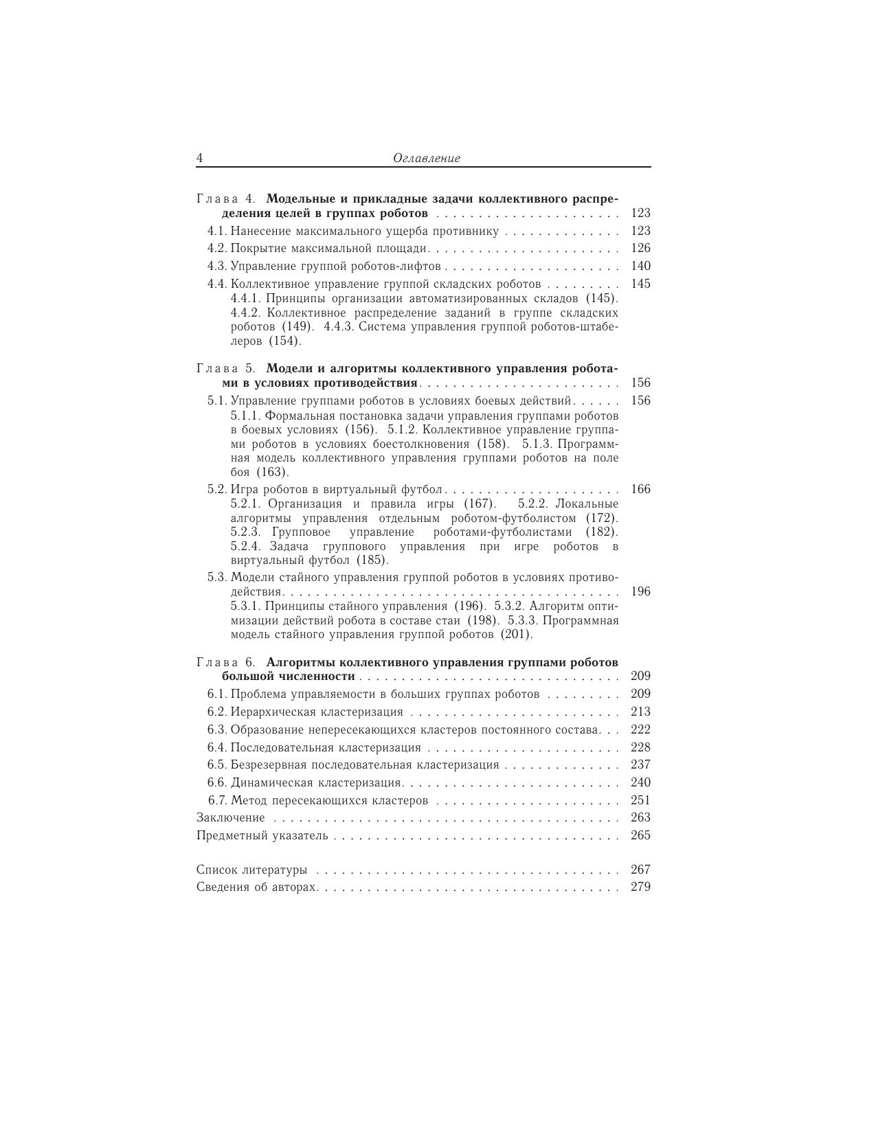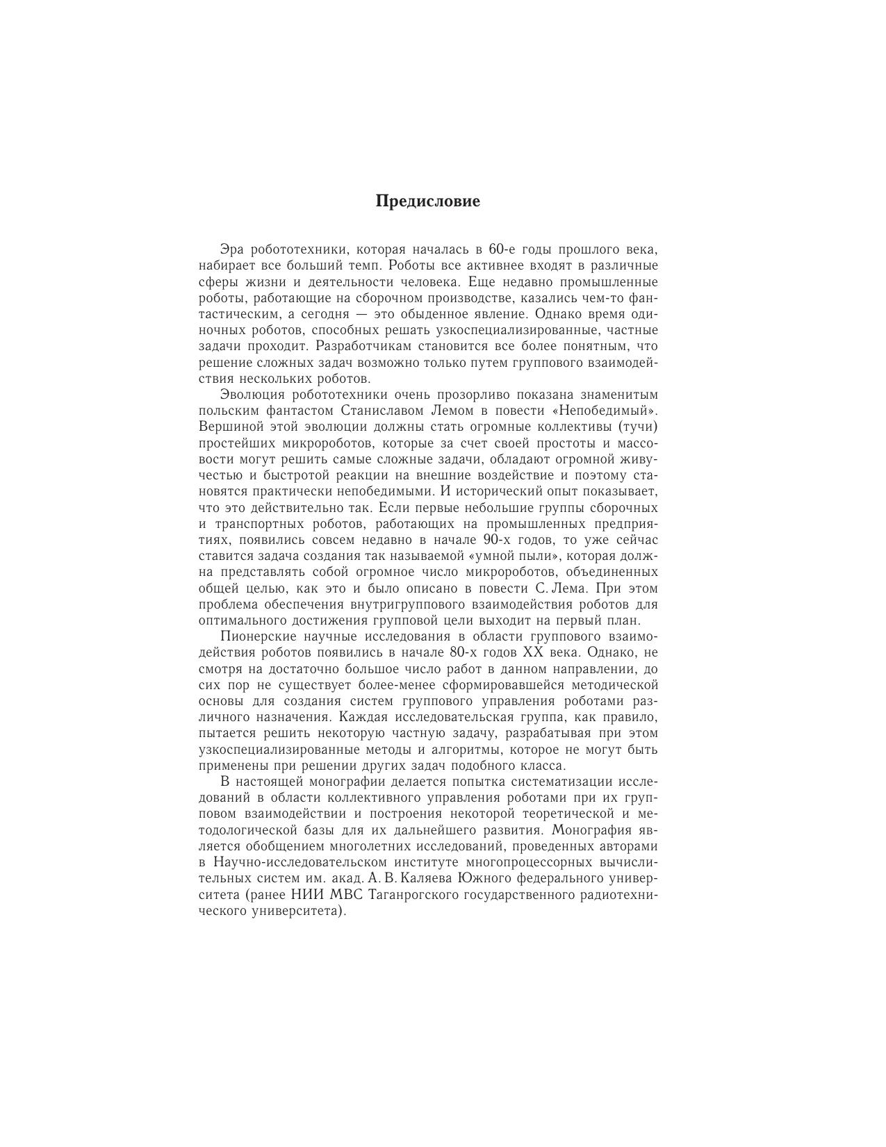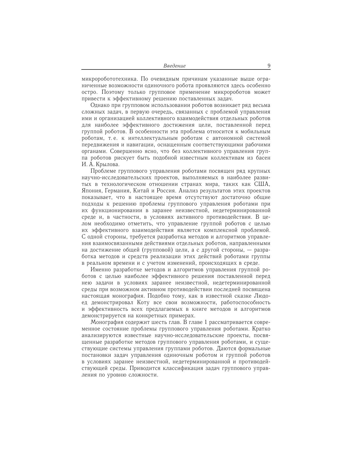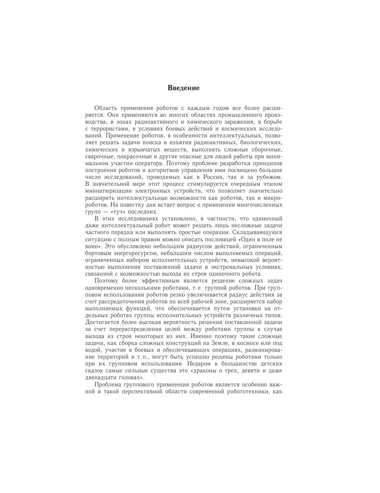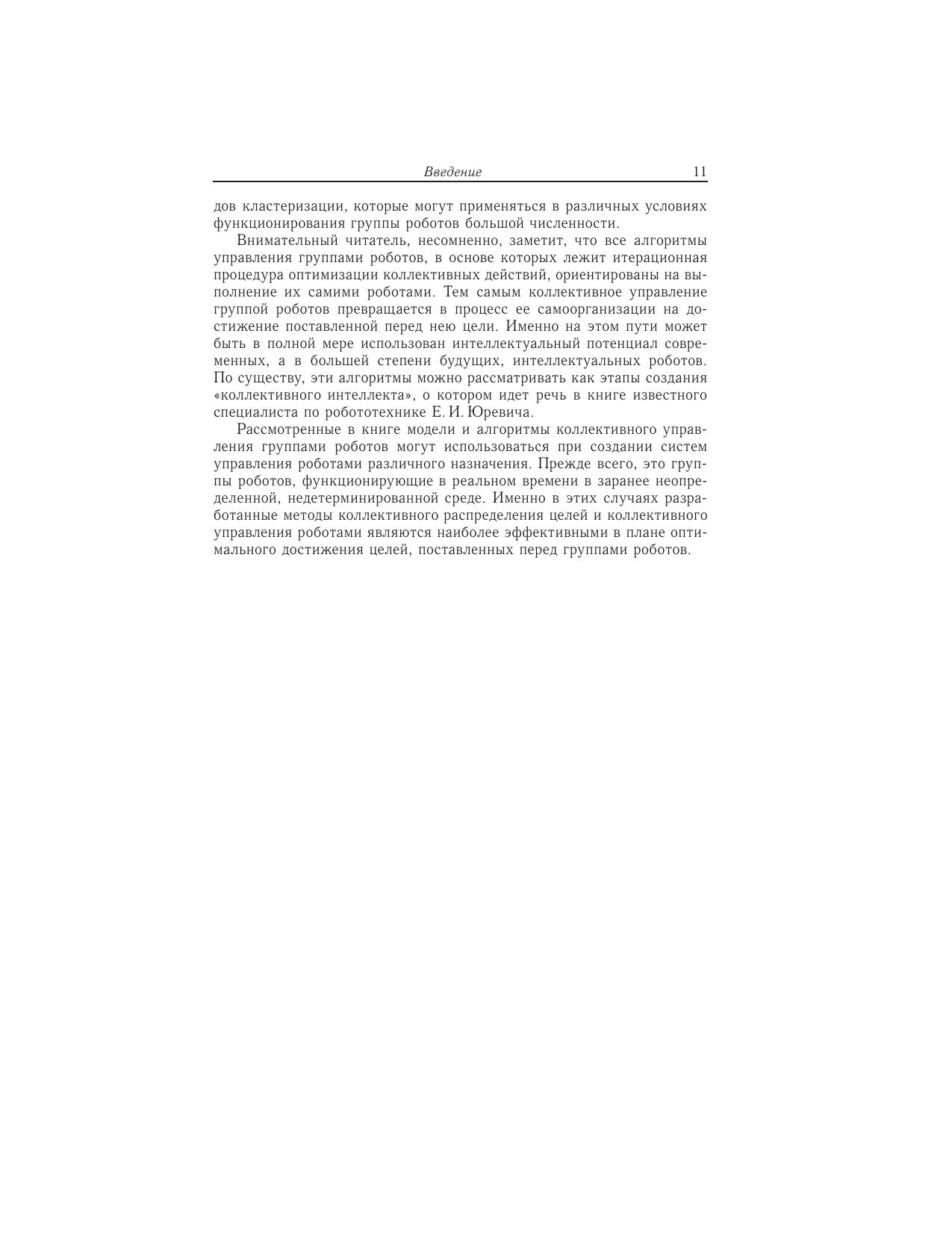 Рассматривается современное состояние проблемы группового управления роботами. Дается формальная постановка задачи управления группой роботов в условиях заранее неизвестной, недетерминированной и противодействующей среды. Формулируется задача коллективного управления в группе роботов. Предлагается подход к решению данной задачи, в основе которого лежит итерационная процедура оптимизации коллективных действий в группе роботов. Рассматриваются алгоритмы решения задач оптимального распределения целей между роботами группы, а также алгоритмы коллективного управления роботами в условиях активного противодействия среды, реализующие указанную итерационную процедуру. Предлагаются оригинальные методы решения проблемы управления большими группами, состоящими из сотен и даже тысяч роботов. Для научных работников, инженеров, аспирантов, магистрантов и студентов старших курсов, специализирующихся в области разработки и создания систем управления групповым взаимодействием роботов, функционирующих в условиях заранее неизвестной и динамически изменяющейся обстановки.