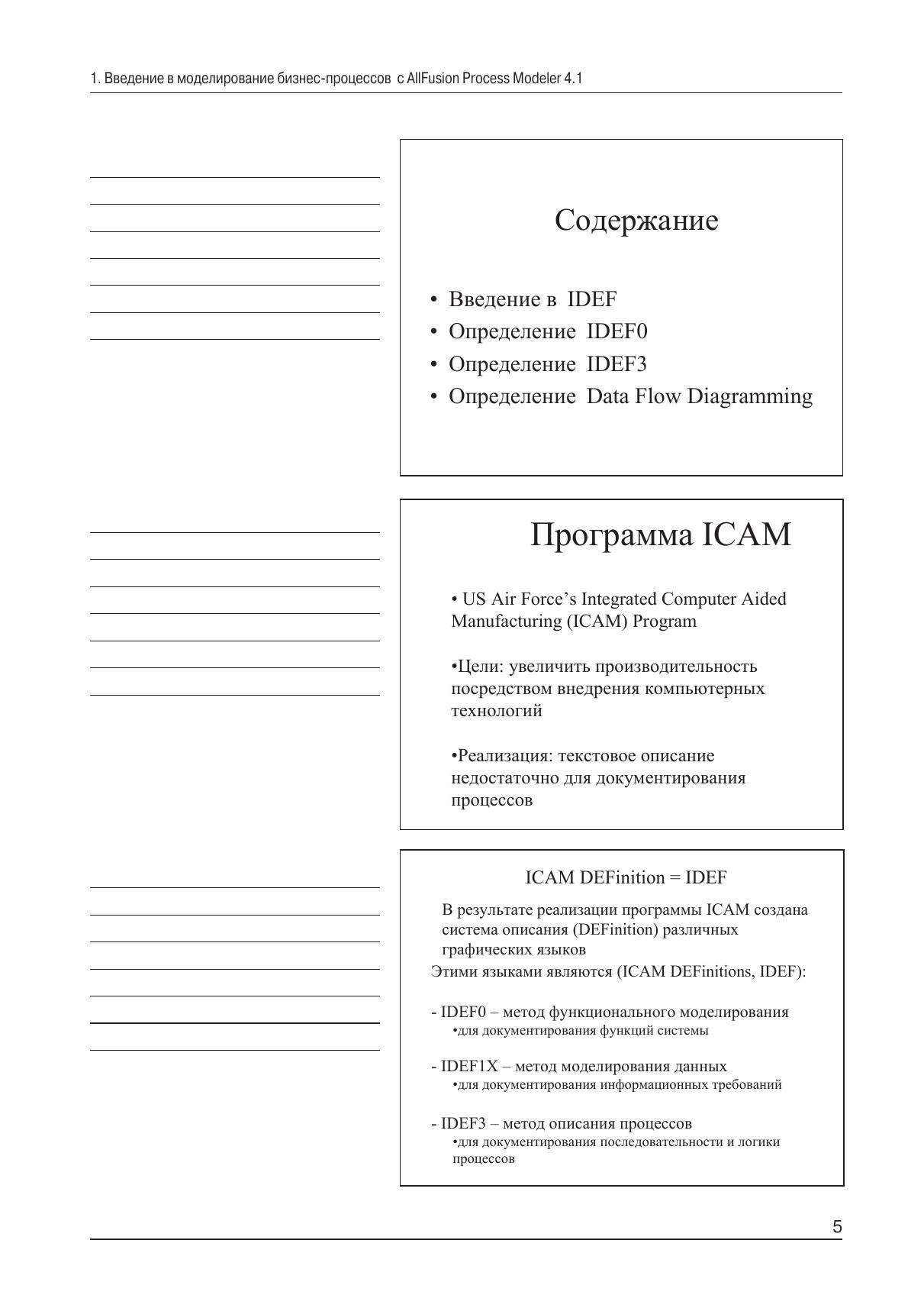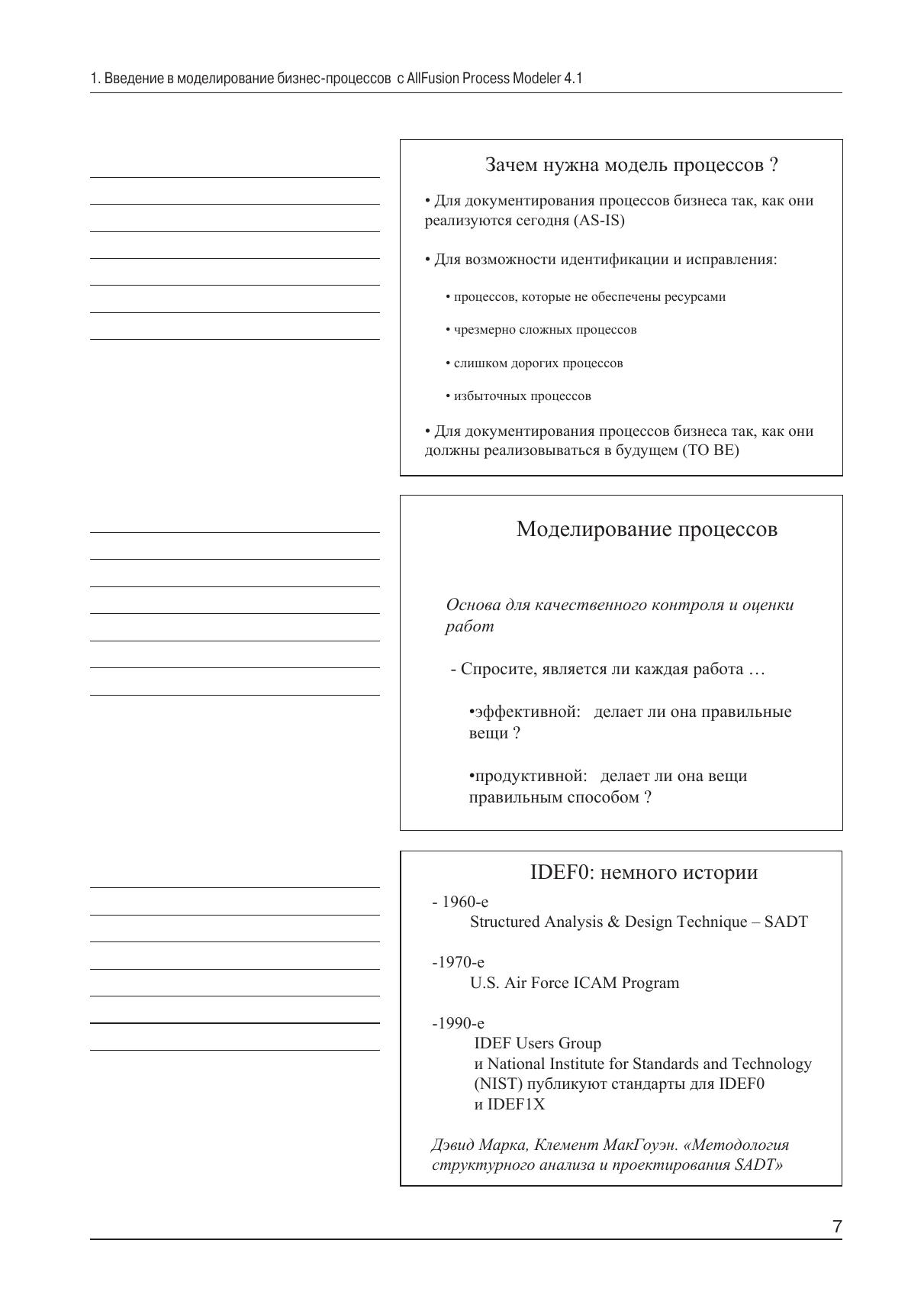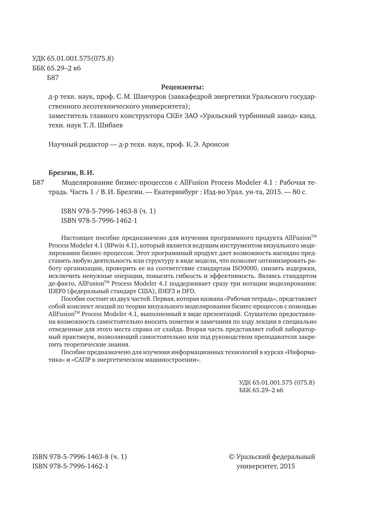 Настоящее пособие предназначено для изучения программного продукта AllFusionTM Process Modeler 4.1 (BPwin 4.1), который является ведущим инструментом визуального моделирования бизнес-процессов. Этот программный продукт дает возможность наглядно представить любую деятельность или структуру в виде модели, что позволит оптимизировать работу организации, проверить ее на соответствие стандартам ISO9000, снизить издержки, исключить ненужные операции, повысить гибкость и эффективность. Являясь стандартом де-факто, AllFusionTM Process Modeler 4.1 поддерживает сразу три нотации моделирования: IDEF0 (федеральный стандарт США), IDEF3 и DFD. Пособие состоит из двух частей. Первая, которая названа «Рабочая тетрадь», представляет собой конспект лекций по теории визуального моделирования бизнес-процессов с помощью AllFusionTM Process Modeler 4.1, выполненный в виде презентаций. Слушателю предоставлена возможность самостоятельно вносить пометки и замечания по ходу лекции в специально отведенные для этого места справа от слайда. Вторая часть представляет собой лабораторный практикум, позволяющий самостоятельно или под руководством преподавателя закрепить теоретические знания. Пособие предназначено для изучения информационных технологий в курсах «Информатика» и «САПР в энергетическом машиностроении».