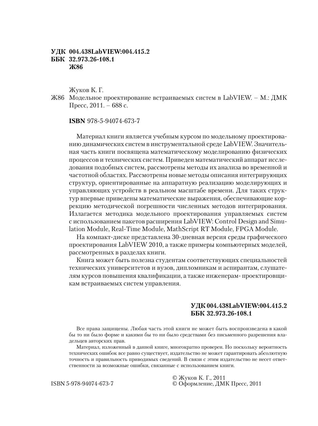 Материал книги является учебным курсом по модельному проектированию динамических систем в инструментальной среде LabVIEW. Значительная часть книги посвящена математическому моделированию физических процессов и технических систем. Приведен математический аппарат исследования подобных систем, рассмотрены методы их анализа во временной и частотной областях. Рассмотрены новые методы описания интегрирующих структур, ориентированные на аппаратную реализацию моделирующих и управляющих устройств в реальном масштабе времени. Для таких структур впервые приведены математические выражения, обеспечивающие коррекцию методической погрешности численных методов интегрирования. Излагается методика модельного проектирования управляемых систем с использованием пакетов расширения LabVIEW: Control Design and Simu lation Module, Real Time Module, MathScript RT Module, FPGA Module. Книга может быть полезна студентам соответствующих специальностей технических университетов и вузов, дипломникам и аспирантам, слушателям курсов повышения квалификации, а также инженерам-проектировщикам встраиваемых систем управления.