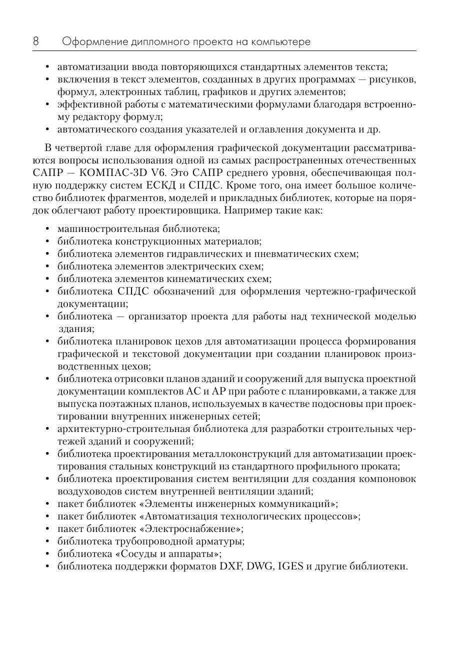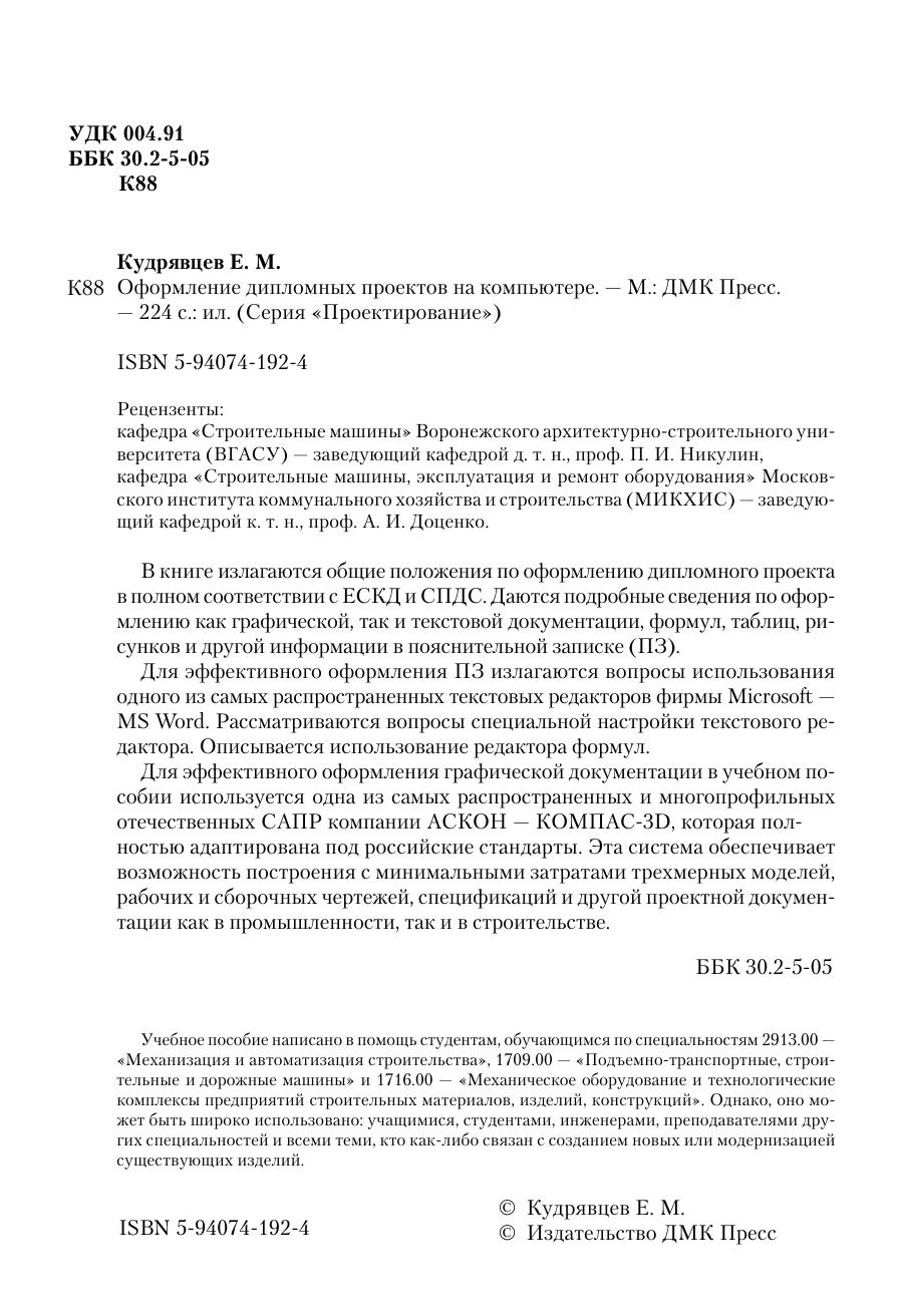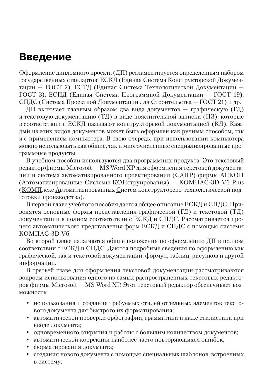 В книге излагаются общие положения по оформлению дипломного проекта в полном соответствии с ЕСКД и СПДС. Даются подробные сведения по оформлению как графической, так и текстовой документации, формул, таблиц, рисунков и другой информации в пояснительной записке (ПЗ). Для эффективного оформления ПЗ излагаются вопросы использования одного из самых распространенных текстовых редакторов фирмы Microsoft — MS Word. Рассматриваются вопросы специальной настройки текстового редактора. Описывается использование редактора формул. Для эффективного оформления графической документации в учебном пособии используется одна из самых распространенных и многопрофильных отечественных САПР компании АСКОН — КОМПАС 3D, которая полностью адаптирована под российские стандарты. Эта система обеспечивает возможность построения с минимальными затратами трехмерных моделей, рабочих и сборочных чертежей, спецификаций и другой проектной документации как в промышленности, так и в строительстве.