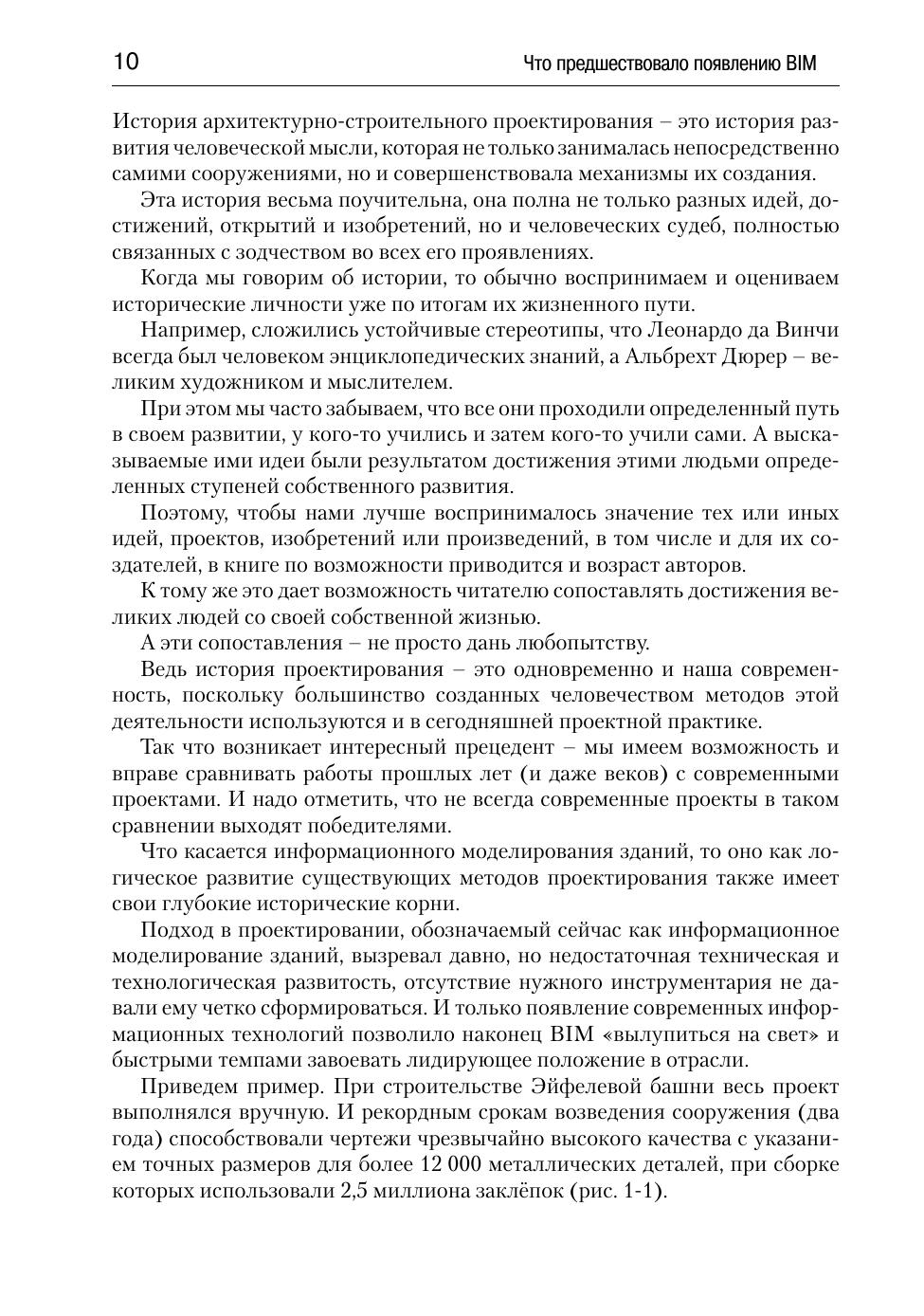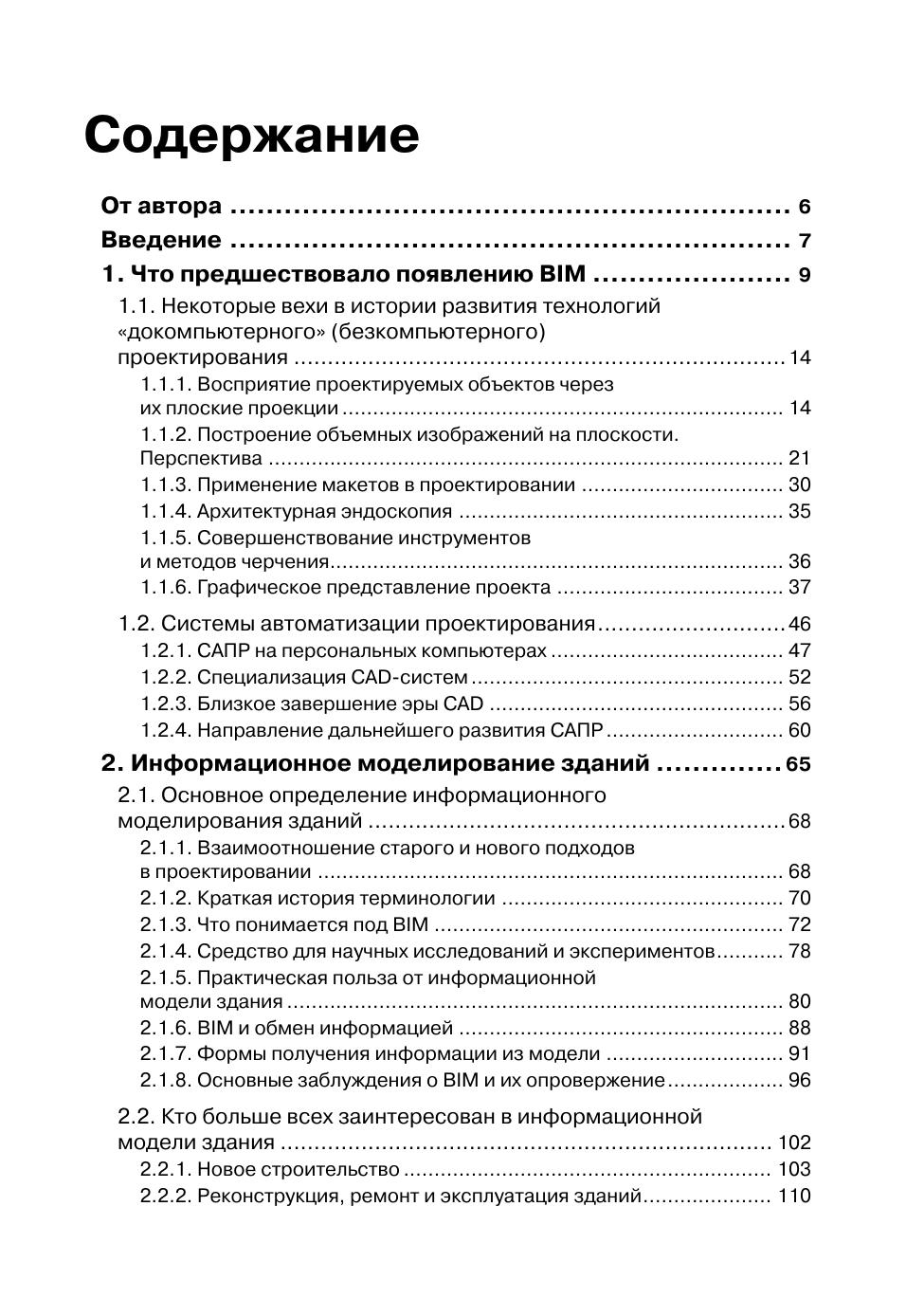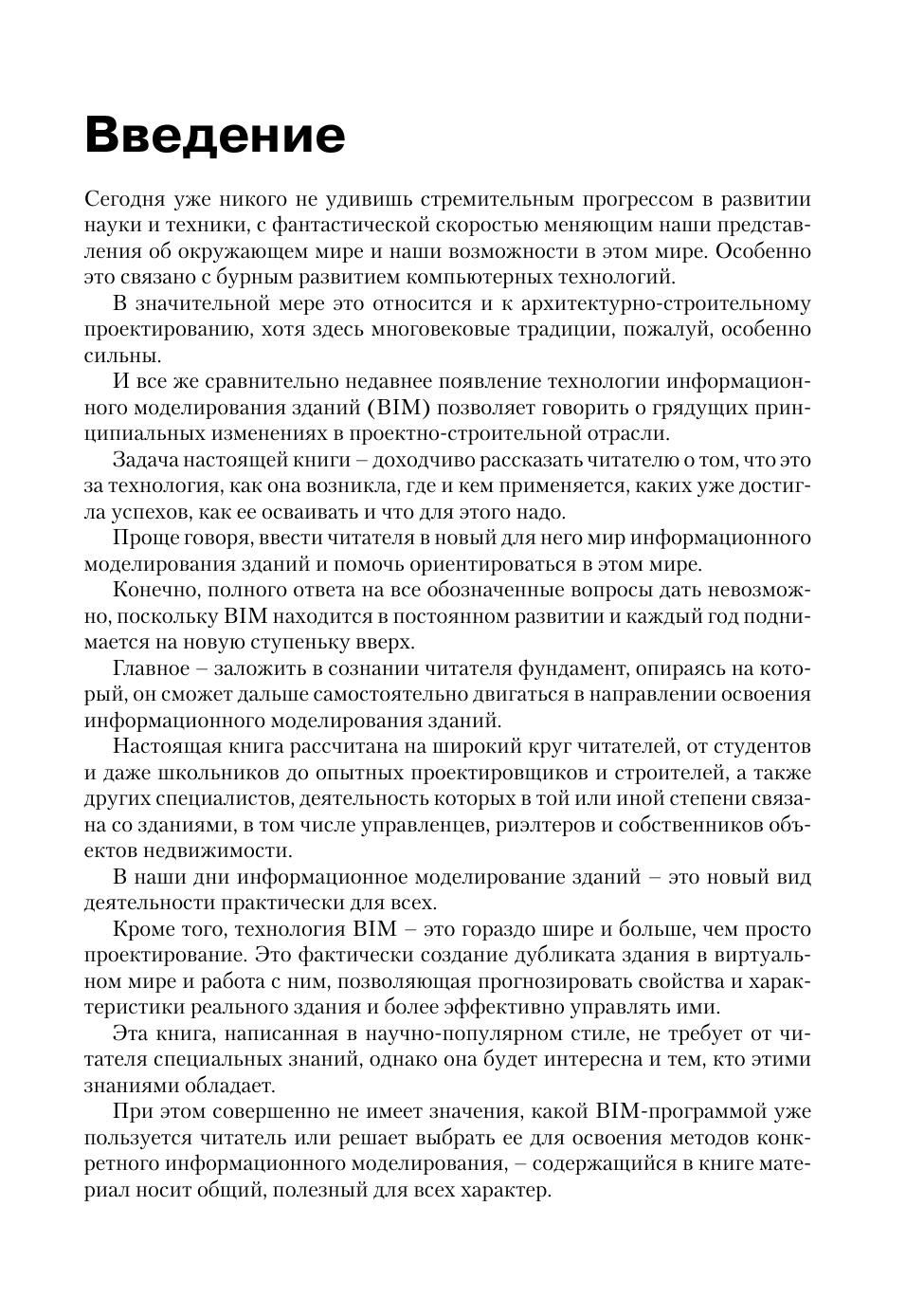 Эта книга посвящена новейшей технологии компьютерного проектирования – Информационному моделированию зданий (BIM) и является первым изданием по этой теме на русском языке. Технология BIM возникла сравнительно недавно, но за последние годы активно становится доминирующей в мировой проектно-строительной практике, заменяя все ранее применявшиеся методы проектирования. В нашей стране она только начала внедряться, но уже хорошо известна специалистам, работающим с программами Autodesk Revit, Graphisoft ArchiCAD, Nemetschek Allplan, Bentley Architecture, Tekla Structures и некоторыми другими. Настоящая монография является не только исследованием вопросов, связанных с новой технологией, но и учебником по основам BIM, популярно объясняющим, что такое информационное моделирование зданий, как оно возникло, где и кем используется, как его внедрять в проектную практику и что для этого необходимо. Книга не требует специальных знаний и рассчитана на самый широкий круг читателей: архитекторов и конструкторов, инженеров и строителей, эксплуатационщиков и собственников зданий, специалистов по информационным технологиям в строительстве, руководителей различного уровня, студентов и школьников. Она поможет каждому разобраться и сориентироваться в этой совершенно новой области применения компьютерных технологий, за которой – большое будущее.