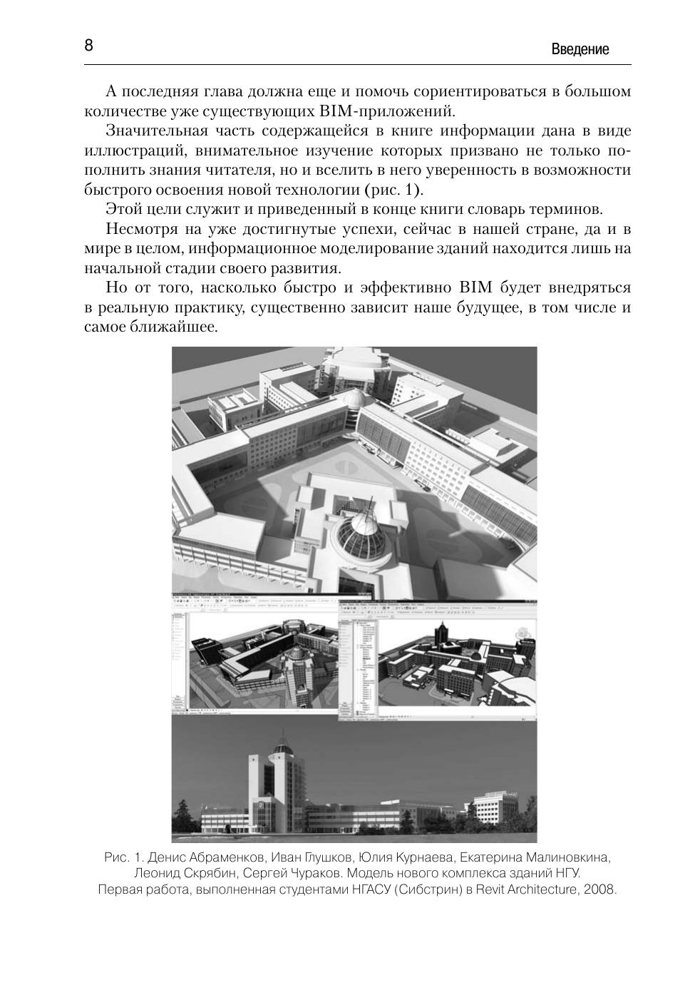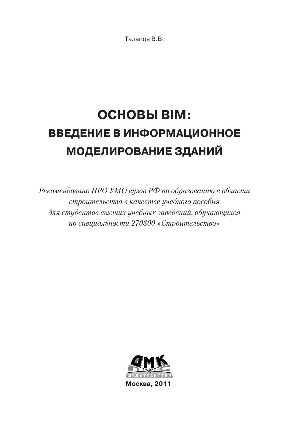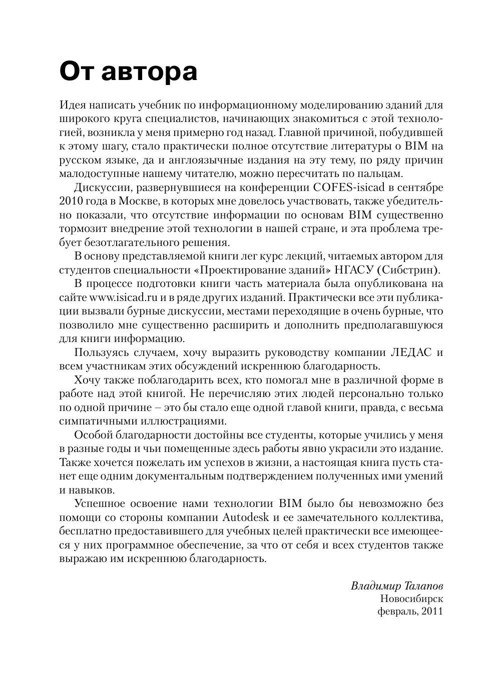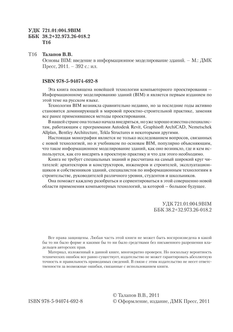 Эта книга посвящена новейшей технологии компьютерного проектирования – Информационному моделированию зданий (BIM) и является первым изданием по этой теме на русском языке. Технология BIM возникла сравнительно недавно, но за последние годы активно становится доминирующей в мировой проектно-строительной практике, заменяя все ранее применявшиеся методы проектирования. В нашей стране она только начала внедряться, но уже хорошо известна специалистам, работающим с программами Autodesk Revit, Graphisoft ArchiCAD, Nemetschek Allplan, Bentley Architecture, Tekla Structures и некоторыми другими. Настоящая монография является не только исследованием вопросов, связанных с новой технологией, но и учебником по основам BIM, популярно объясняющим, что такое информационное моделирование зданий, как оно возникло, где и кем используется, как его внедрять в проектную практику и что для этого необходимо. Книга не требует специальных знаний и рассчитана на самый широкий круг читателей: архитекторов и конструкторов, инженеров и строителей, эксплуатационщиков и собственников зданий, специалистов по информационным технологиям в строительстве, руководителей различного уровня, студентов и школьников. Она поможет каждому разобраться и сориентироваться в этой совершенно новой области применения компьютерных технологий, за которой – большое будущее.