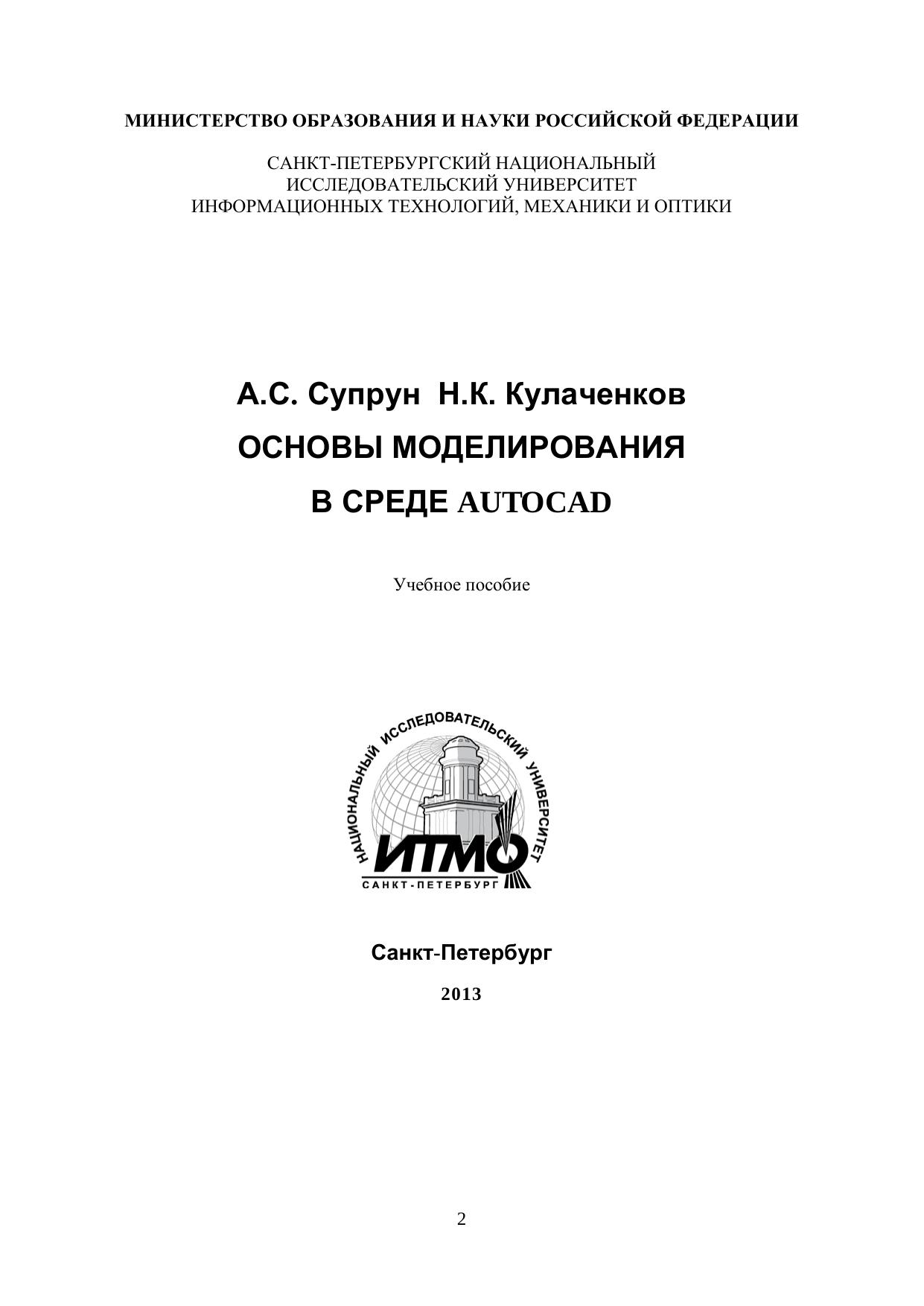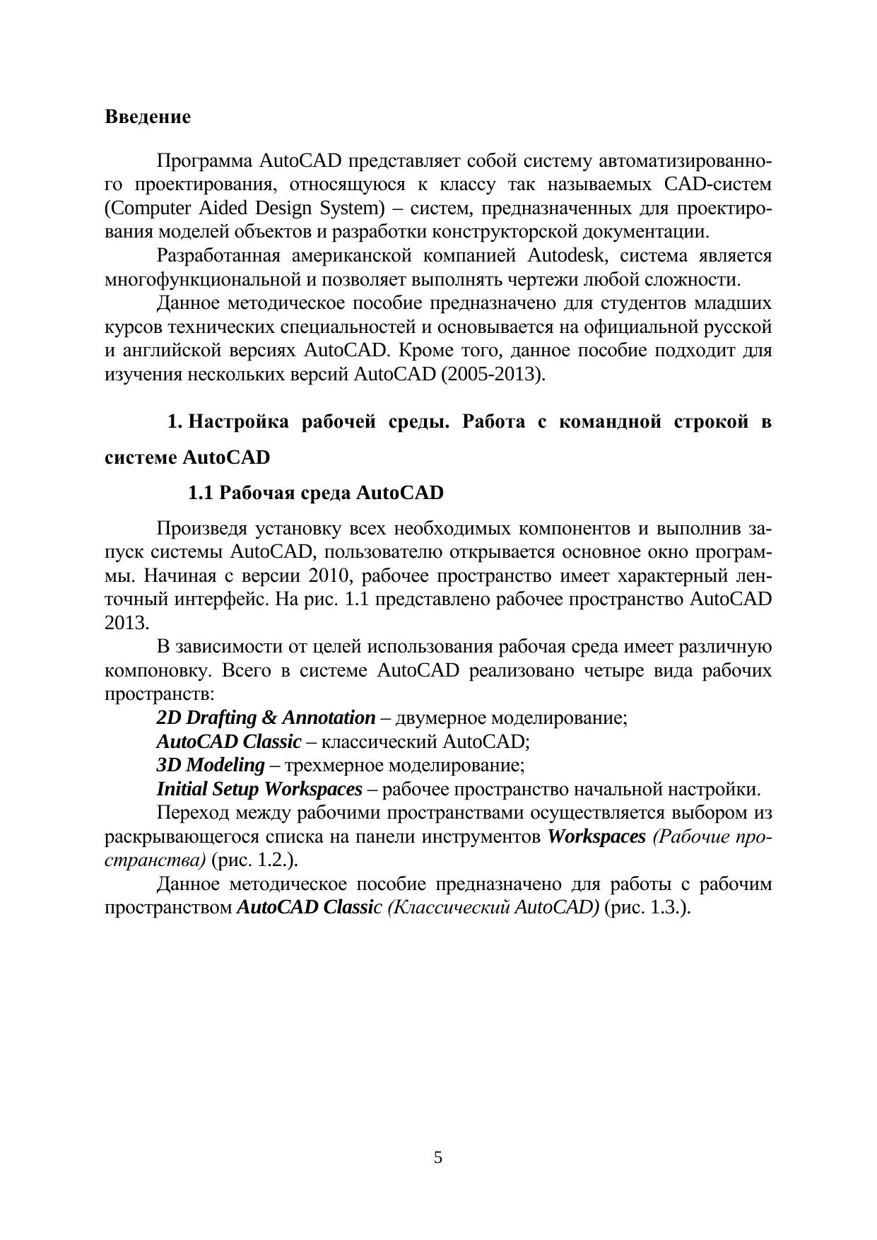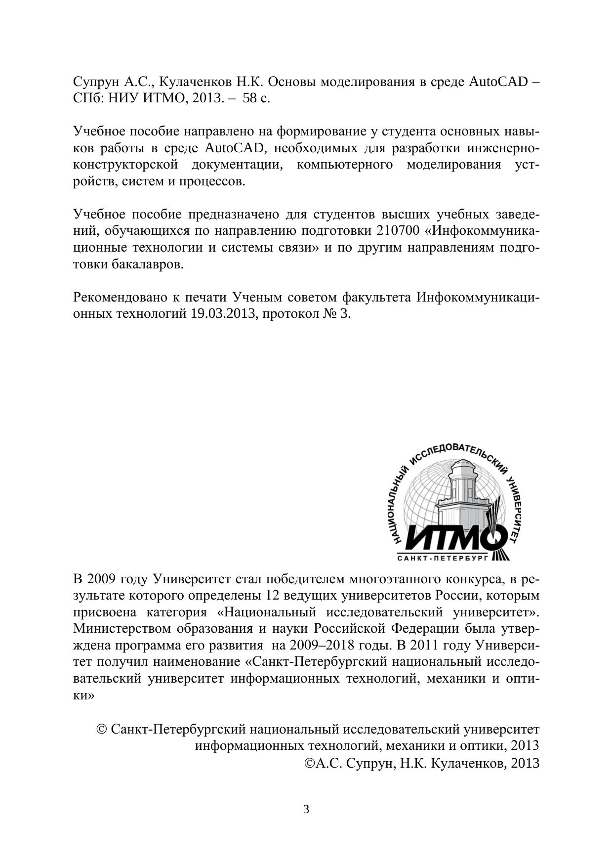 Учебное пособие направлено на формирование у студента основных навыков работы в среде AutoCAD, необходимых для разработки инженерно-конструкторской документации, компьютерного моделирования устройств, систем и процессов. Учебное пособие предназначено для студентов высших учебных заведений, обучающихся по направлению подготовки 210700 «Инфокоммуникационные технологии и системы связи» и по другим направлениям подготовки бакалавров.