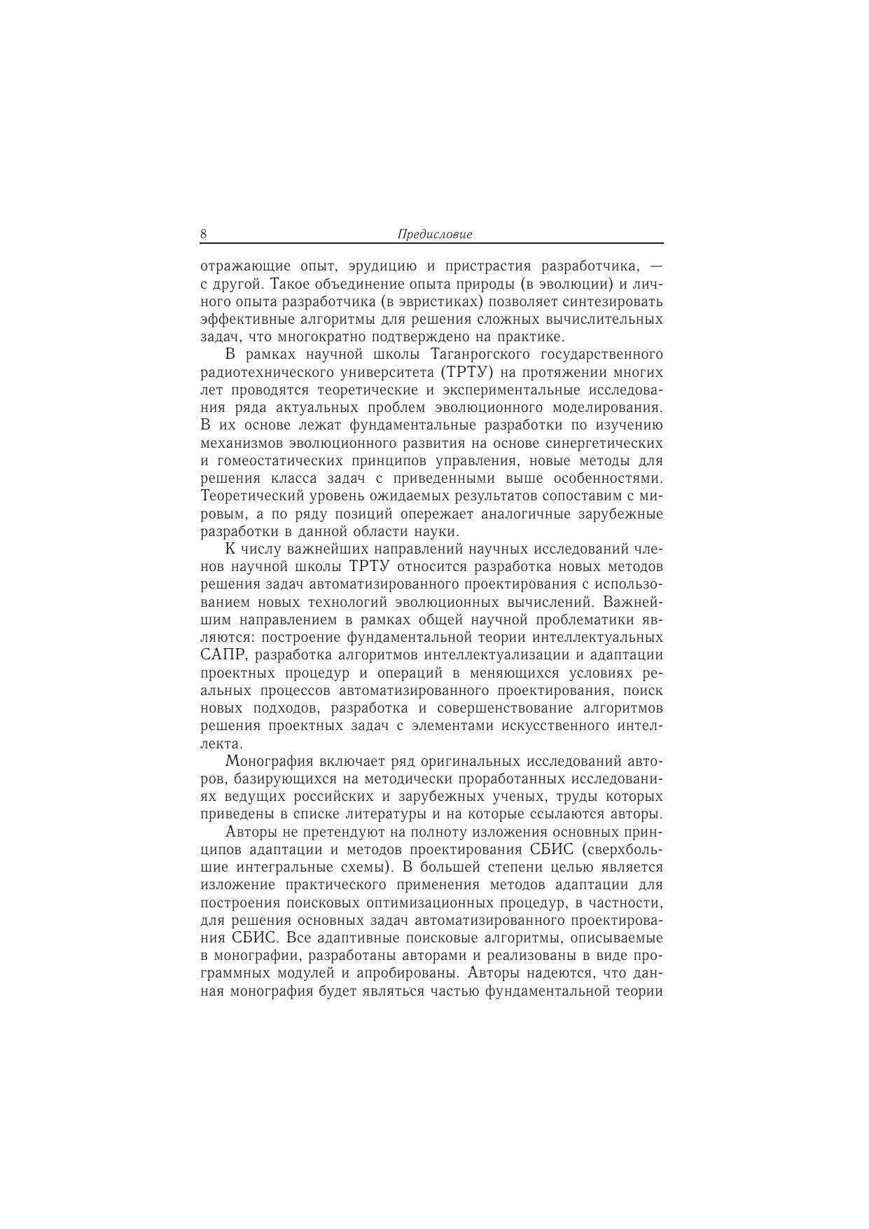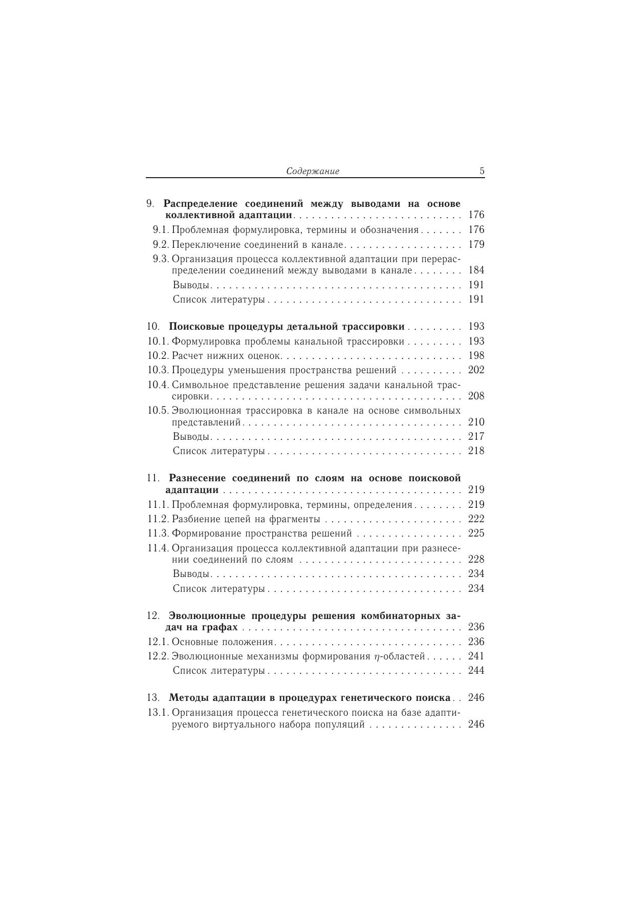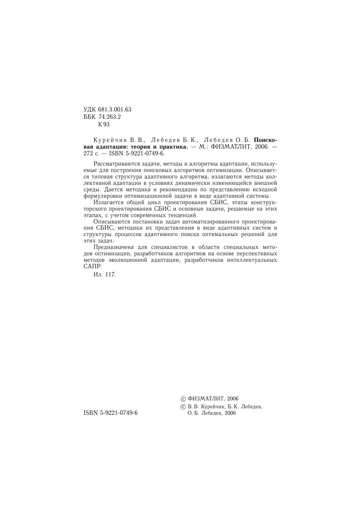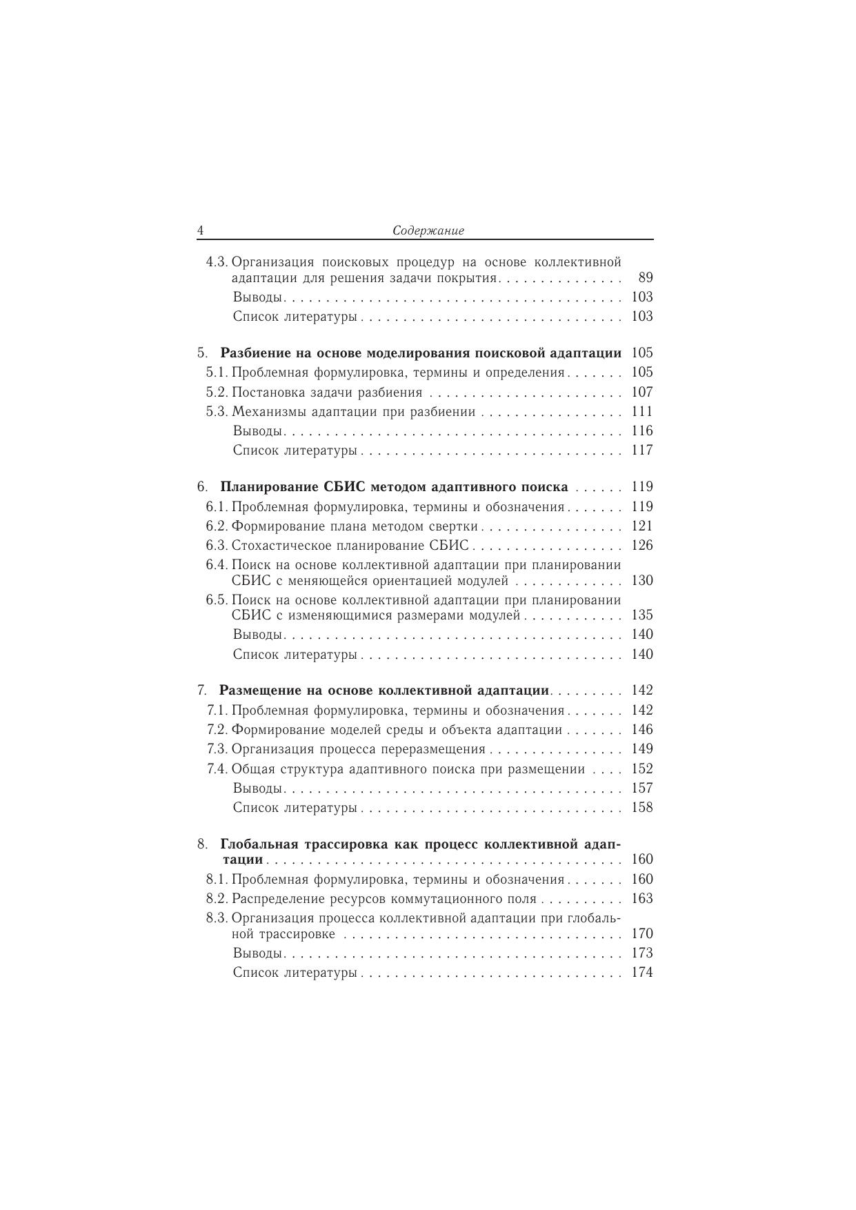Рассматриваются задачи, методы и алгоритмы адаптации, используемые для построения поисковых алгоритмов оптимизации. Описывается типовая структура адаптивного алгоритма, излагаются методы коллективной адаптации в условиях динамически изменяющейся внешней среды. Дается методика и рекомендации по представлению исходной формулировки оптимизационной задачи в виде адаптивной системы. Излагается общий цикл проектирования СБИС, этапы конструкторского проектирования СБИС и основные задачи, решаемые на этих этапах, с учетом современных тенденций. Описываются постановки задач автоматизированного проектирования СБИС, методики их представления в виде адаптивных систем и структуры процессов адаптивного поиска оптимальных решений для этих задач. Предназначена для специалистов в области специальных методов оптимизации, разработчиков алгоритмов на основе перспективных методов эволюционной адаптации, разработчиков интеллектуальных САПР