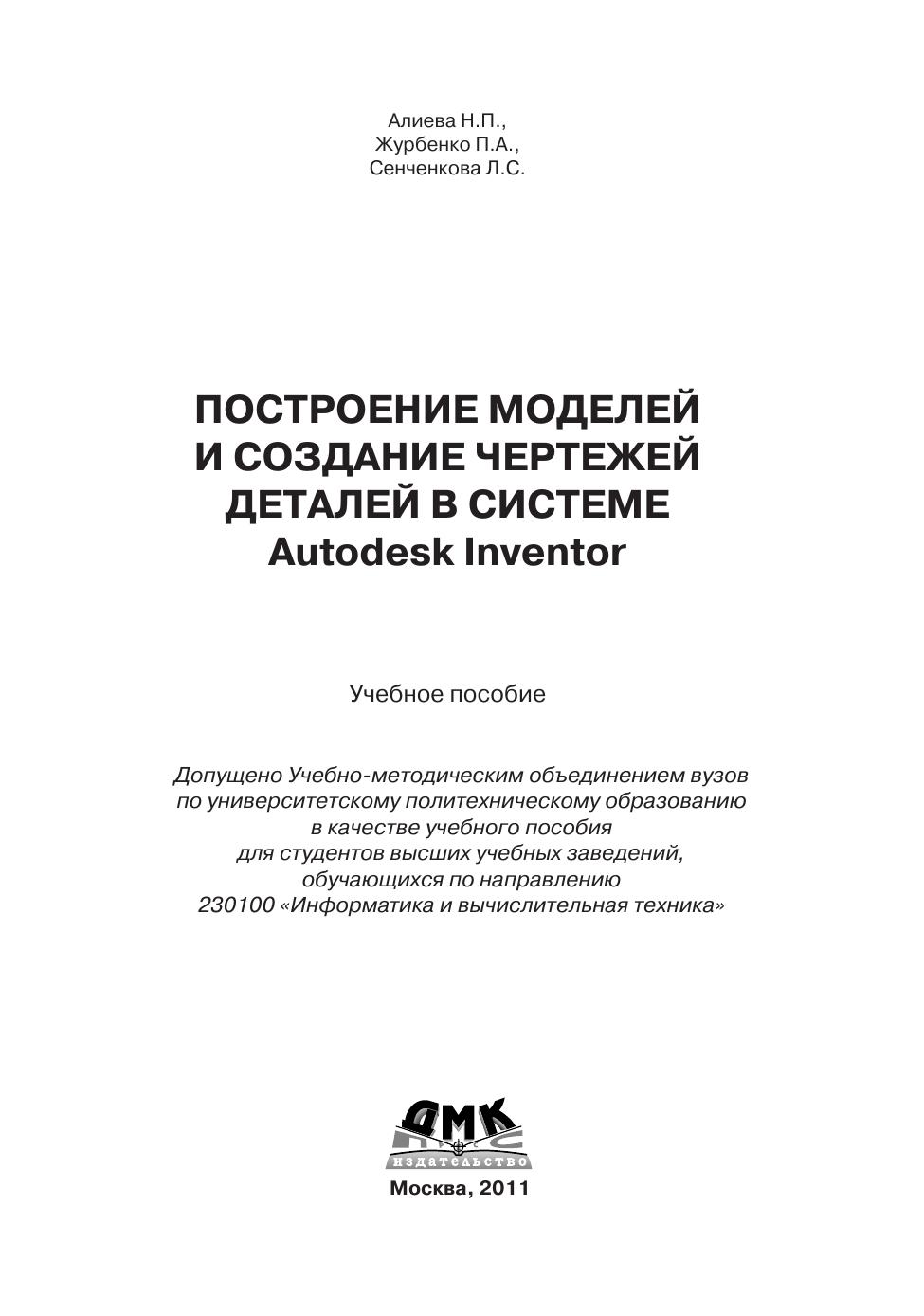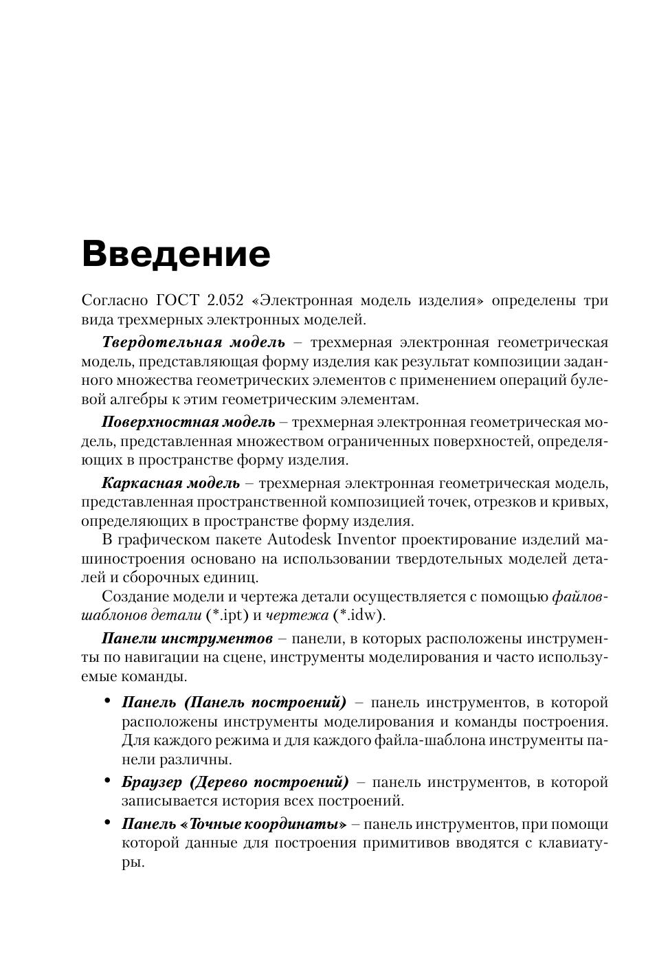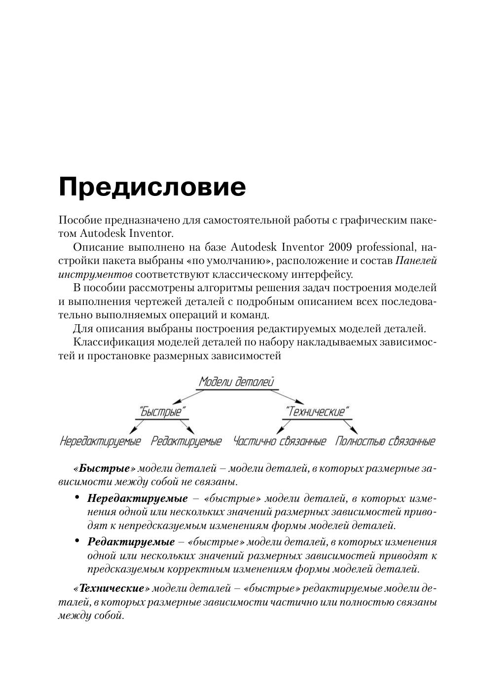 В пособии освещаются вопросы, связанные с использованием графического пакета Autodesk Inventor в курсе инженерной графики, т.е. построение моделей и создание чертежей деталей. Моделирование начинается с построения плоских контуров. Этому посвящена первая часть пособия. Во второй части рассмотрено построение моделей, создание чертежей простых геометрических тел и деталей типа «тела вращения» и «не тела вращения». В приложении приведены задания для самостоятельной работы. Большое число иллюстраций и достаточно подробное изложение материала позволяет использовать это пособие для самообучения. Книга подготовлена на основе опыта преподавания компьютерной графики как раздела дисциплины «Инженерная графика» в МГТУ им. Н.Э. Баумана. Данное издание учитывает все требования государственных стандартов Единой системы конструкторской документации (ЕСКД).