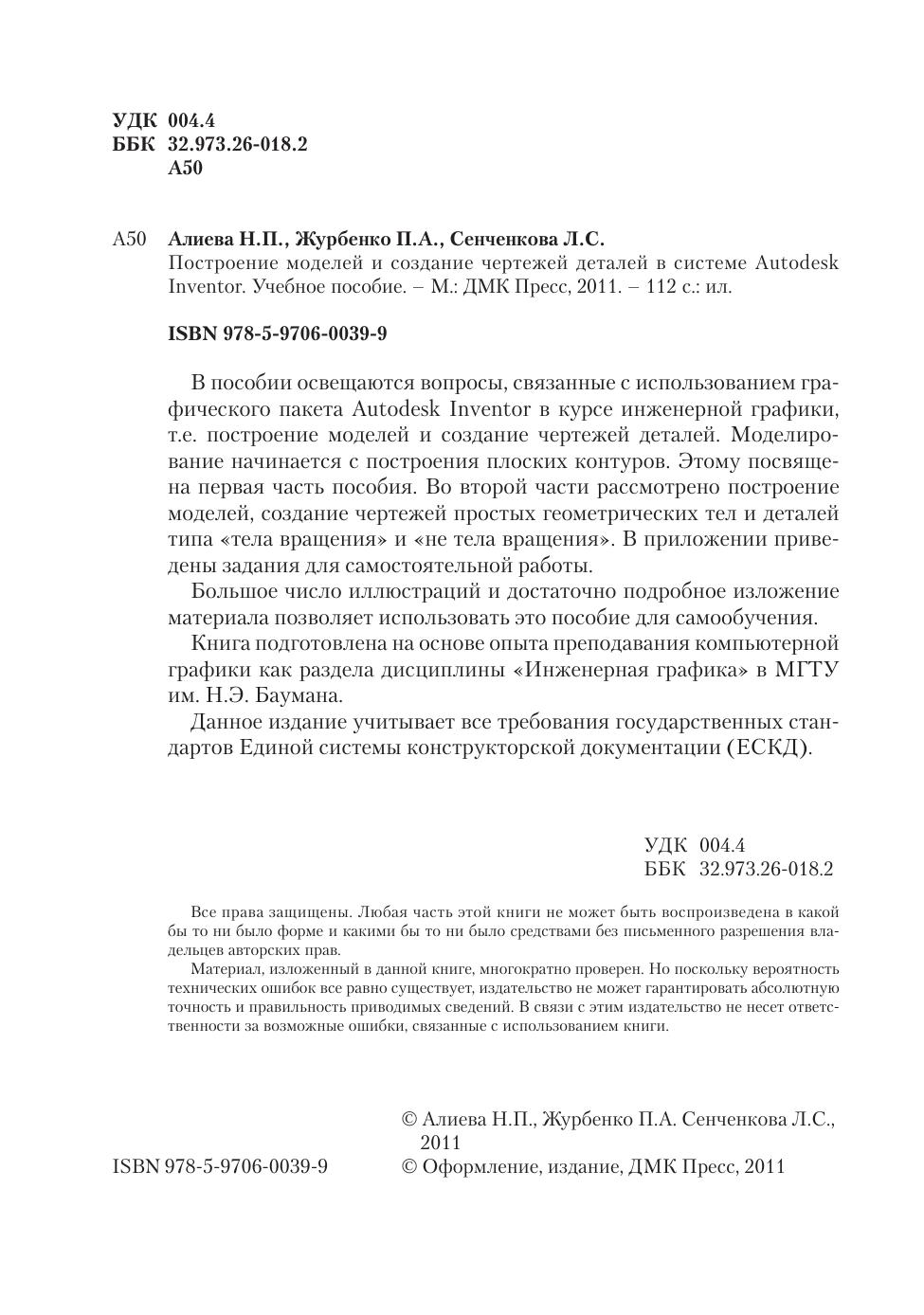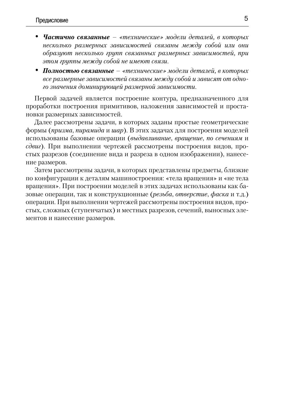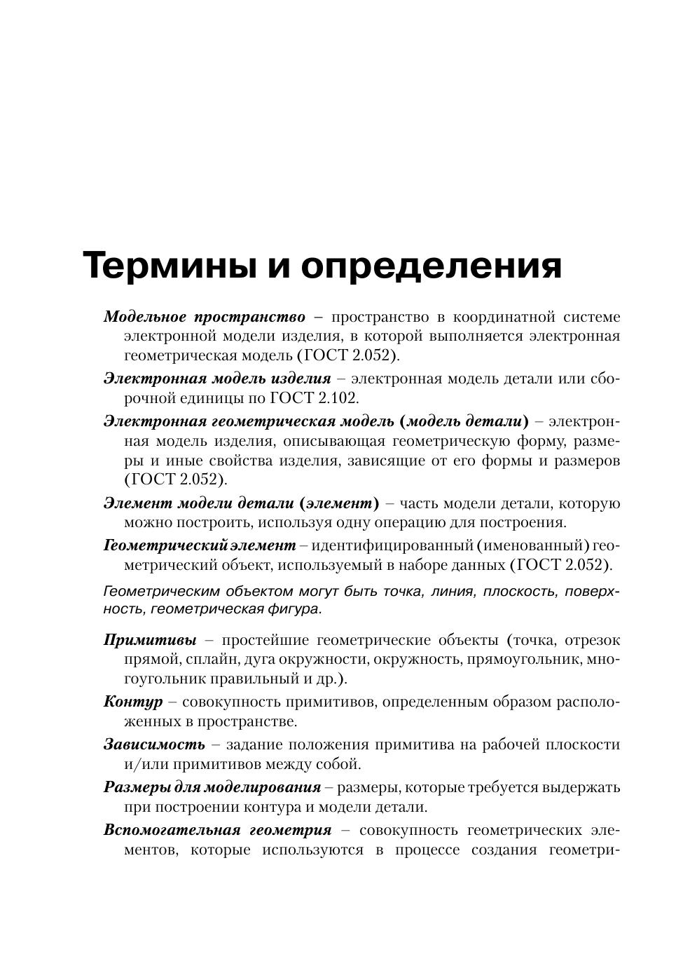 В пособии освещаются вопросы, связанные с использованием графического пакета Autodesk Inventor в курсе инженерной графики, т.е. построение моделей и создание чертежей деталей. Моделирование начинается с построения плоских контуров. Этому посвящена первая часть пособия. Во второй части рассмотрено построение моделей, создание чертежей простых геометрических тел и деталей типа «тела вращения» и «не тела вращения». В приложении приведены задания для самостоятельной работы. Большое число иллюстраций и достаточно подробное изложение материала позволяет использовать это пособие для самообучения. Книга подготовлена на основе опыта преподавания компьютерной графики как раздела дисциплины «Инженерная графика» в МГТУ им. Н.Э. Баумана. Данное издание учитывает все требования государственных стандартов Единой системы конструкторской документации (ЕСКД).