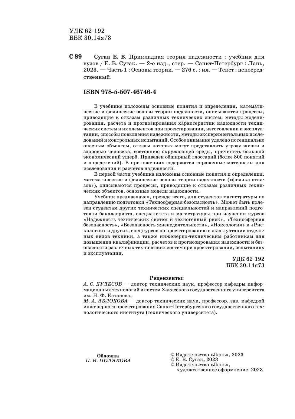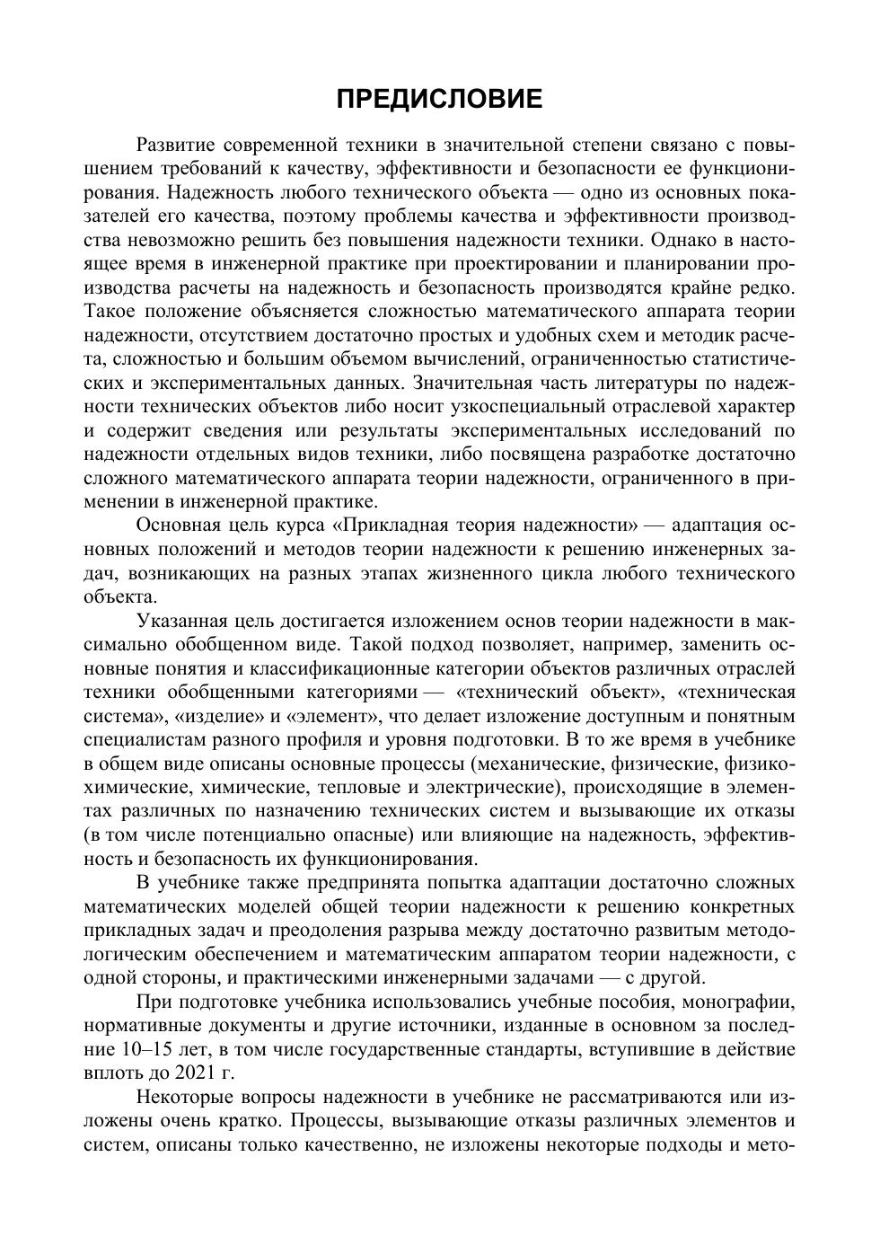В учебнике изложены основные понятия и определения, математи-ческие и физические основы теории надежности, описываются процессы, приводящие к отказам различных технических систем, методы модели-рования, расчета и прогнозирования характеристик надежности техни-ческих систем и их элементов при проектировании, изготовлении и эксплуа-тации, способы повышения надежности, методы экспериментальных иссле-дований и контрольных испытаний. Особое внимание уделено потенциально опасным объектам, отказы которых могут представлять угрозу жизни и здоровью человека, состоянию окружающей среды, большому экономи-ческому ущербу. Приведен обширный глоссарий (более 800 поня-тий и определений). В приложениях содержатся справочные материалы для иссле-дования и расчетов надежности. В первой части учебника изложены основные понятия и определения, математические и физические основы теории надежности («физика отка-зов»), описываются процессы, приводящие к отказам различных техни-ческих объектов, основные модели надежности. Учебник предназначен, прежде всего, для студентов магистратуры по направлению подготовки «Техносферная безопасность». Может быть поле-зен студентам других технических специальностей и направлений подго-товки бакалавриата, специалитета и магистратуры при изучении курсов «Надежность технических систем и техногенный риск», «Техносферная безопасность», «Безопасность жизнедеятельности», «Ноксология» и «Рис-кология» и других, спецкурсов по проектированию и эксплуатации отдель-ных видов техники, а также инженерно-техническим работникам для повышения квалификации, расчетов и прогнозирования надежности и без-опасности различных технических систем при проектировании, испытаниях и эксплуатации.